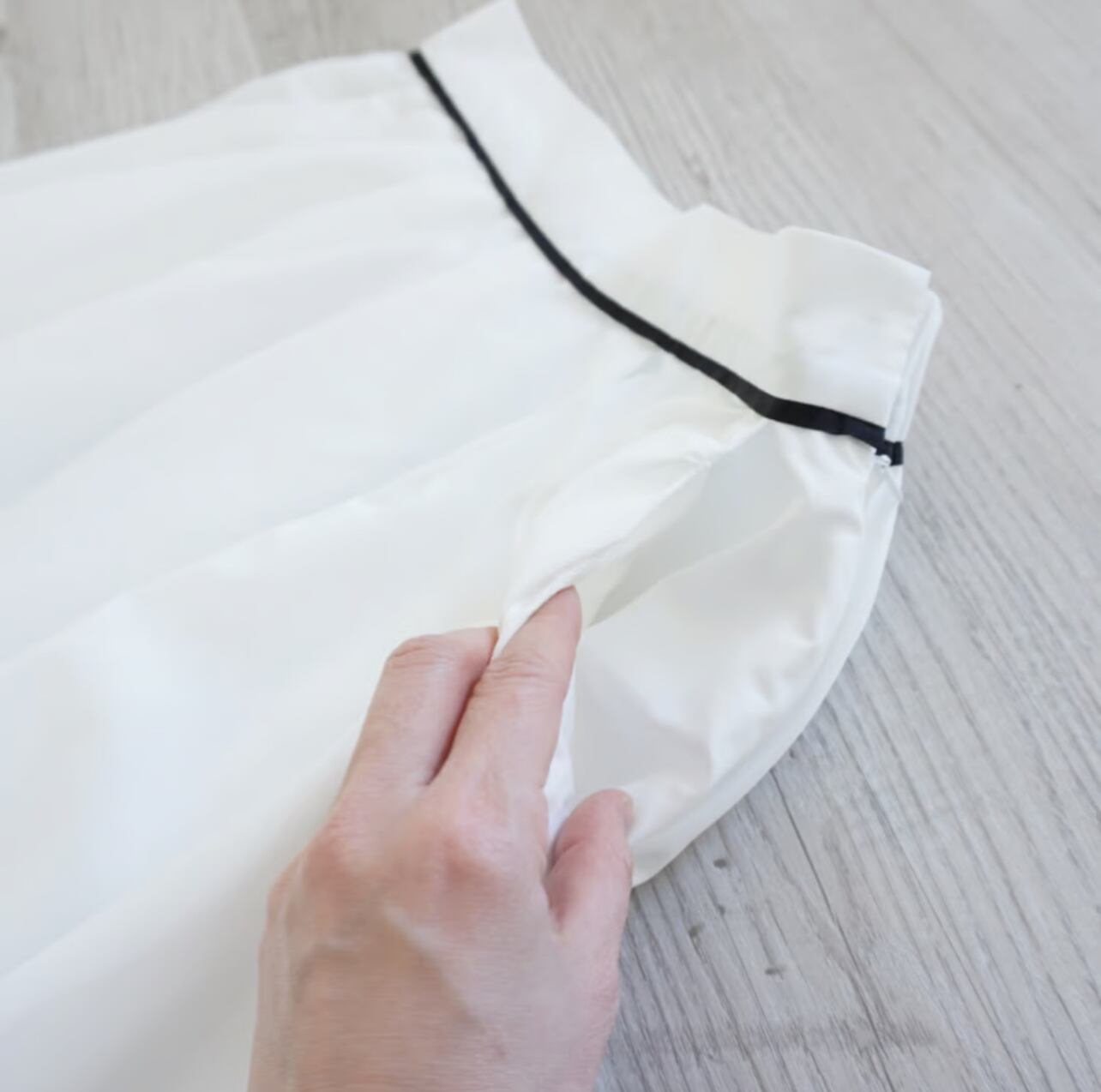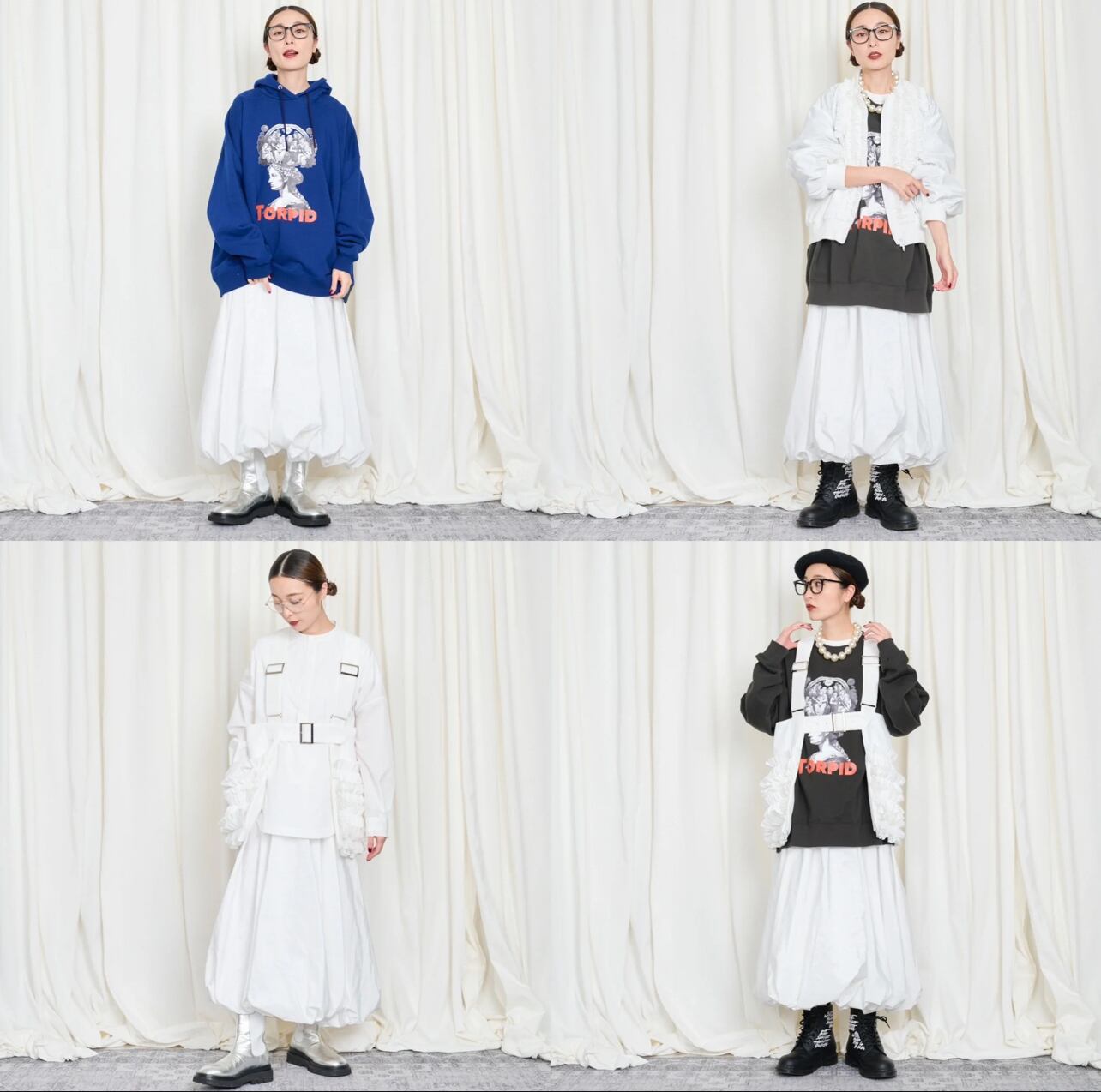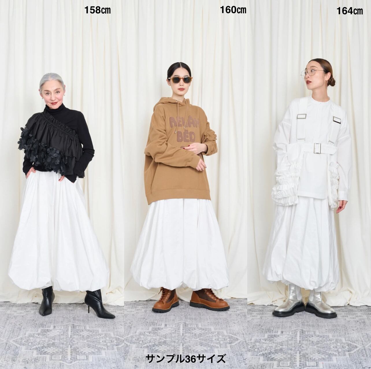 薄手のタフタでボリュームが出過ぎない大人のバルーンスカート。以前もデザインをやってみたものの、あまりバルーンが広がらなかったので今回はメモリータフタの薄手の素材を採用しチャレンジしました。思った以上にイメージ通りにでき、とても使いやすい新アイテムになっています。着用すると、バルーンがパンツのようにも見えて、モードな雰囲気も持っています。たっぷりとしたバルーンでロング。足首が少しだけ見える長さにしています。両サイドポケット付き。シンプルなので合わせやすいと思います。ウエスト部分にラインを入れて少しだけ個性を出しています。お勧めはブラックですが、今回はホワイトをテーマカラーにしているので、ホワイトもお勧めです。ホワイトはとてもルックが作りやすくて、合わせやすく万能でした。もし迷われる方がいたら、ホワイトも検討してみてください。真冬の真っ白スタイル、特にフリルブルゾン、ラッフルドベストとの相性が良くて魅力的に感じています。私はホワイトを購入したいと思っています。