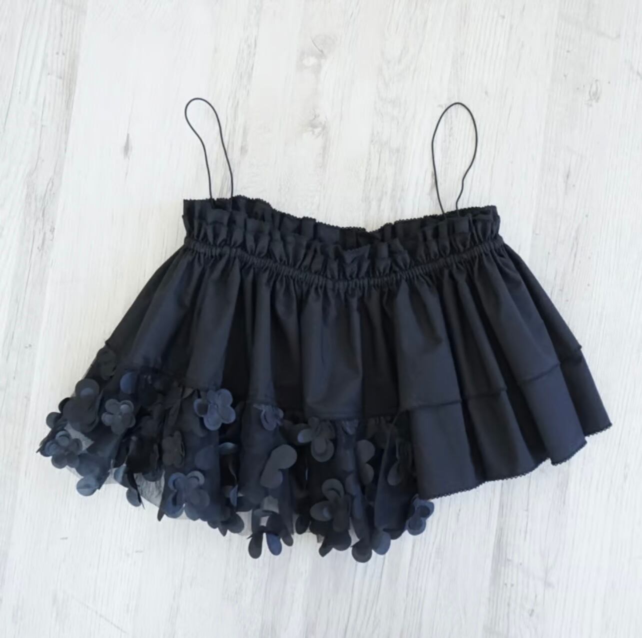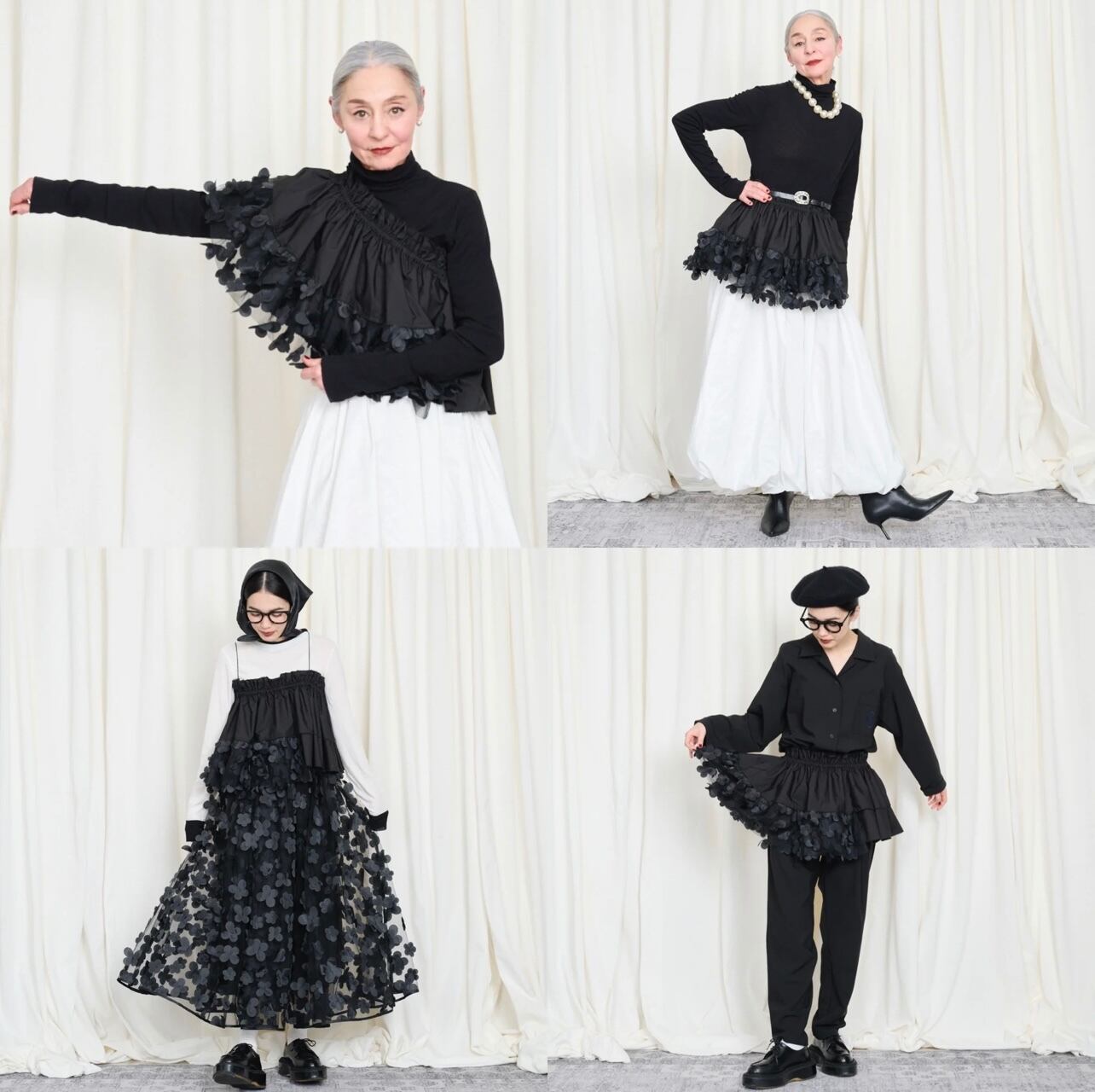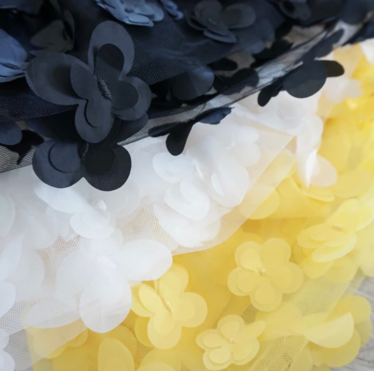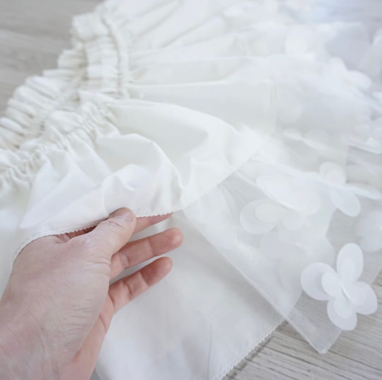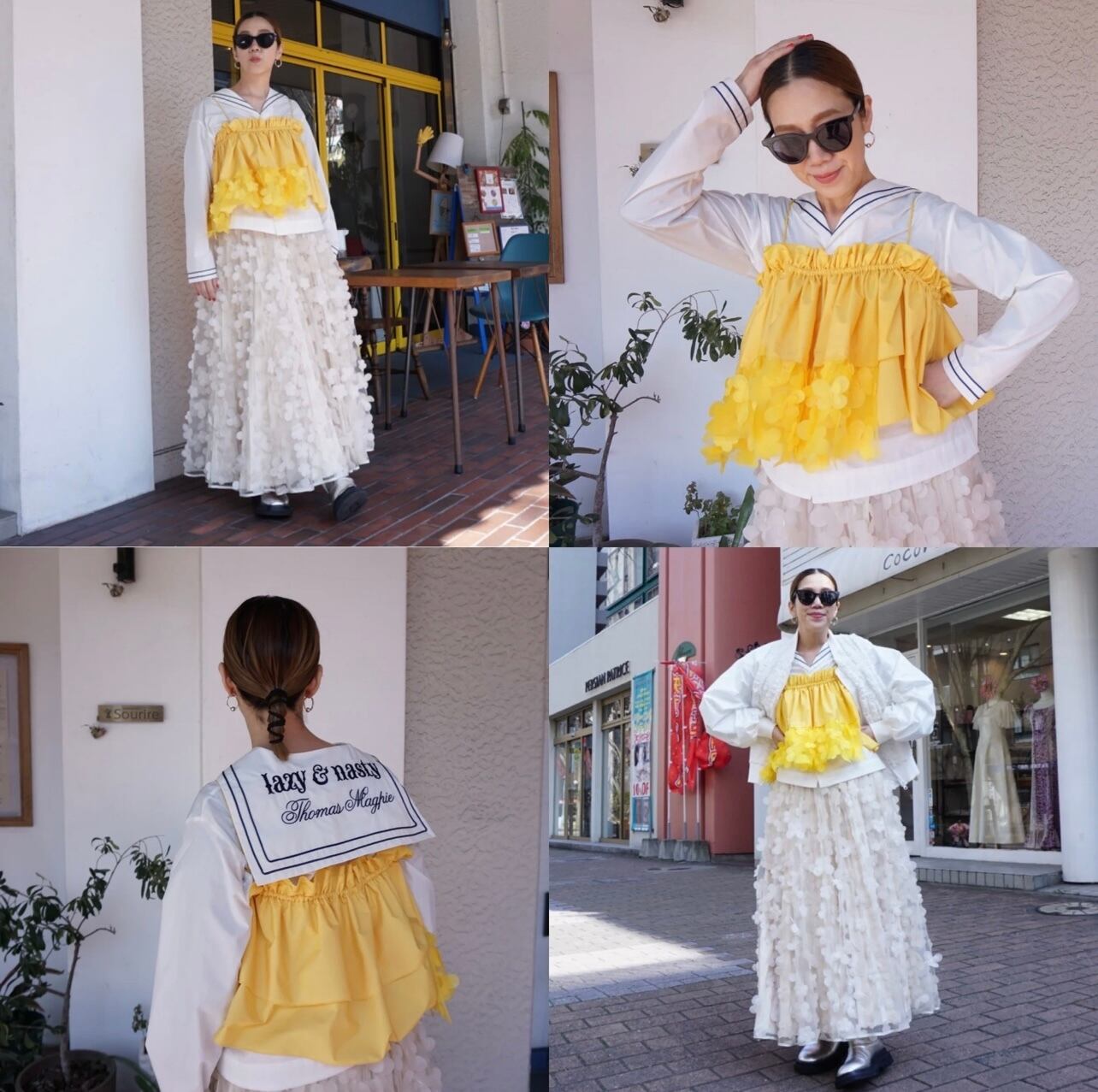 オールシーズン使えて、合わせて楽しくなるアイテムはないかなと、いつも考えています。今回はマルチに使えるビスチェです。ゴムを通しギャザーをたっぷり入れたコットンポリのシャツ素材。ドローストリングの紐が内部に付いていて調節して絞ることができます。肩紐はゴム。細めのゴムを付けています。肩紐は中に入れて着用すれば、ウエストの装飾ベルトにも使う事ができます。また斜めにワンショルダーにすれば、また少し変化のあるドレッシーな雰囲気が作れます。コットン部分は段違いに2枚に重なっています。その半分の部分に3Dフラワーのチュールを輪にして取り付けて、ランダムな印象に仕上げています。納品は秋冬の立ち上がりシーズン。ですが、昨今、この時期はまだ夏の猛暑を引きずっているので、何かプラスワンアイテムで半袖のTシャツの上に重ねて気分転換出来ないものかと考えていました。色々なお洋服のルックに合わせて楽しんでください。私は、ホワイトとイエローを検討中です。イエローはとても気になるカラー。ちょっと華やかに楽しくなるカラーではないかと思います。このアイテムはデザインもイメージ通りにできていて、使い勝手、バリエーションも豊か、とてもお勧めです。