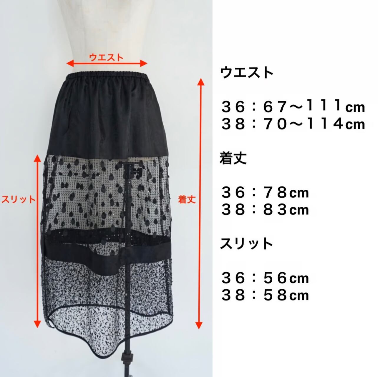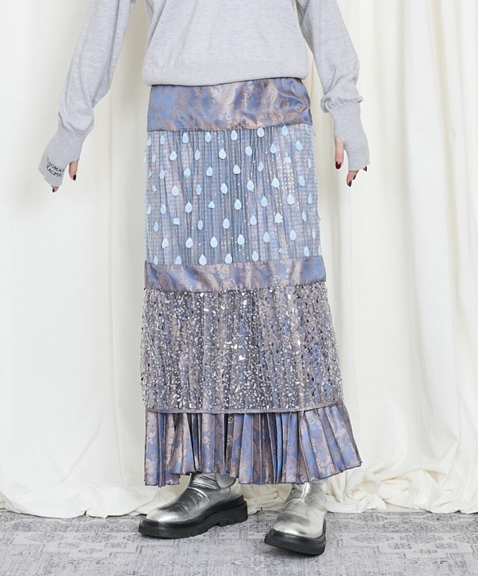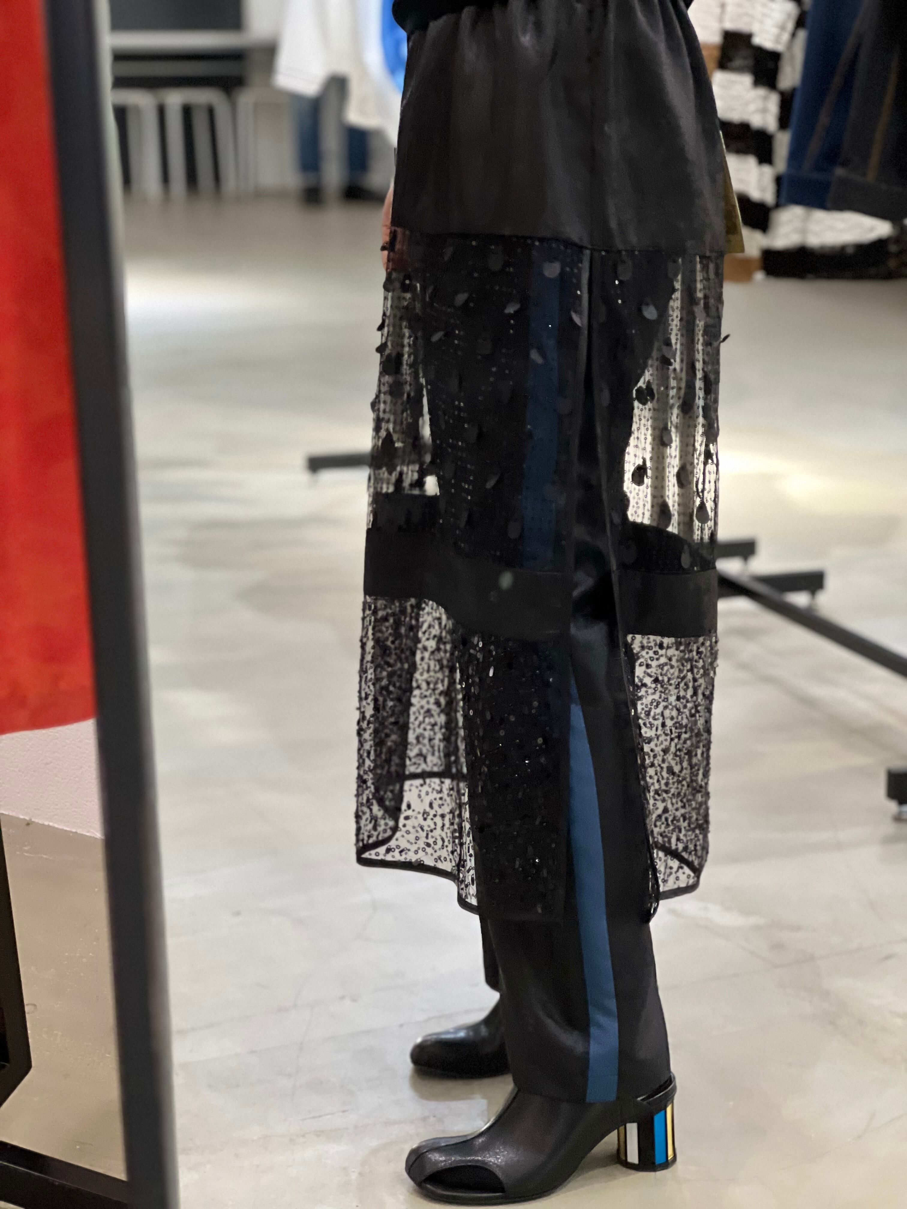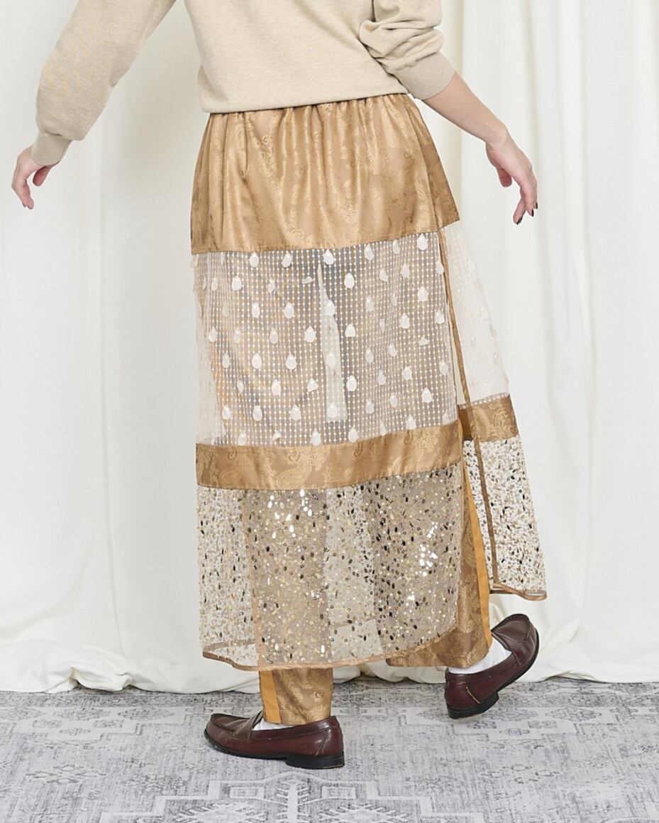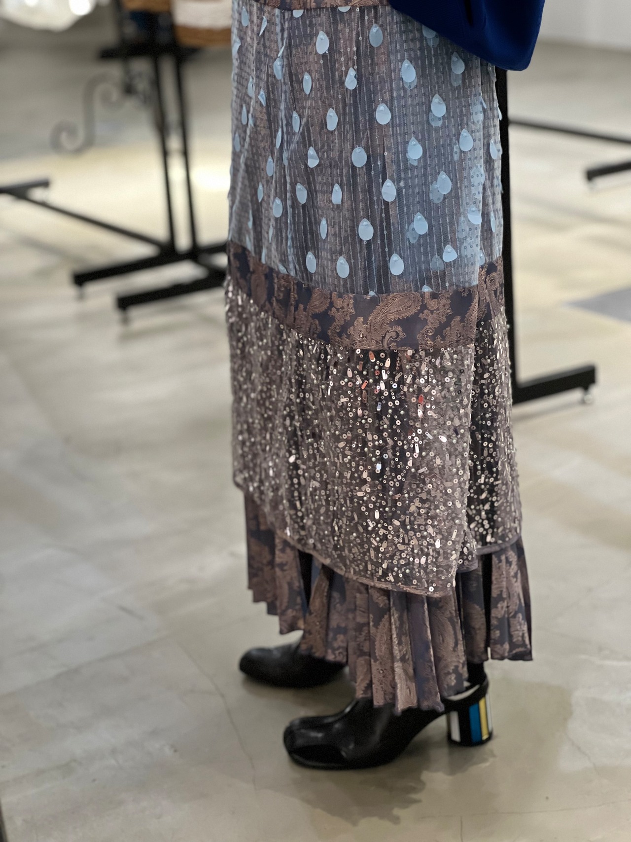 薄手のジャガードペイズリー柄と3Dの雨粒のような立体感のあるデコレーション生地、スパンコール素材の異素材をミックスさせたチュール系のオーバースカートです。今回はスリットを深く入れ、重ね履き用としてデザインしています。ですので、インナーは付きません。透け感があるので中にスカートやパンツを合わせて着てください。お勧めは同時に予約販売している同素材のプリーツスカート、またはパンツが好相性です。特にスカパンスタイルは透け感を楽しみながら作れるので色んなパンツに合わせてもらえたら嬉しいなと思います。これまでにもレースやチュールなどシアー素材のスカートは作ってきましたが、今回は異素材同士の組み合わせが魅力です。またラップスカートっぽく見える深めのサイドスリットがとても新鮮に思えました。これまで作ってきた中で1番上質感のあるオーバースカートではないかと思います。