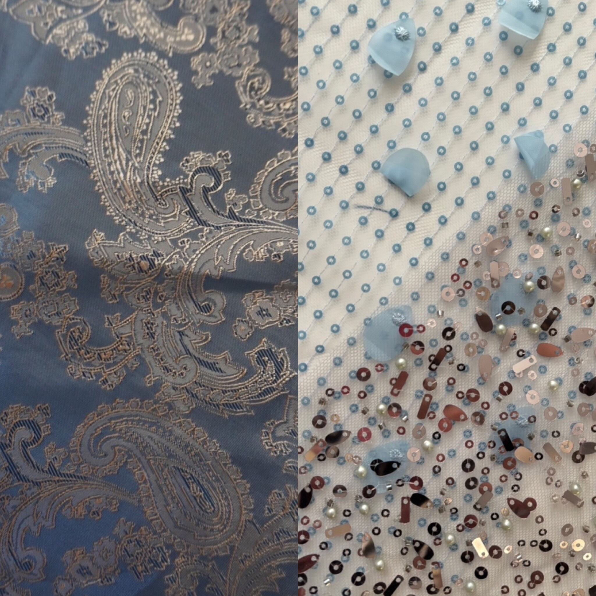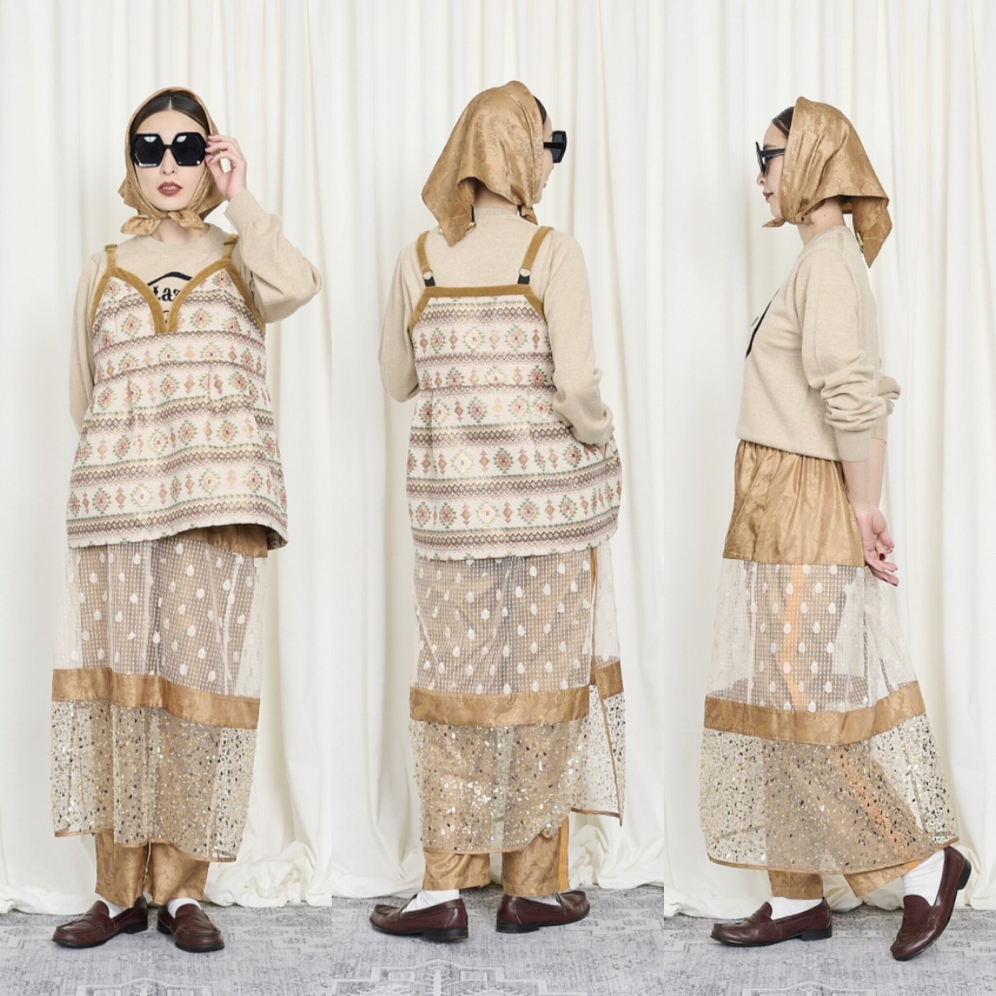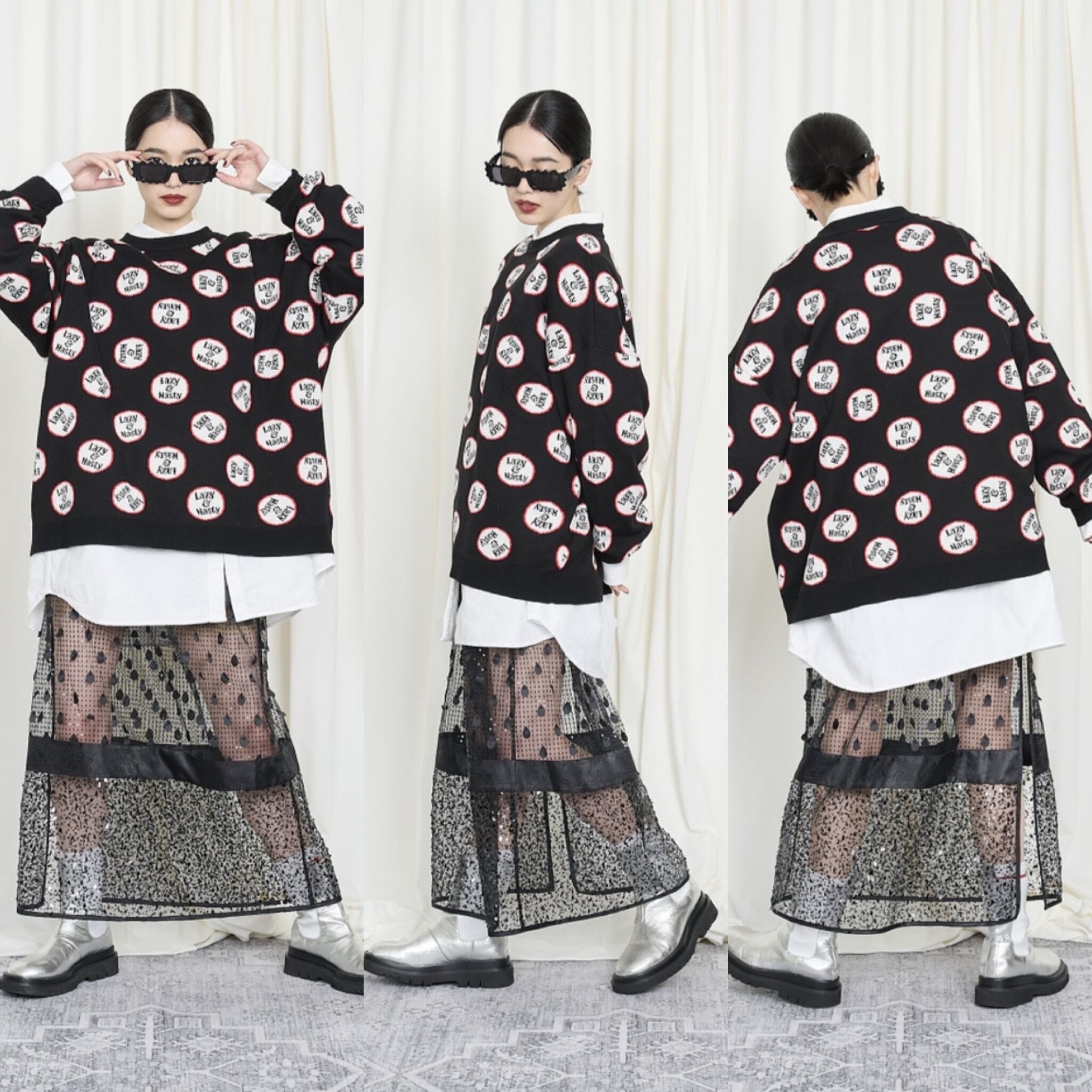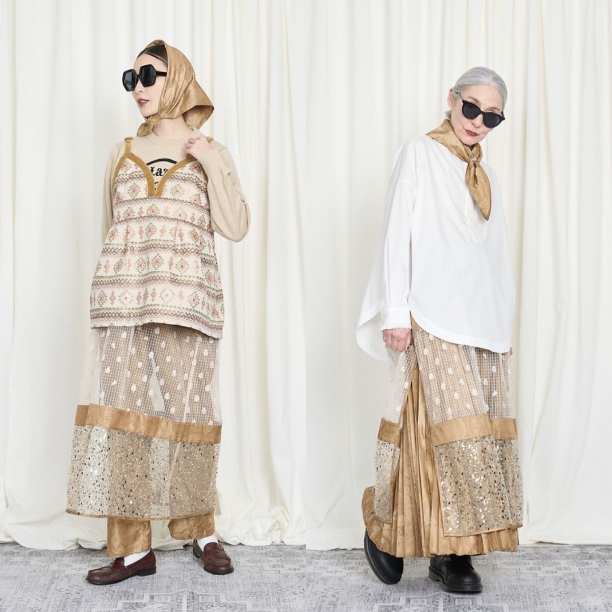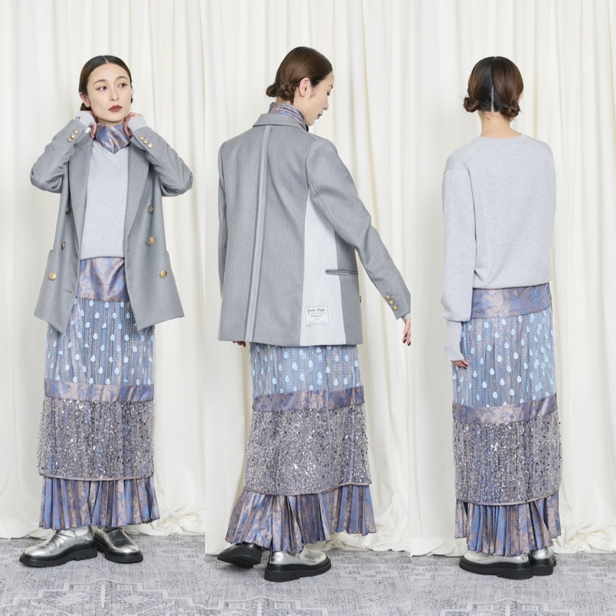 薄手のジャガードペイズリー柄と3Dの雨粒のような立体感のあるデコレーション生地、スパンコール素材の異素材をミックスさせたチュール系のオーバースカートです。今回はスリットを深く入れ、重ね履き用としてデザインしています。ですので、インナーは付きません。透け感があるので中にスカートやパンツを合わせて着てください。お勧めは同時に予約販売している同素材のプリーツスカート、またはパンツが好相性です。特にスカパンスタイルは透け感を楽しみながら作れるので色んなパンツに合わせてもらえたら嬉しいなと思います。これまでにもレースやチュールなどシアー素材のスカートは作ってきましたが、今回は異素材同士の組み合わせが魅力です。またラップスカートっぽく見える深めのサイドスリットがとても新鮮に思えました。これまで作ってきた中で1番上質感のあるオーバースカートではないかと思います。