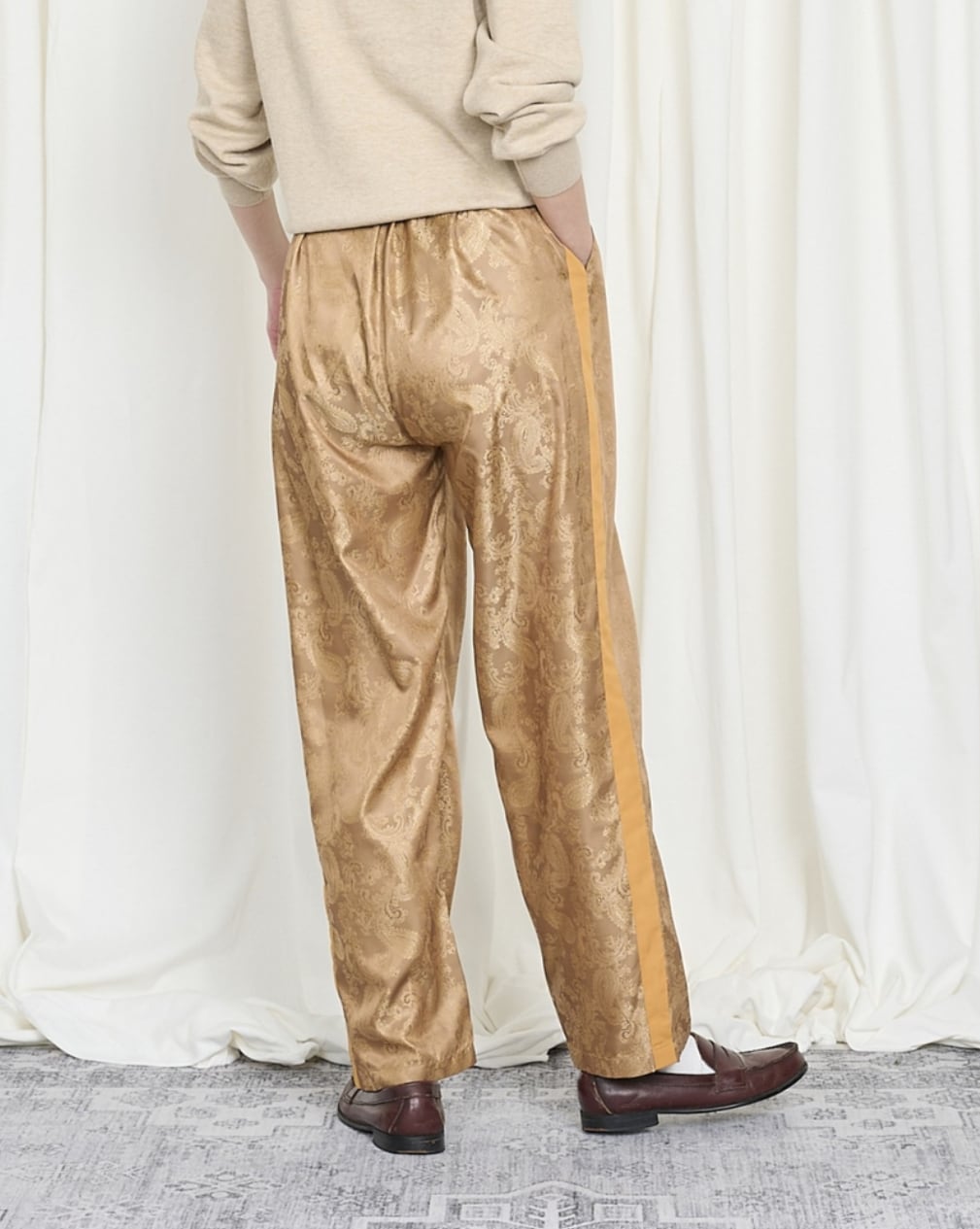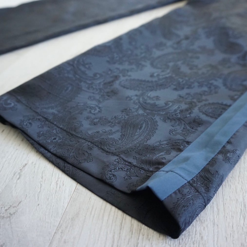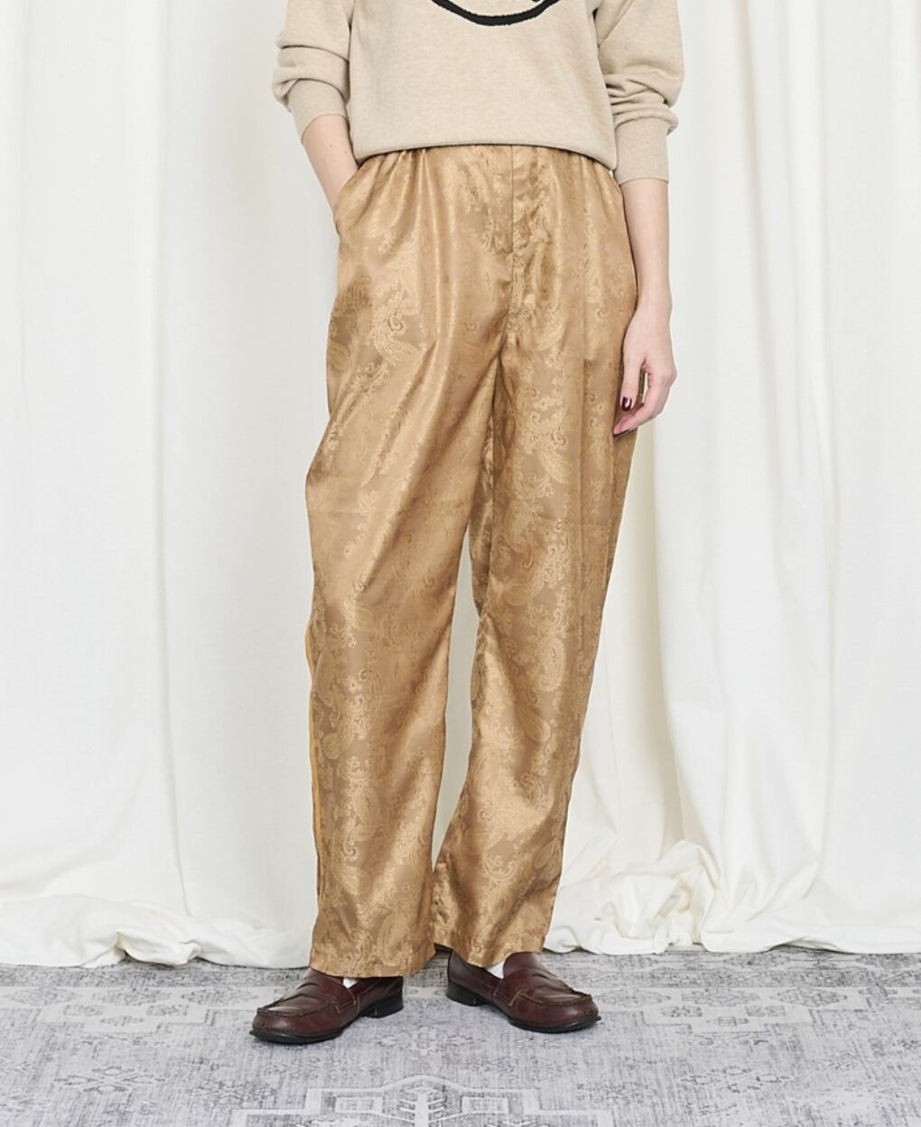 ペイズリー柄の軽いタッチのポリエステルジャガードのイージーパンツ。サイドにライン入りで、ストレートではなく緩やかにテーパードしている脚長効果抜群のシルエットです。サイズはかなり大きめになっています。艶やかなジャガード織りでペイズリー柄を表現していて高級感があります。光沢がある美しい素材。ペイズリー柄が、近づくと織りになっているのが分かります。