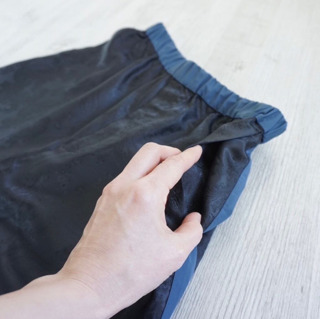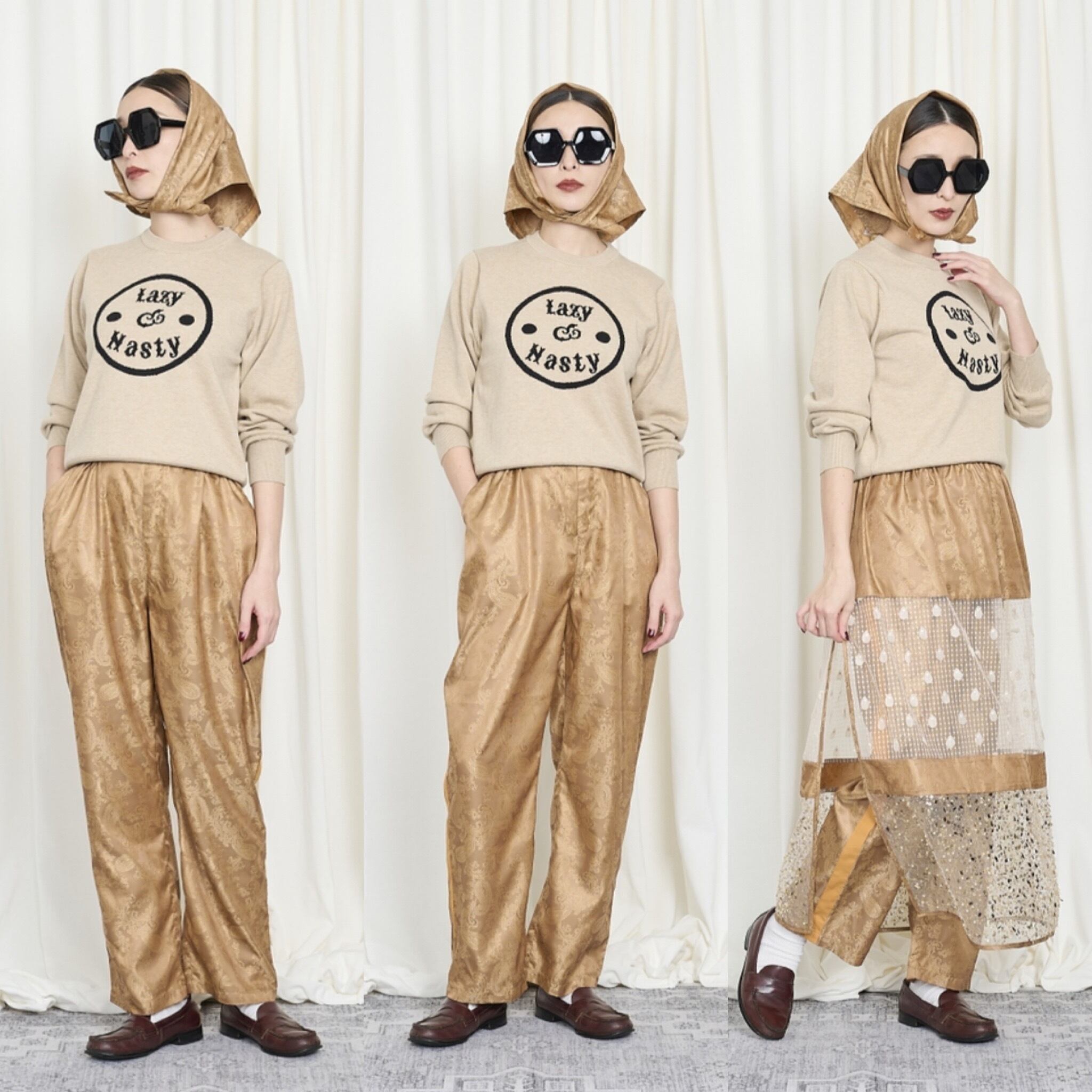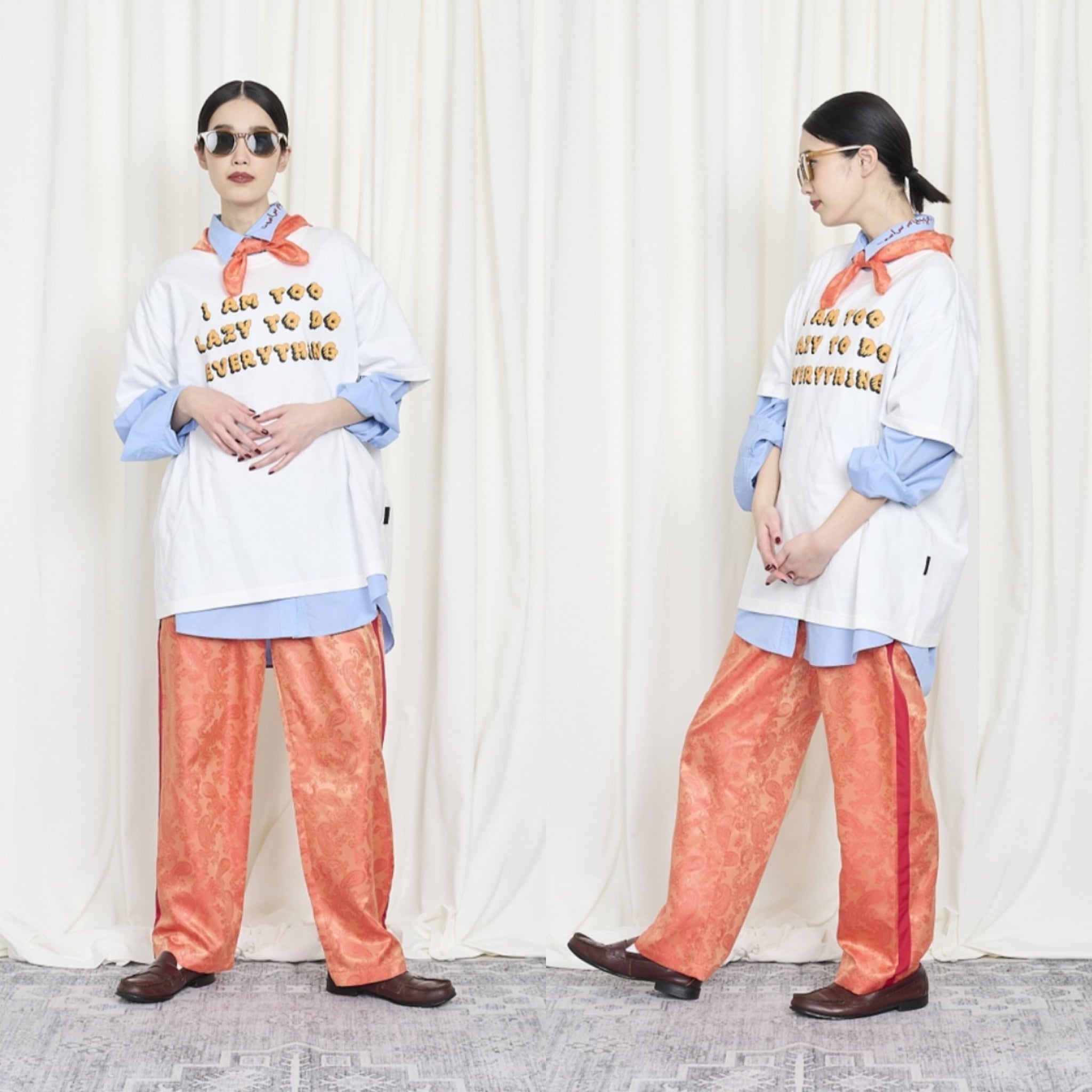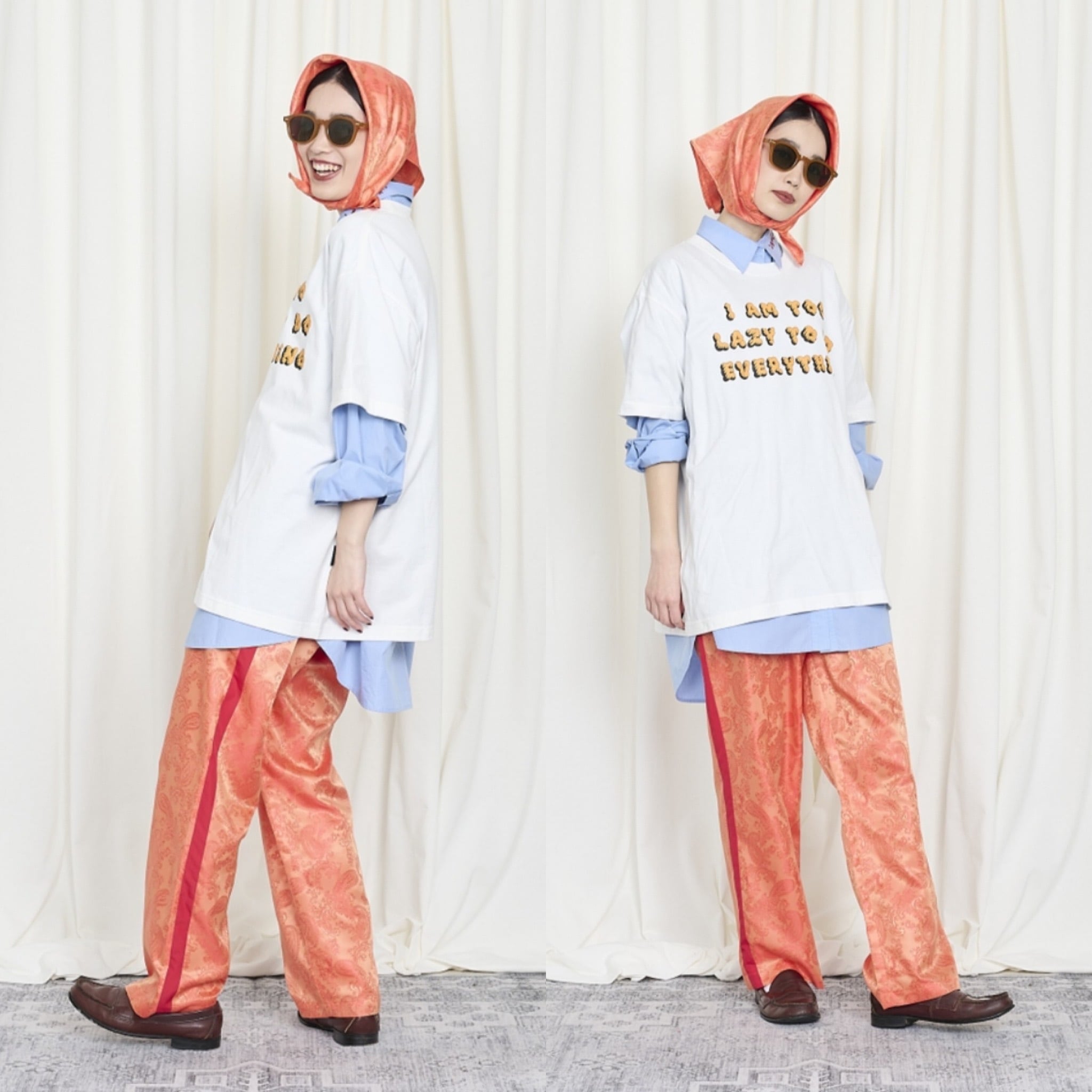 ペイズリー柄の軽いタッチのポリエステルジャガードのイージーパンツ。サイドにライン入りで、ストレートではなく緩やかにテーパードしている脚長効果抜群のシルエットです。サイズはかなり大きめになっています。艶やかなジャガード織りでペイズリー柄を表現していて高級感があります。光沢がある美しい素材。ペイズリー柄が、近づくと織りになっているのが分かります。