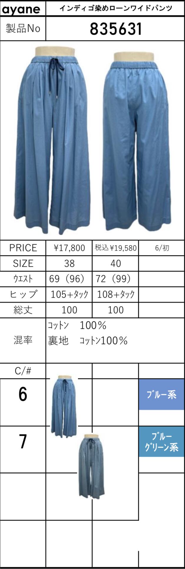 予約販売【 ayane 】インディゴ染めローンワイドパンツ (835631) 5月下旬お届け