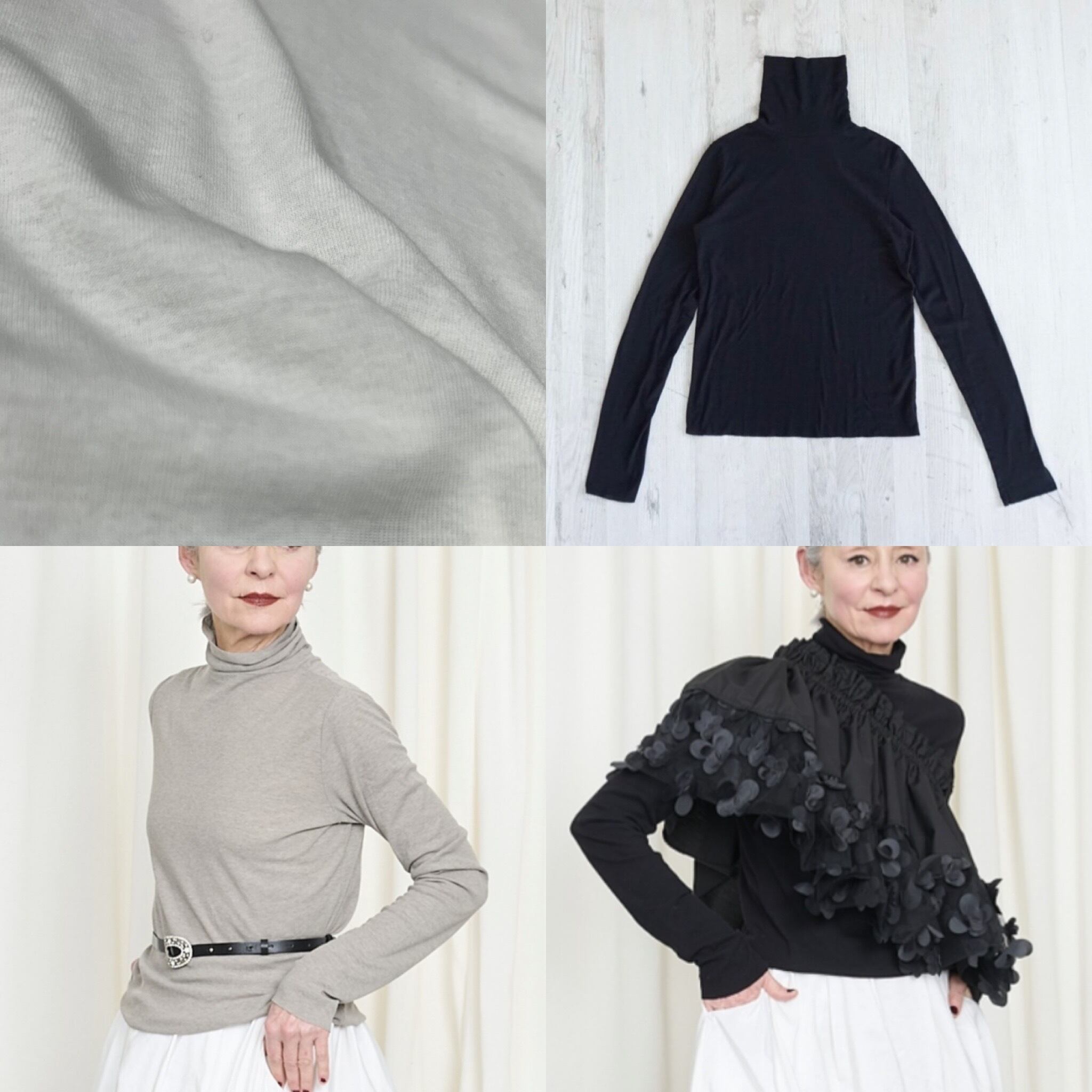 以前も出している超人気のコットン素材のシンプルカットソー。今回はタートルネックをデザインしました。ぱっと見は全くプレーンなタートルカットソーですが、この素材の良さは計り知れないくらいの満足度があります。100%コットンですが、ものすごいストレッチが効いていて、着ているのを忘れるくらいノンストレスです。柔らかく、とても細い糸で編んでいます。肌に触れているか分からないくらいの気持ちいいタッチで、肌触りがとてもよく伸びがあるので着心地が良いのが人気の秘密です。今回はタートルにしてリリースします。袖は長めになっています。高身長の方にもとてもお勧めです。秋冬のウールの下に着ると重宝するかなと思いました。小さく見えて、かなり大きめのパターンになっていますが、着ると痩せ形の方もよく馴染む形になっています。ふっくらした方から、痩せ形の方まで、大きくカバーリングするパターンがよく出来ています。年間を通して心地よいインナーをお探しの方に、とてもお勧めのタートルです。一度着てしまうと病みつきになる心地よさです。