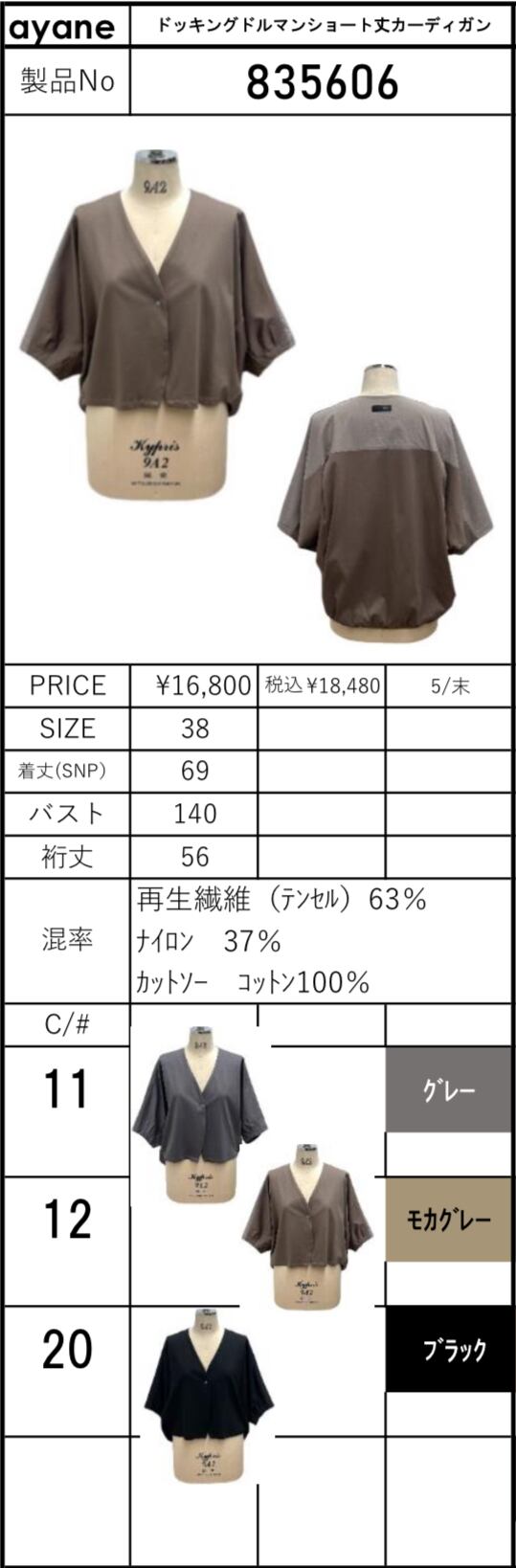 予約販売【 ayane 】ドッキングドルマンショート丈カーディガン (835606) 5月下旬お届け