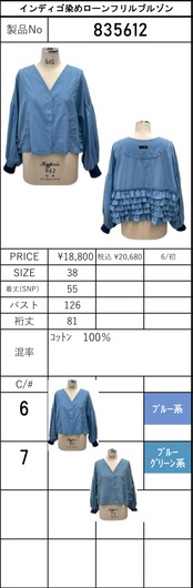予約販売【 ayane 】インディゴ染めローンフリルブルゾン (835612) 6月中旬お届け