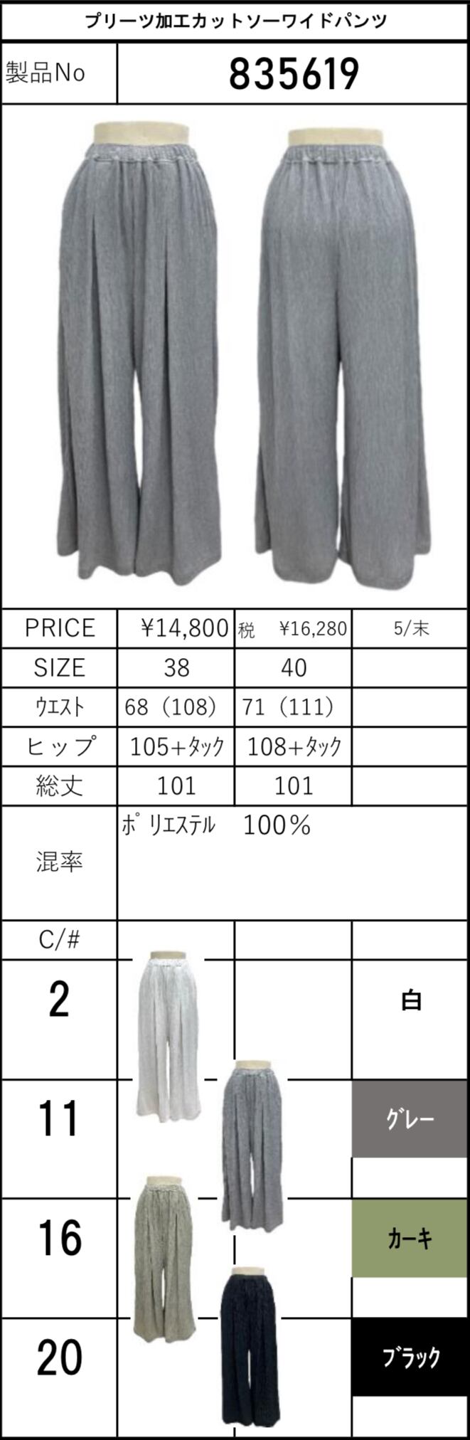 color No.2白/No.11グレー/No.16カーキ/No.20ブラック