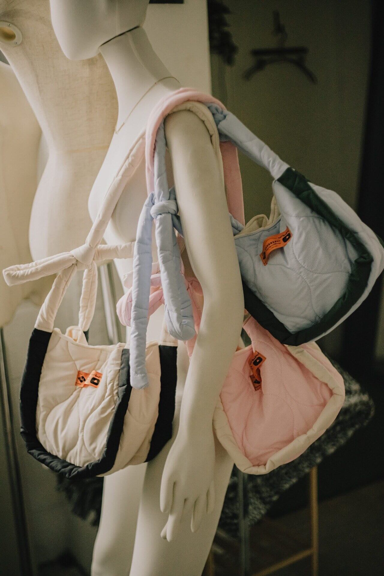 程よいボリューム感と、柔らかなフォルムがコーディネートに抜け感をプラスします。 持ち手部分は自由に取り外せて結び目をアクセントに調節可能です。
