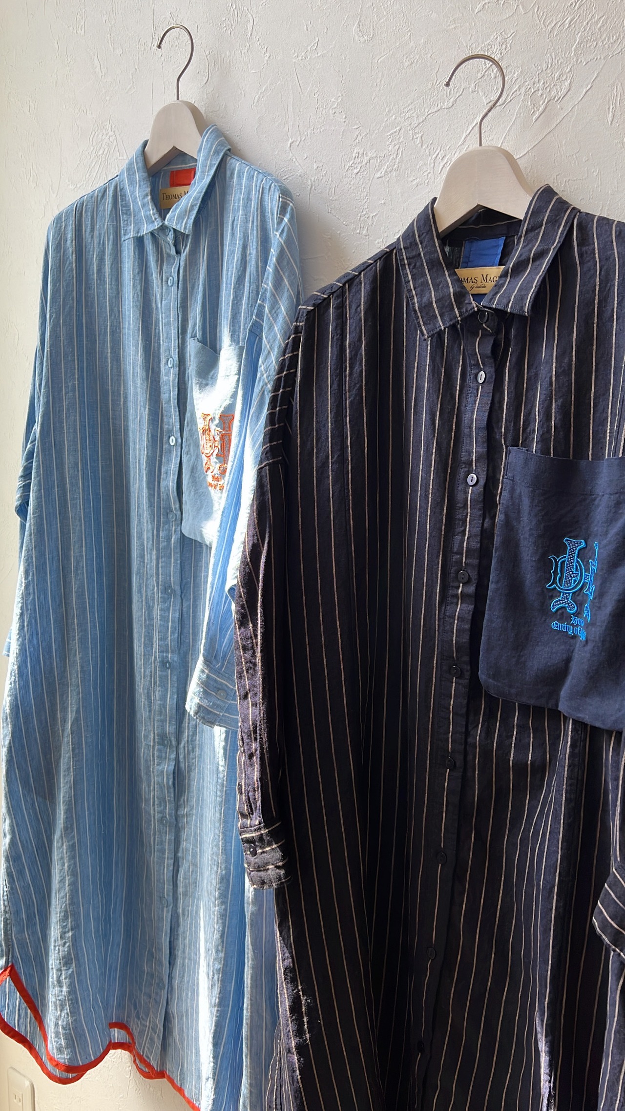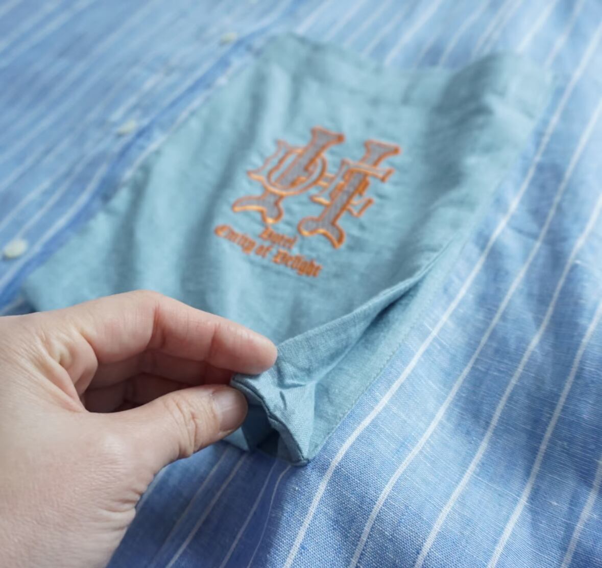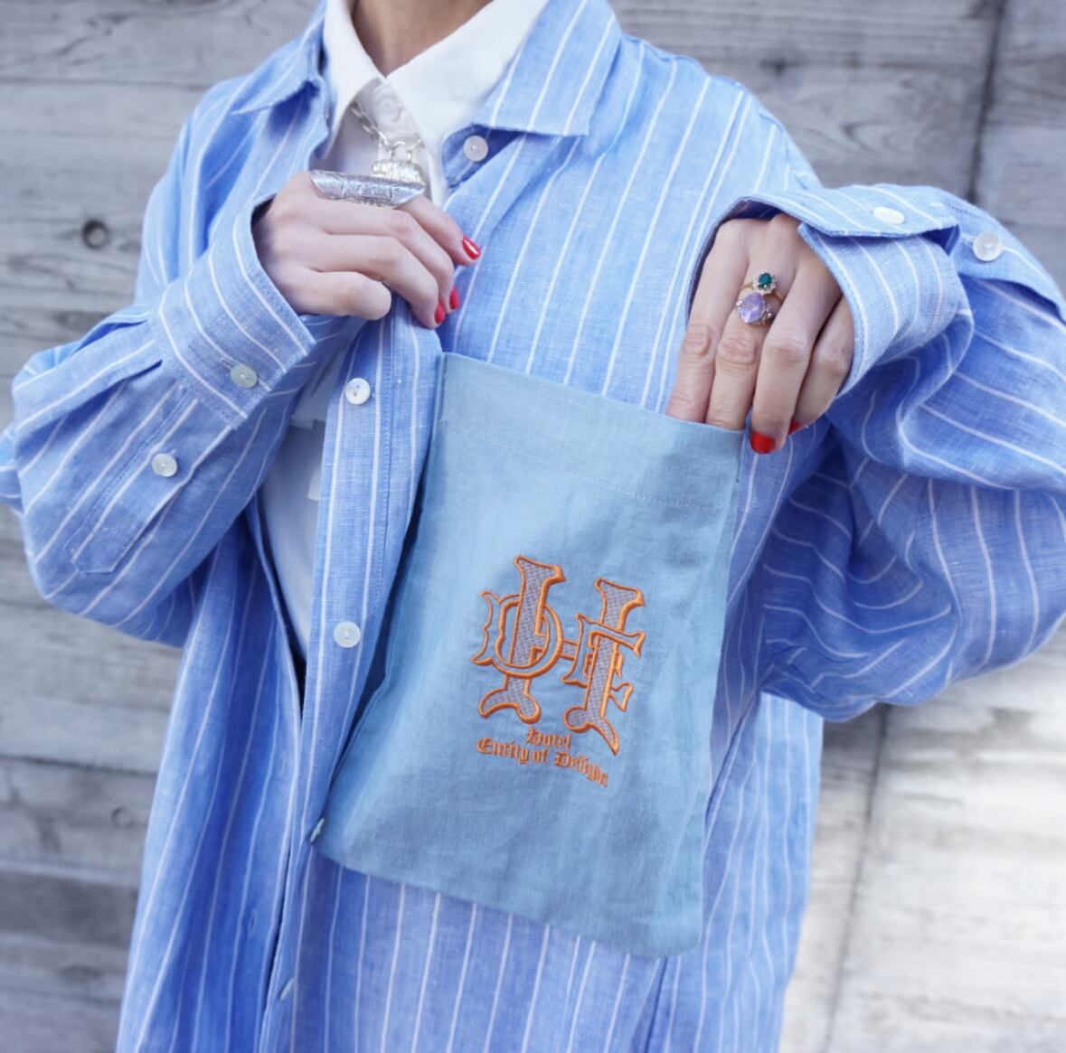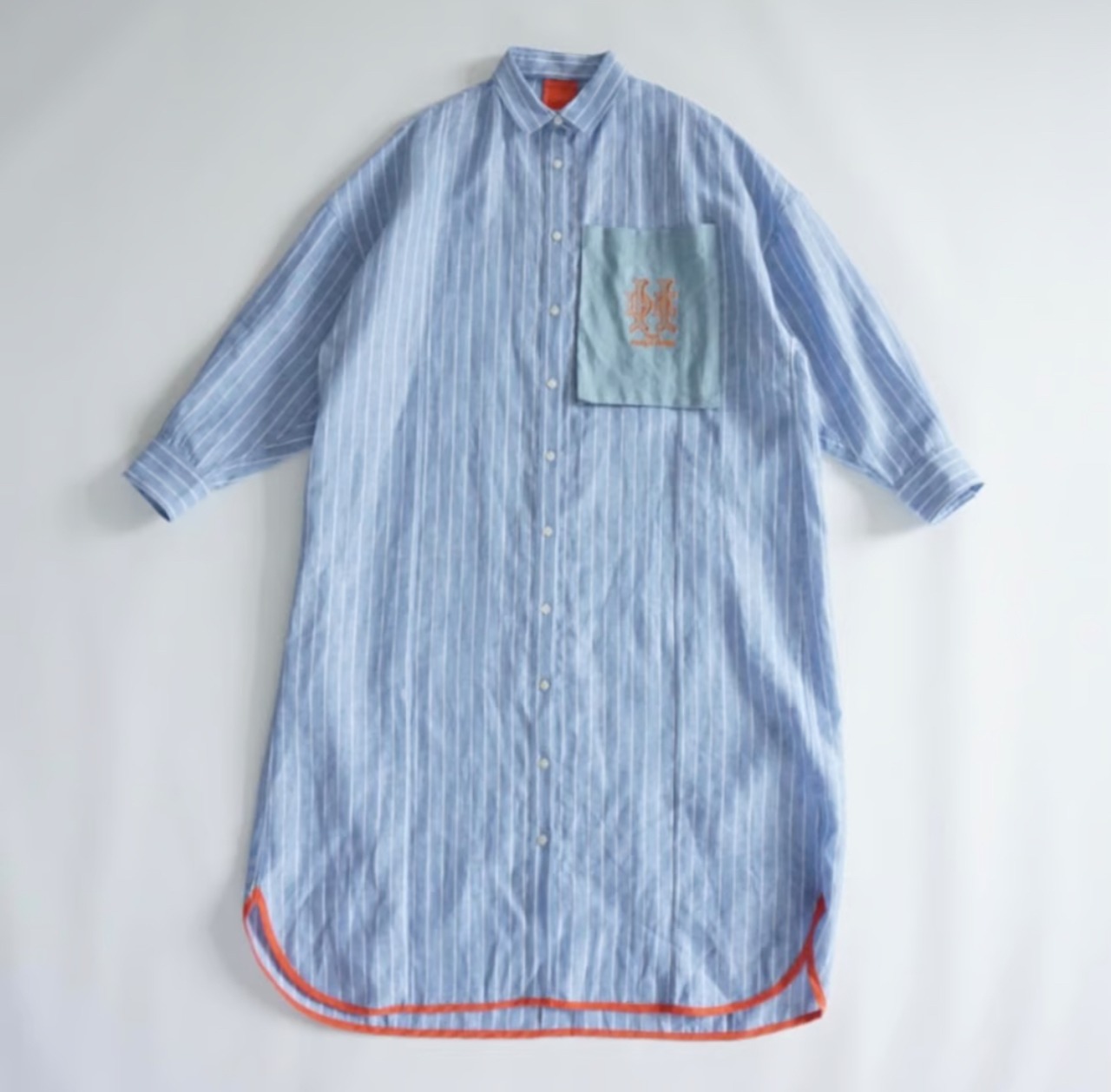 100%リネンのシャリっとしたロングシャツワンピース。パジャマのような雰囲気の羽織としてコート風にも使えます。今回はホテルがテーマなので、胸に刺繍を入れて、ホテルのパジャマのイメージでオーバーサイズのロングシャツをデザインしています。普通のデザインでは面白くないので、反対色のオレンジをパイピング、そして胸のポケットはオレンジの刺繍糸にしてみました。ブルーにオレンジのカラー対比が気に入っています。ポケットは胸にビッグポケット。この部分は単色のリネンに素材を替えてみました。大きめの刺繍にはEDHでマークを作りました。この意味はENTITY OF DELIGHT HOTEL ホテル(で過ごす)喜びの実体、という意味です。ホテルの楽しみ方は様々ですが、私自身がホテルで楽しく過ごすことに重きを置いているので、このロゴを作ってみました。クラシックなロゴマークが刺繍になっているのがポイントになっていてとても好きです。