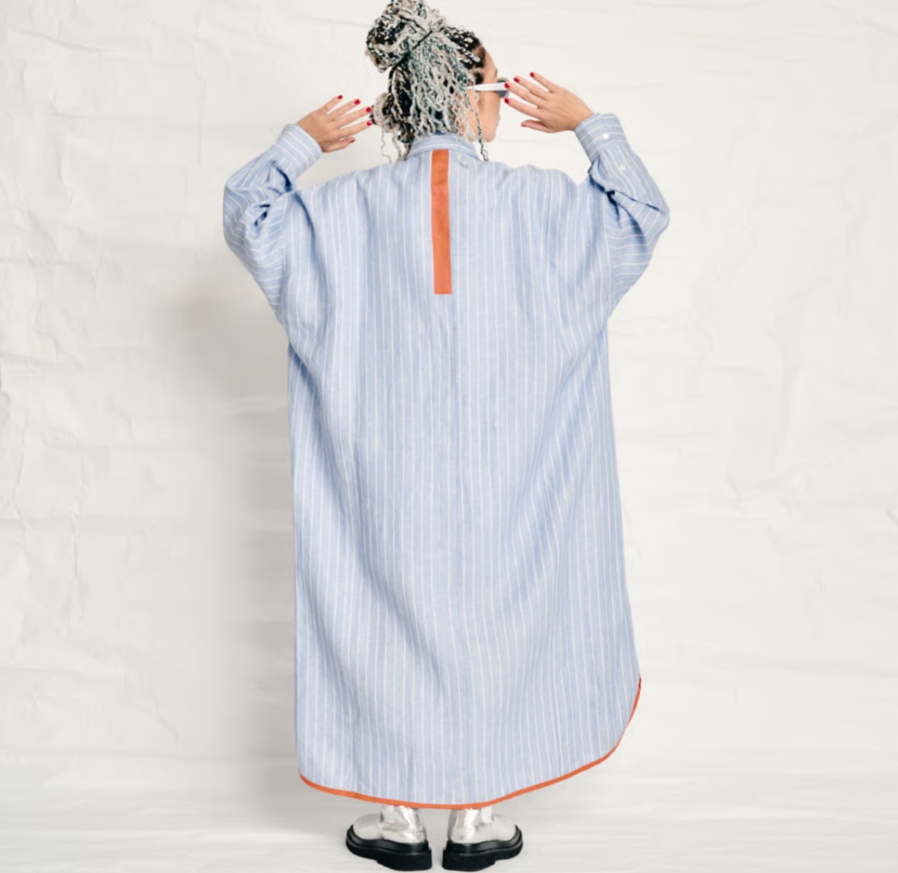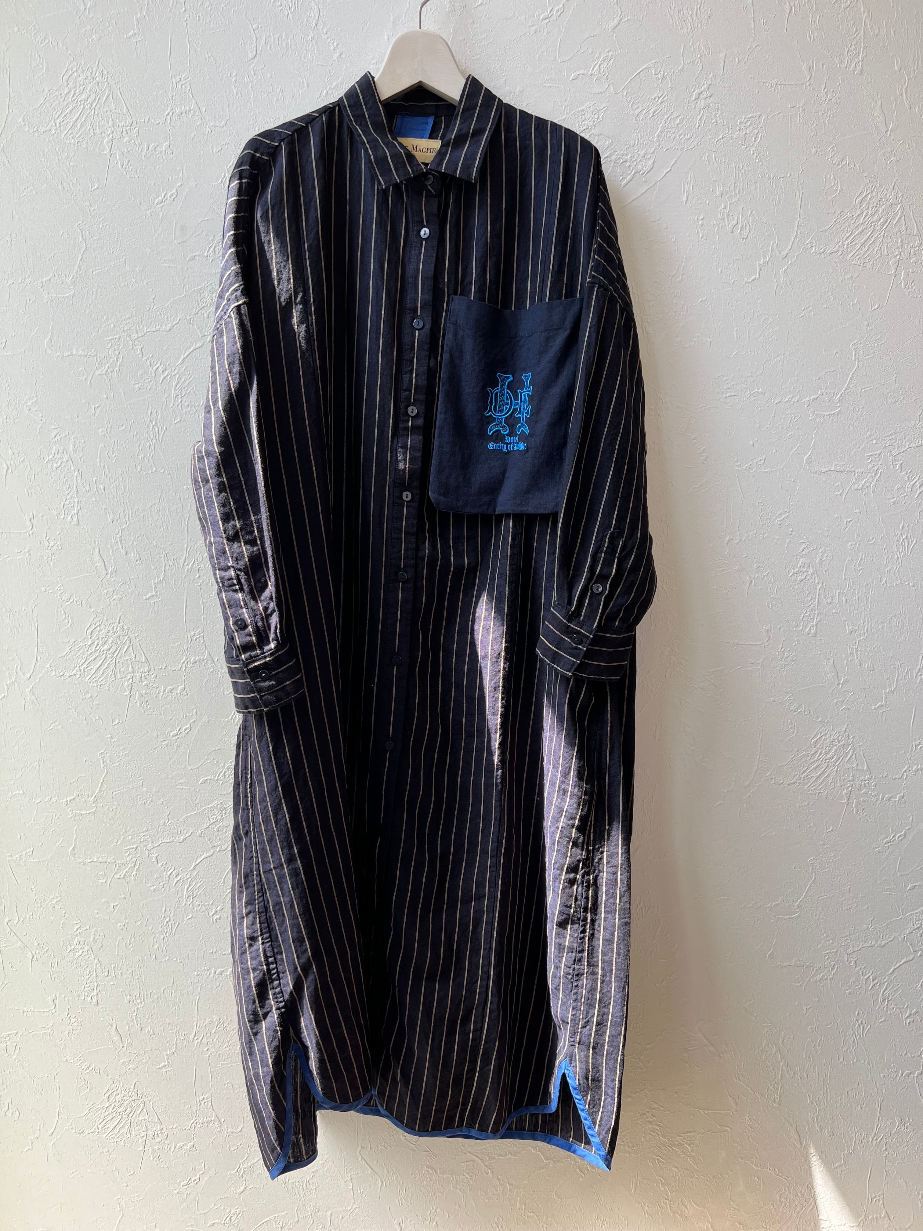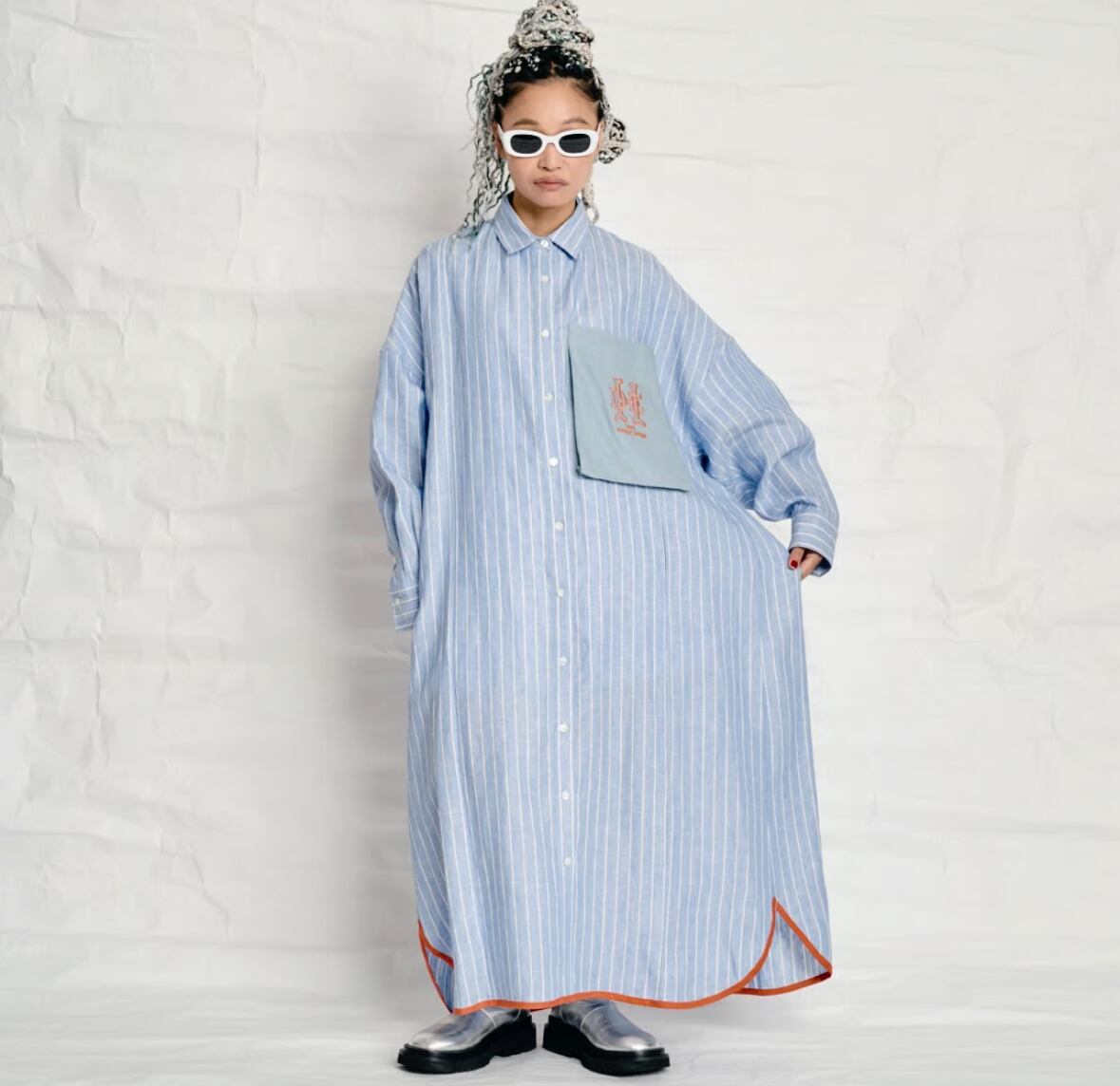 100%リネンのシャリっとしたロングシャツワンピース。パジャマのような雰囲気の羽織としてコート風にも使えます。今回はホテルがテーマなので、胸に刺繍を入れて、ホテルのパジャマのイメージでオーバーサイズのロングシャツをデザインしています。普通のデザインでは面白くないので、反対色のオレンジをパイピング、そして胸のポケットはオレンジの刺繍糸にしてみました。ブルーにオレンジのカラー対比が気に入っています。ポケットは胸にビッグポケット。この部分は単色のリネンに素材を替えてみました。大きめの刺繍にはEDHでマークを作りました。この意味はENTITY OF DELIGHT HOTEL ホテル(で過ごす)喜びの実体、という意味です。ホテルの楽しみ方は様々ですが、私自身がホテルで楽しく過ごすことに重きを置いているので、このロゴを作ってみました。クラシックなロゴマークが刺繍になっているのがポイントになっていてとても好きです。
