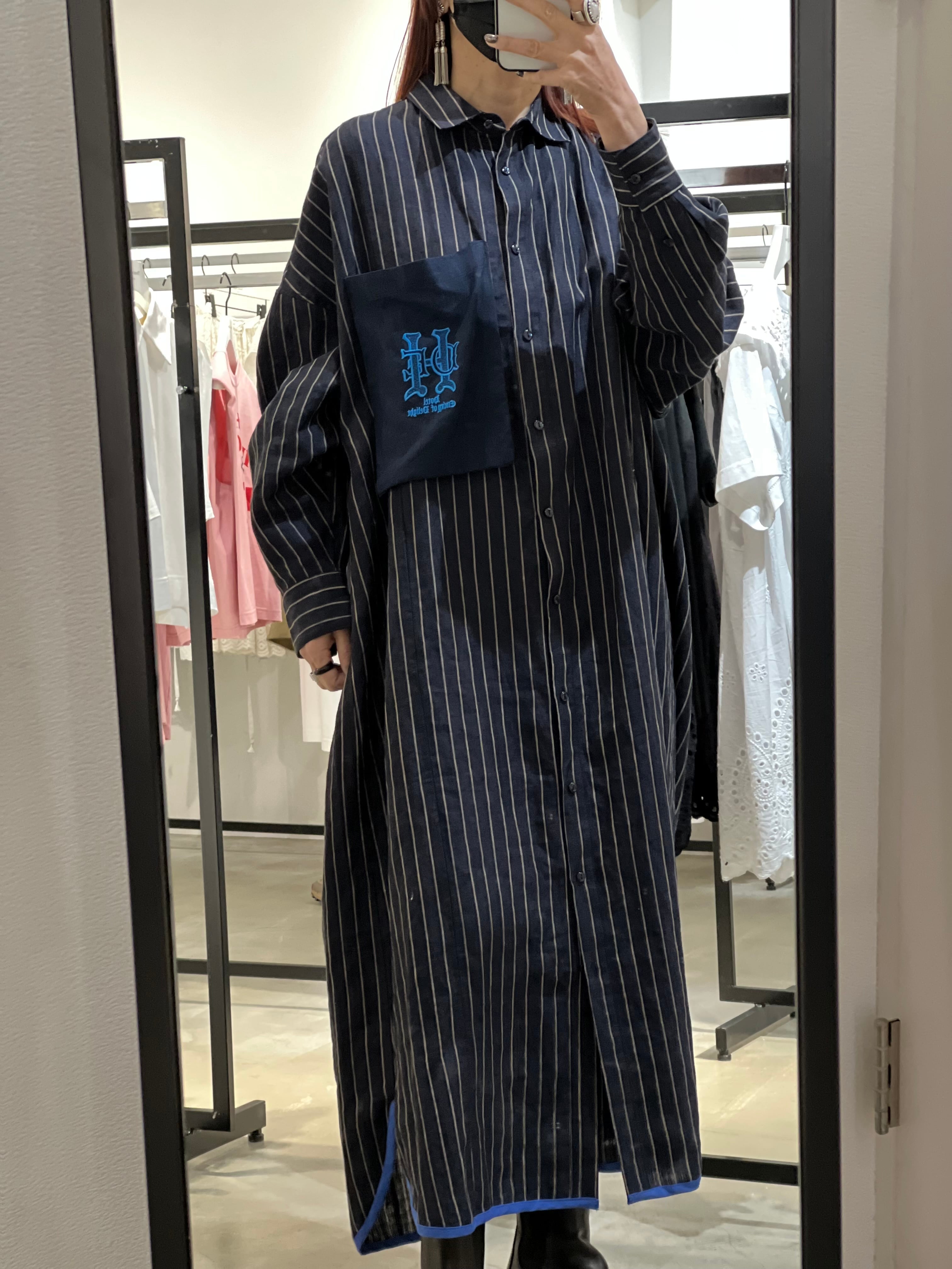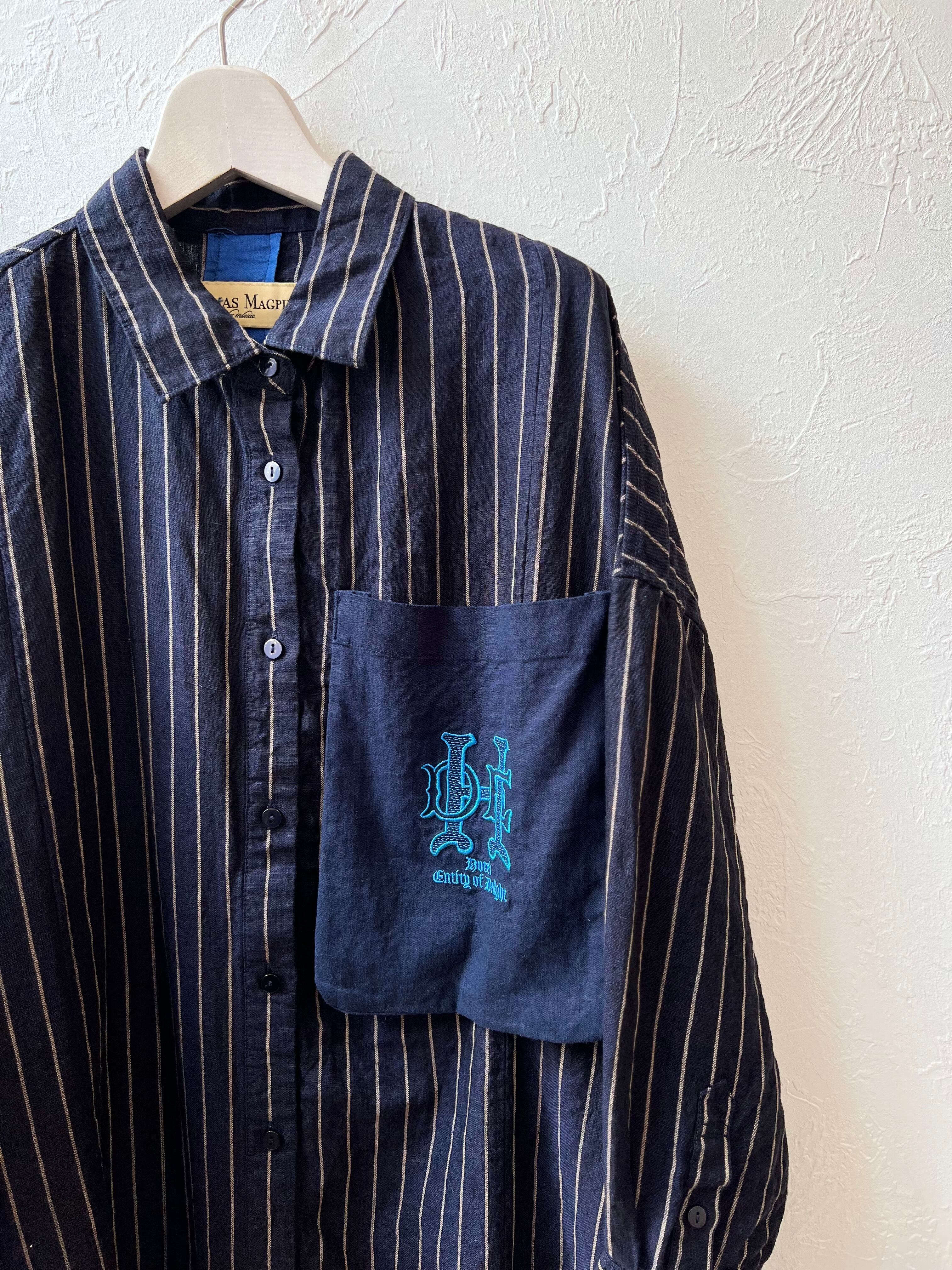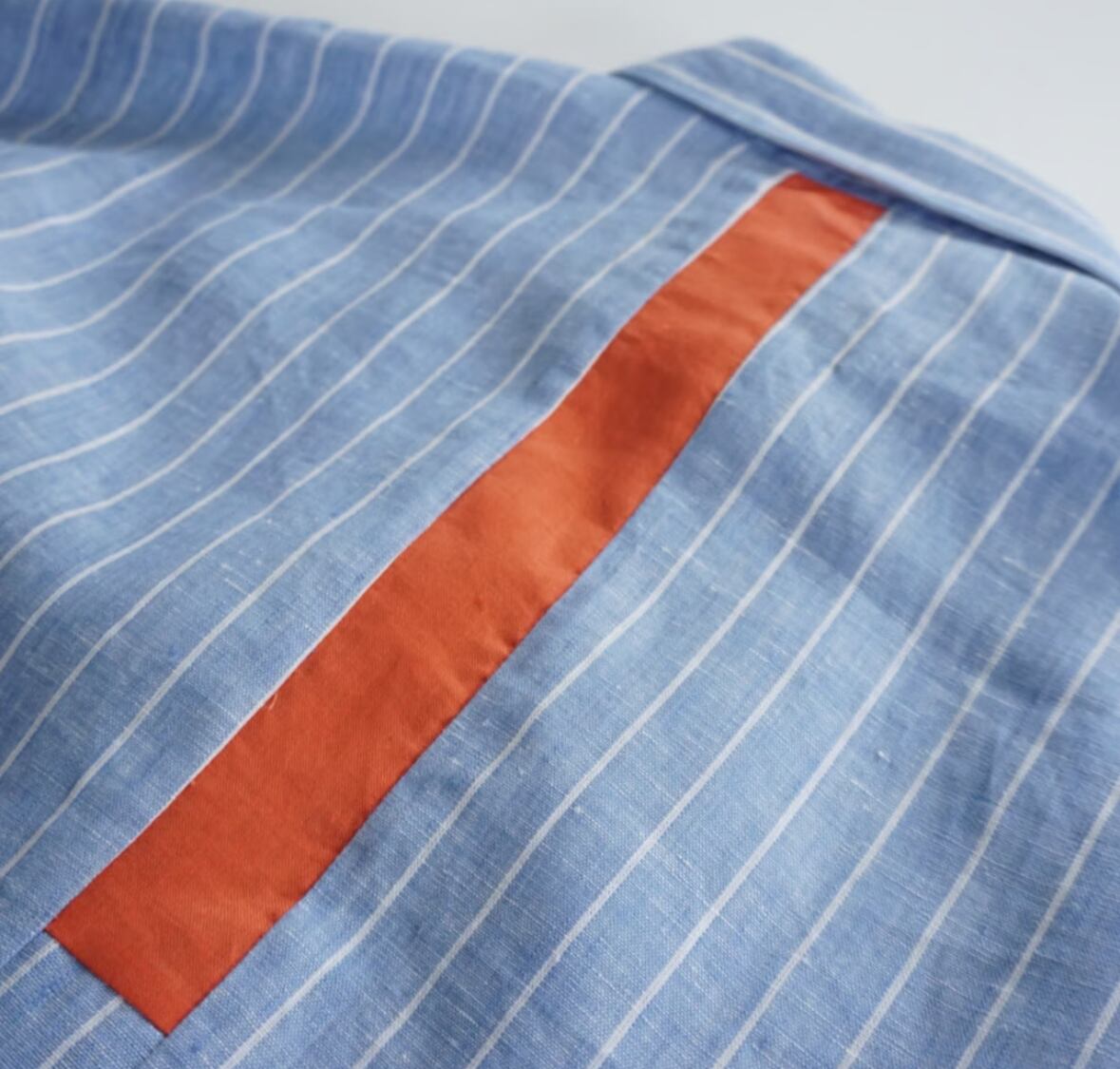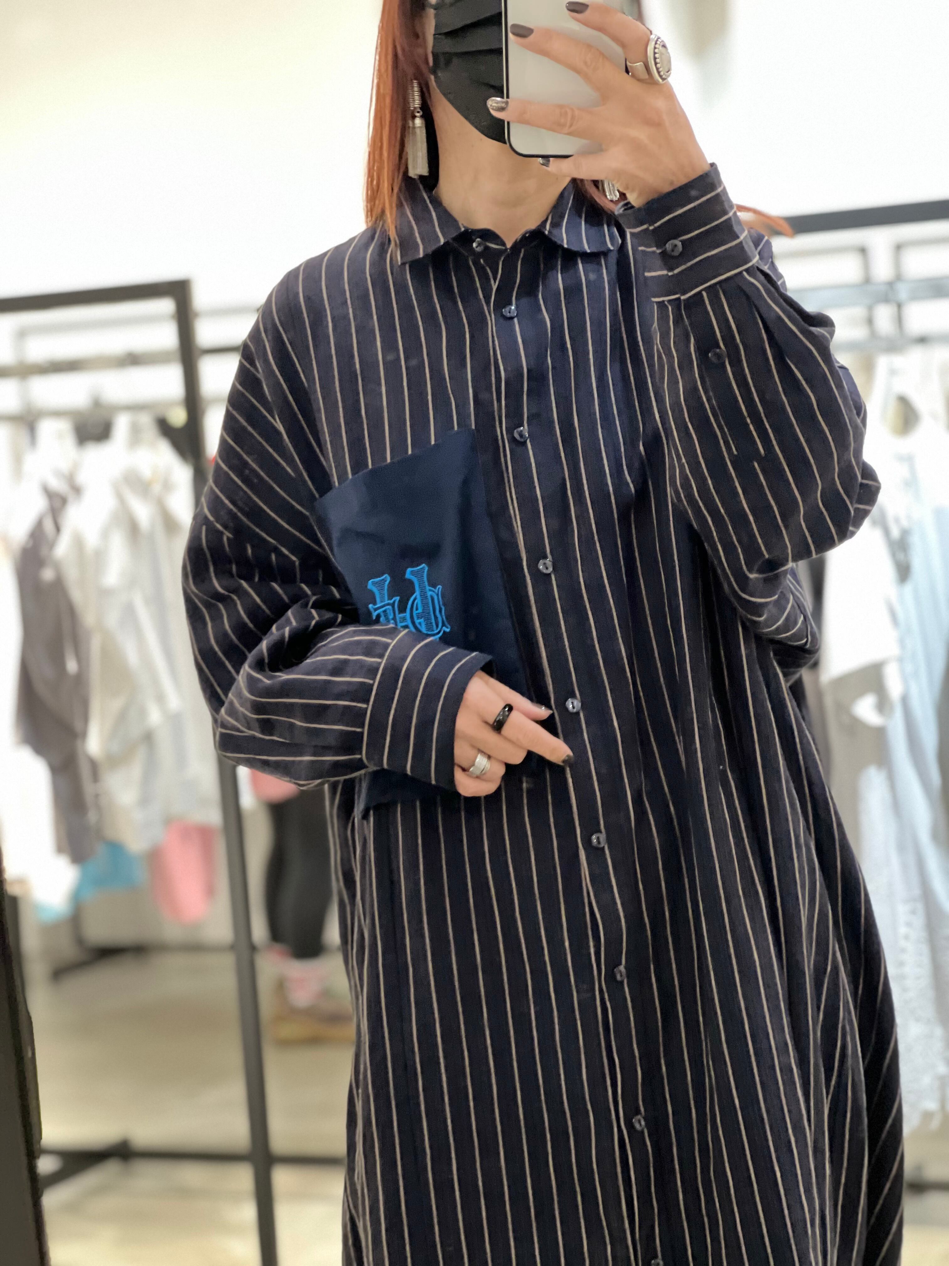 100%リネンのシャリっとしたロングシャツワンピース。パジャマのような雰囲気の羽織としてコート風にも使えます。今回はホテルがテーマなので、胸に刺繍を入れて、ホテルのパジャマのイメージでオーバーサイズのロングシャツをデザインしています。普通のデザインでは面白くないので、反対色のオレンジをパイピング、そして胸のポケットはオレンジの刺繍糸にしてみました。ブルーにオレンジのカラー対比が気に入っています。ポケットは胸にビッグポケット。この部分は単色のリネンに素材を替えてみました。大きめの刺繍にはEDHでマークを作りました。この意味はENTITY OF DELIGHT HOTEL ホテル(で過ごす)喜びの実体、という意味です。ホテルの楽しみ方は様々ですが、私自身がホテルで楽しく過ごすことに重きを置いているので、このロゴを作ってみました。クラシックなロゴマークが刺繍になっているのがポイントになっていてとても好きです。