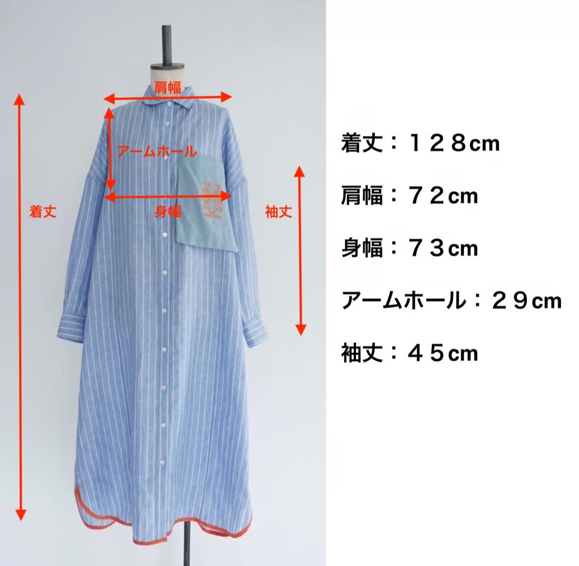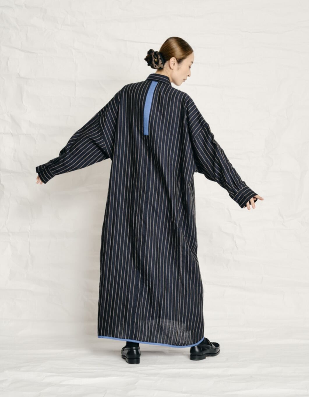 シルエットはとても大きめ。マキシ丈です。152cmくらいの方から着丈が合うと思います。身長の高い方は短めでもサマになります。アームも太めで身頃もかなりオーバーサイズですが袖丈は長すぎないようにしました。アームが大きめなので、上着としても羽織れるようになっています。内側の縫い目も折り伏せ縫いになっていて、ロング丈なので、もし内側が見えても、縫製部分のロックが見えずとても綺麗です。