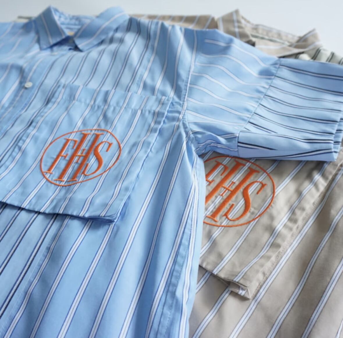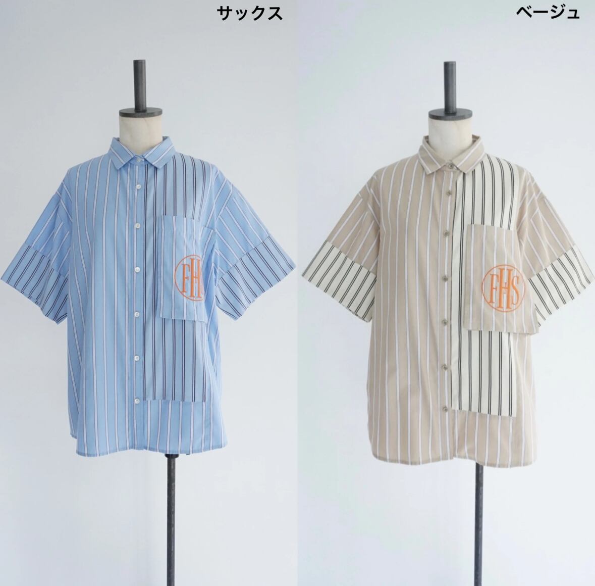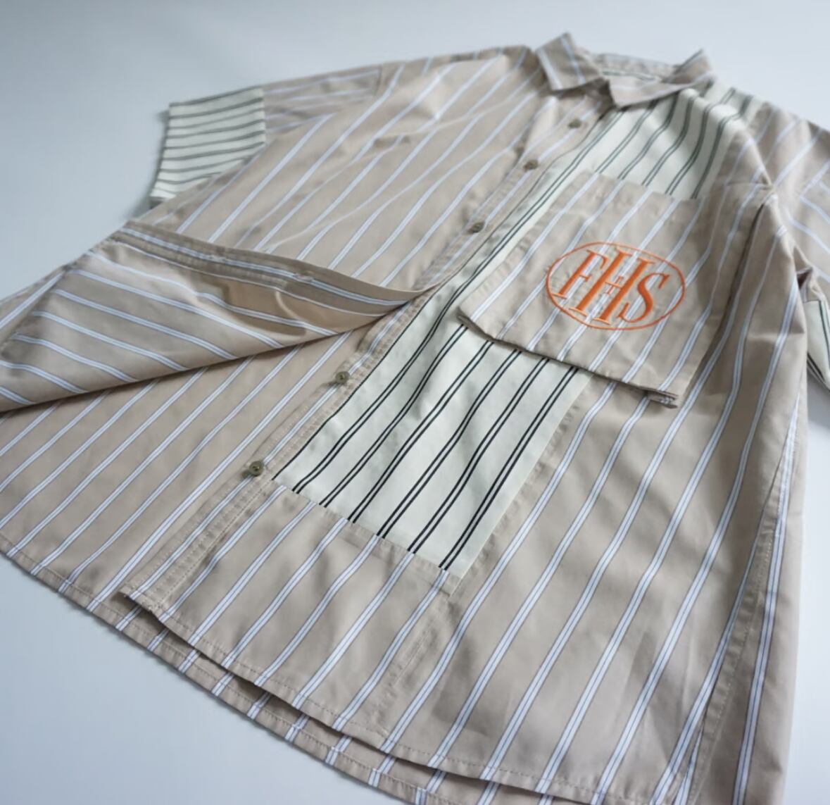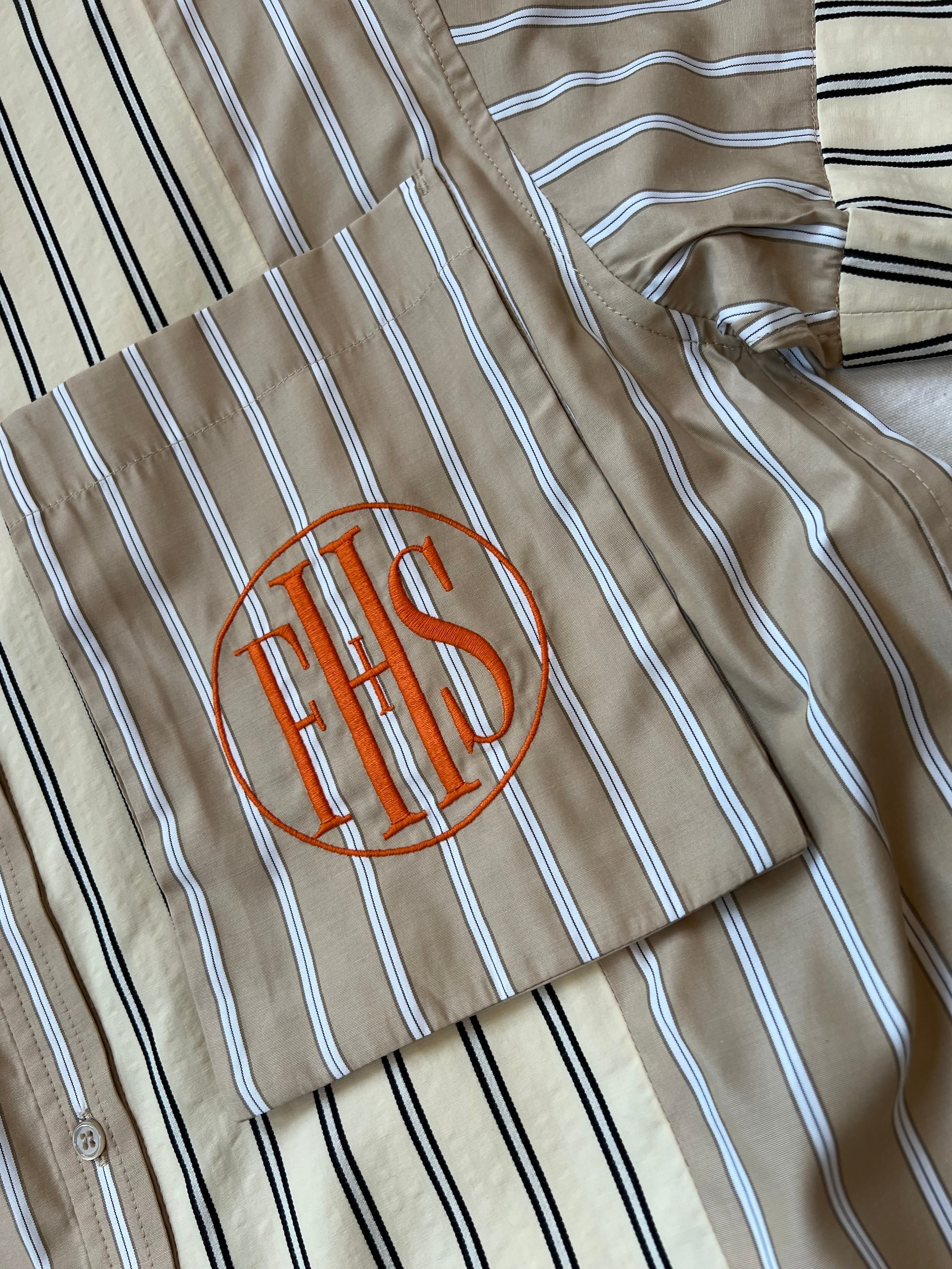 今年はストライプの半袖シャツを作っています。真夏にとても便利です。シルエットは大きめ。着丈も長めな、オーバーサイズシルエット。袖は折り返しができます。以前出していたビッグポケットシャツからの変更で、大きめのポケットをつけています。そこにFHSのマークを刺繍で入れてみました。FHSはファンシー(高級)ホテルステイクラブのマークをつけています。今回のテーマはホテルステイの為の夏のウエア。ロゴは国際的高級ホテルステイ妄想クラブという架空のクラブを作ってイメージを膨らませました。素敵なホテルで過ごすことを思いながらデザインを進めていきました。パジャマのように肌触りの良いシャツのイメージで作っています。ストライプドレスと同じ素材です。シャツは切り替えを作り2つのストライプを掛け合わせました。この2種類のストライプでパネルにするのは以前から試してみたかったデザインです。デザインする時はどうなるのか分かりませんでしたが、出来上がったらとても良いマッチングになりました。他ではあまりないようなデザインではないかと思います。ベージュとサックスブルーのポケットにそれぞれオレンジの刺繍糸がかわいい色味の対比だなと感じました。刺繍が入っていることで、シャツ自体が少し高級な雰囲気に仕上がったと思います。大きめの刺繍が非常に気に入っています。オレンジをポイントカラーにしていて、今回のメインビジュアルのロゴもオレンジで仕上げています。
