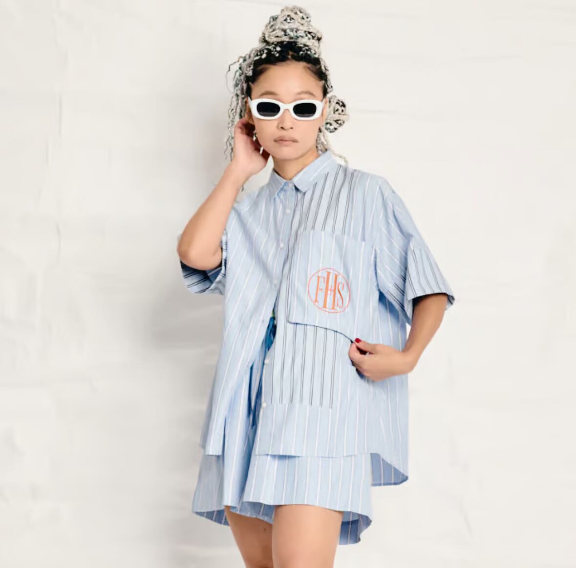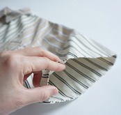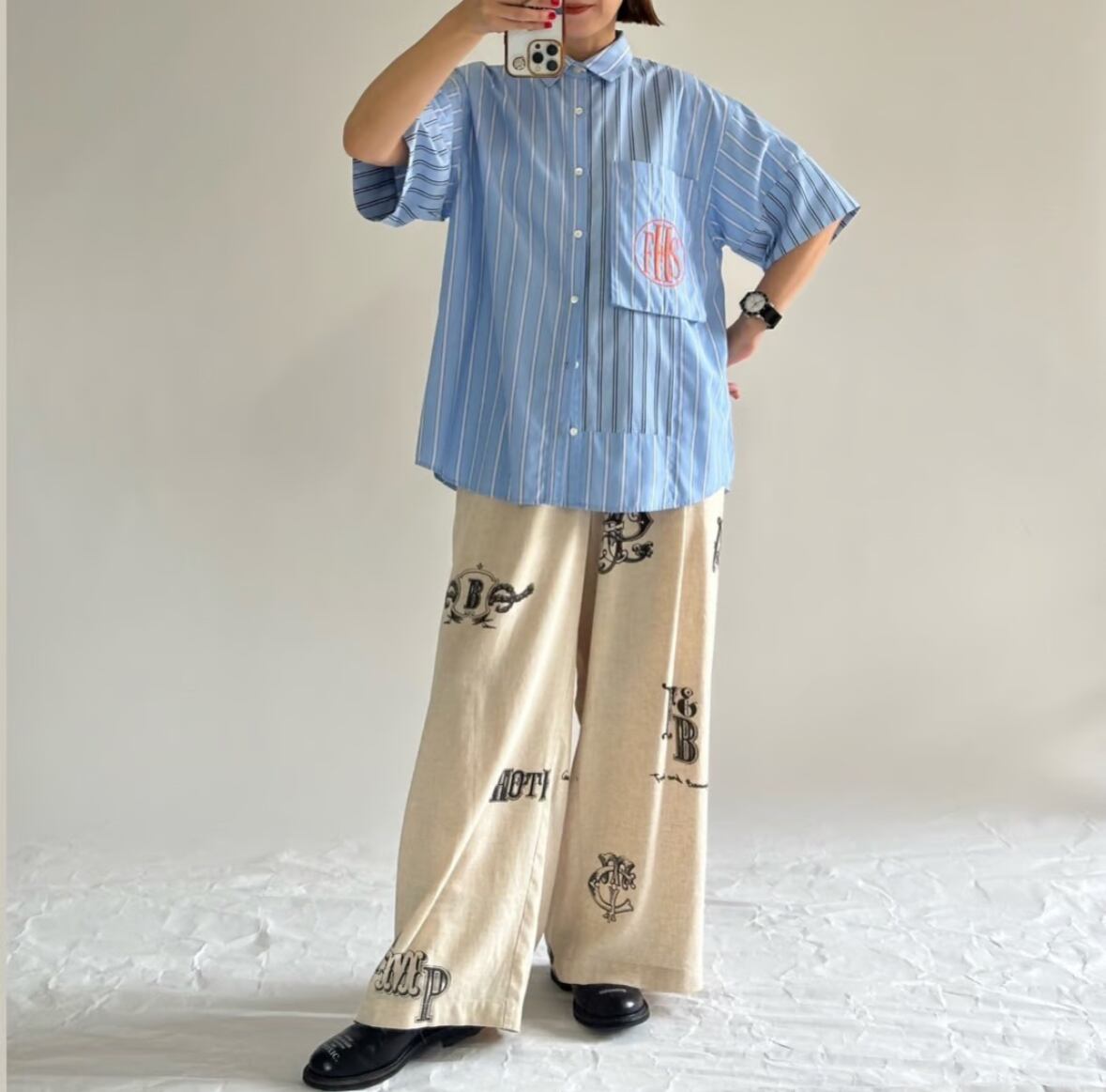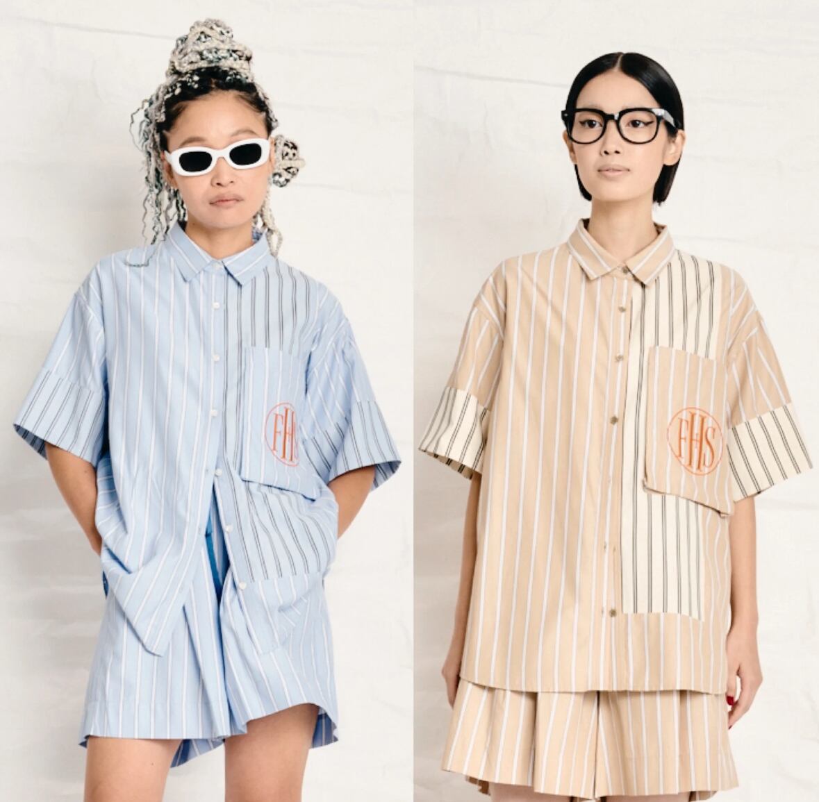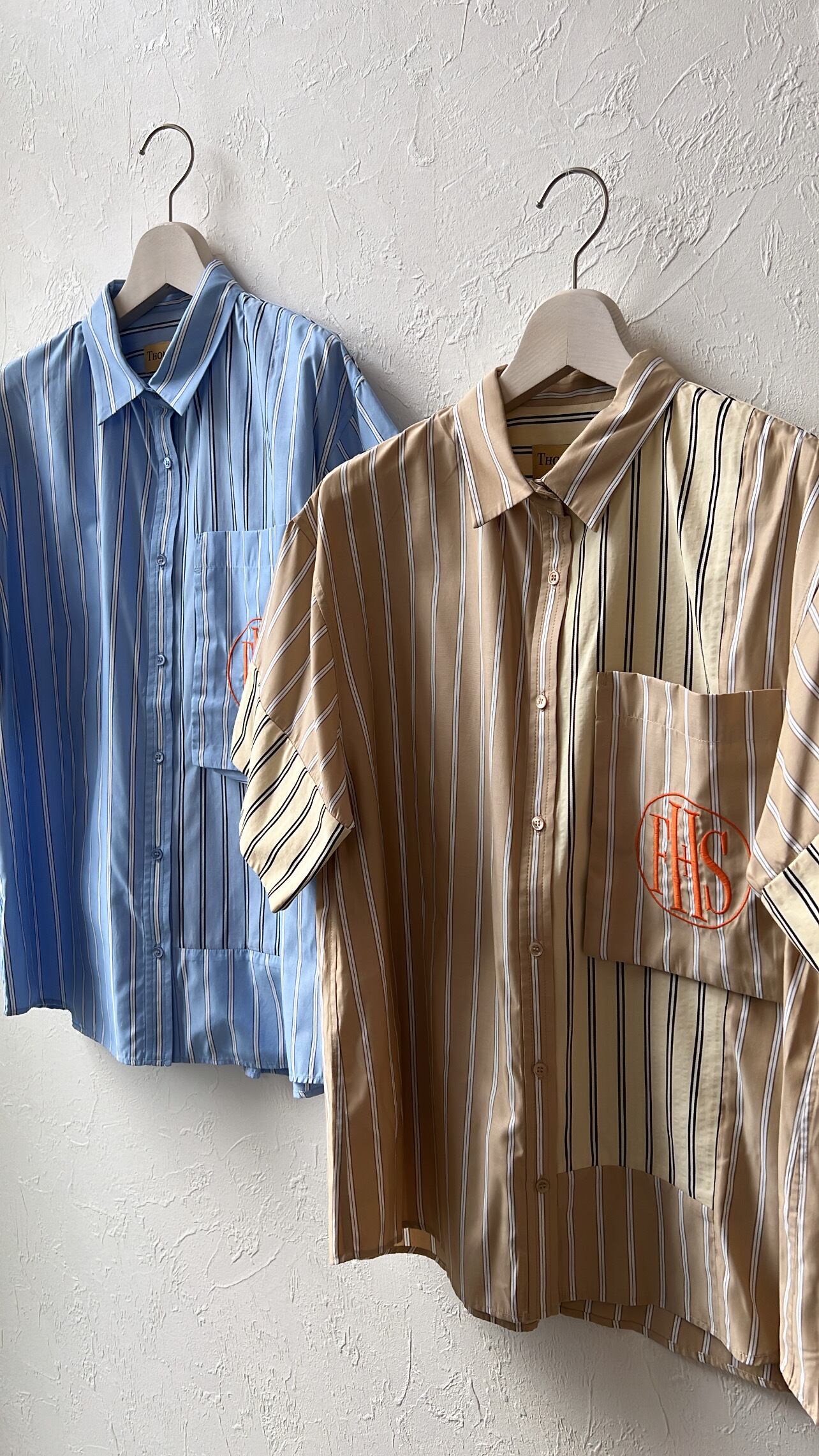 今年はストライプの半袖シャツを作っています。真夏にとても便利です。シルエットは大きめ。着丈も長めな、オーバーサイズシルエット。袖は折り返しができます。以前出していたビッグポケットシャツからの変更で、大きめのポケットをつけています。そこにFHSのマークを刺繍で入れてみました。FHSはファンシー(高級)ホテルステイクラブのマークをつけています。今回のテーマはホテルステイの為の夏のウエア。ロゴは国際的高級ホテルステイ妄想クラブという架空のクラブを作ってイメージを膨らませました。素敵なホテルで過ごすことを思いながらデザインを進めていきました。パジャマのように肌触りの良いシャツのイメージで作っています。ストライプドレスと同じ素材です。シャツは切り替えを作り2つのストライプを掛け合わせました。この2種類のストライプでパネルにするのは以前から試してみたかったデザインです。デザインする時はどうなるのか分かりませんでしたが、出来上がったらとても良いマッチングになりました。他ではあまりないようなデザインではないかと思います。ベージュとサックスブルーのポケットにそれぞれオレンジの刺繍糸がかわいい色味の対比だなと感じました。刺繍が入っていることで、シャツ自体が少し高級な雰囲気に仕上がったと思います。大きめの刺繍が非常に気に入っています。オレンジをポイントカラーにしていて、今回のメインビジュアルのロゴもオレンジで仕上げています。