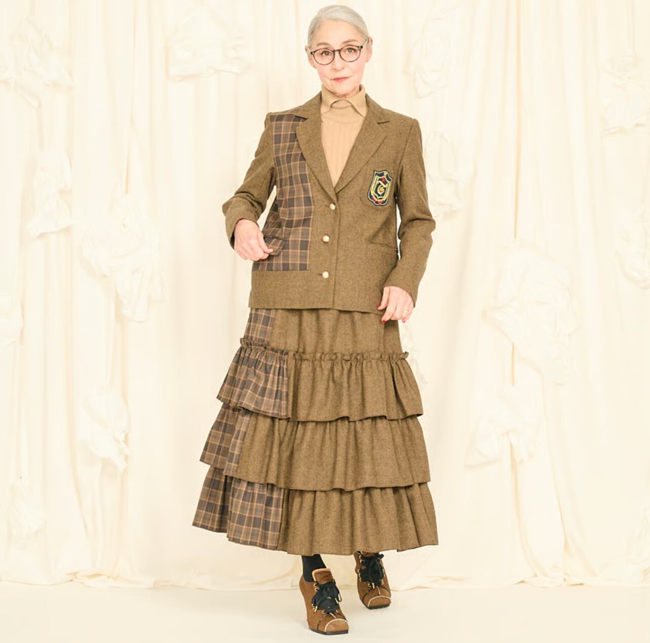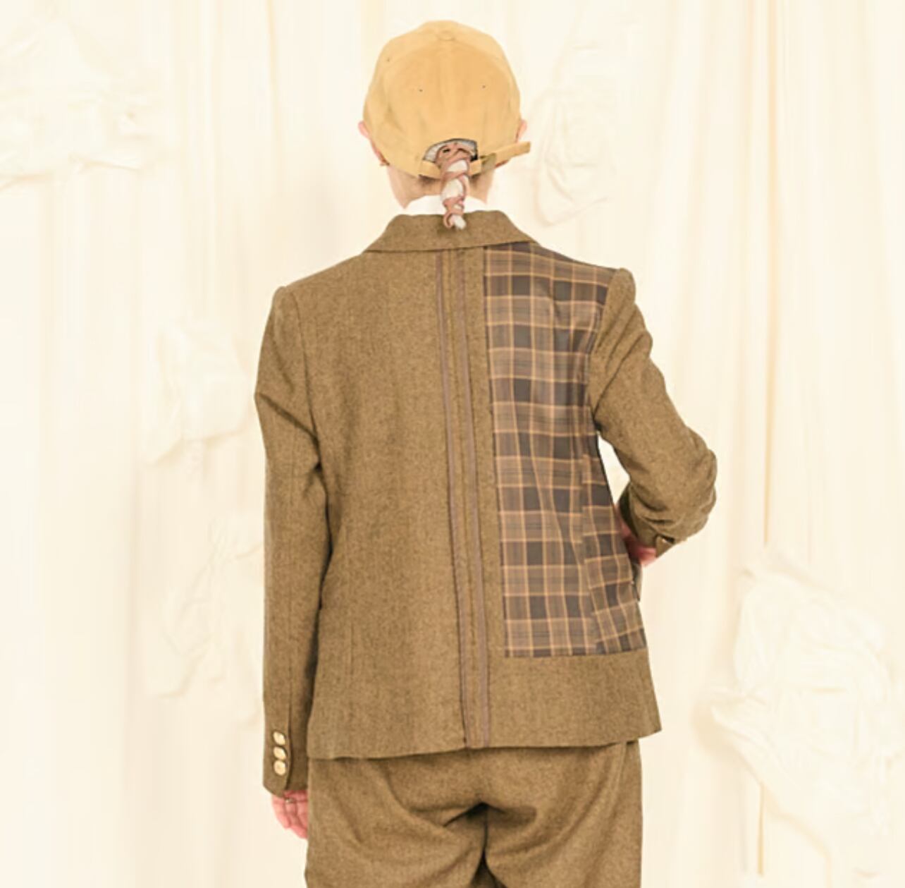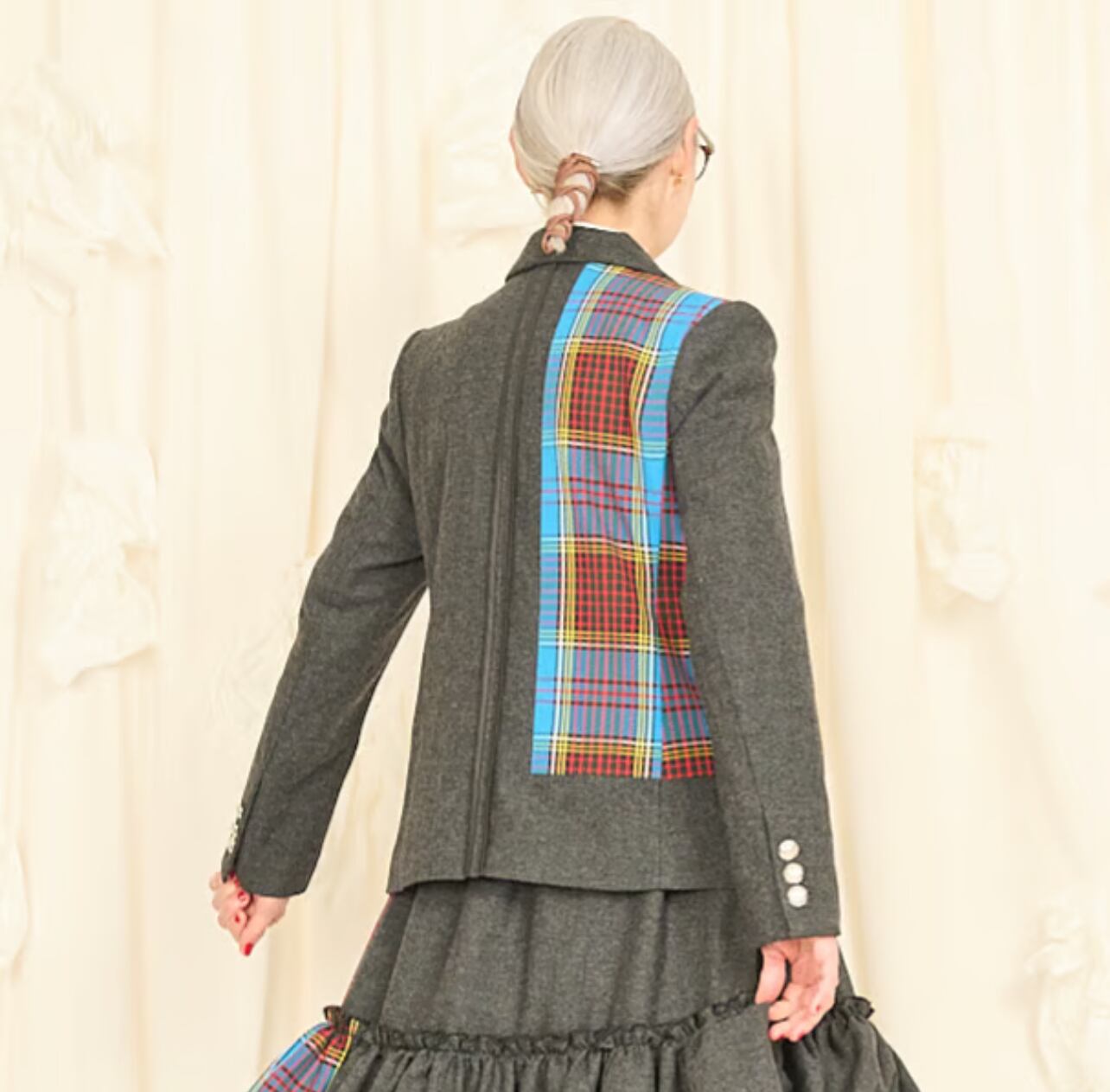 かなりコンパクトに見えますが、さほど小さめにはなっていません。今回はラッフルスカートとのセットアップを中心にデザインを考えたので、着丈を短くしています。ツイードとチェックのパネル貼り付けたようなフロントのデザインが特徴的です。また、後ろ身頃は背中心から縫い代を出してパイピングを見せた技巧的な作りにしています。