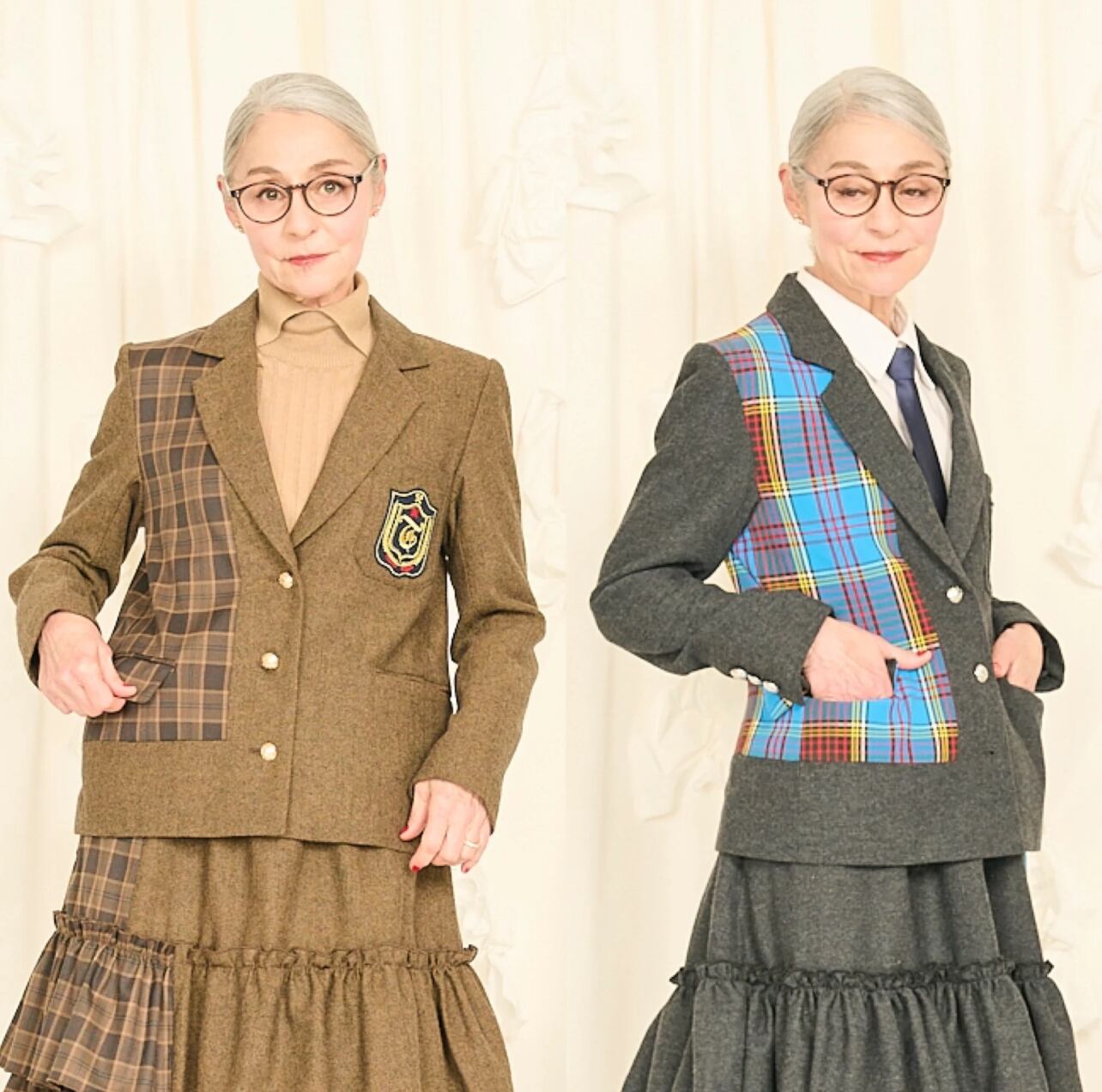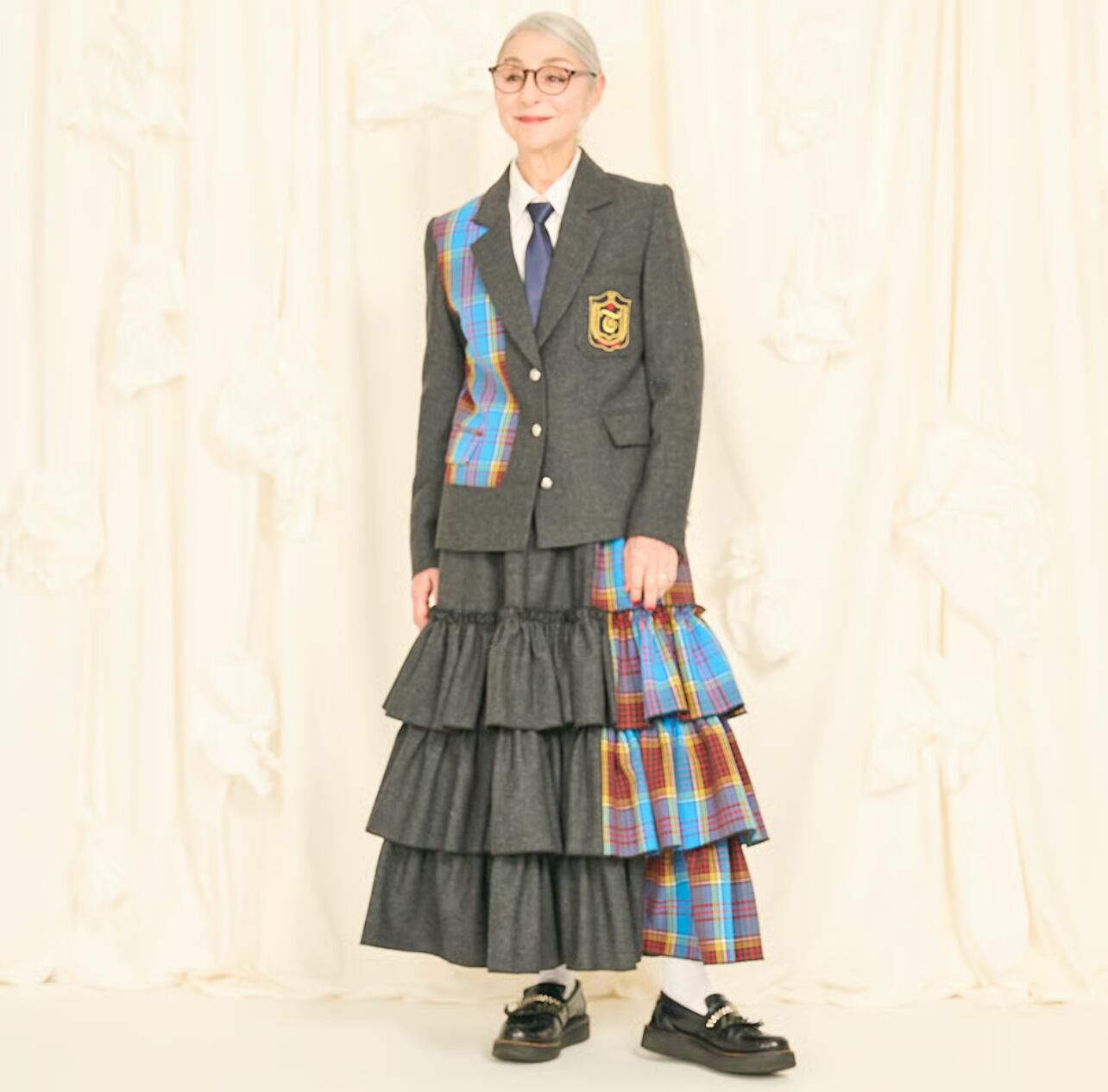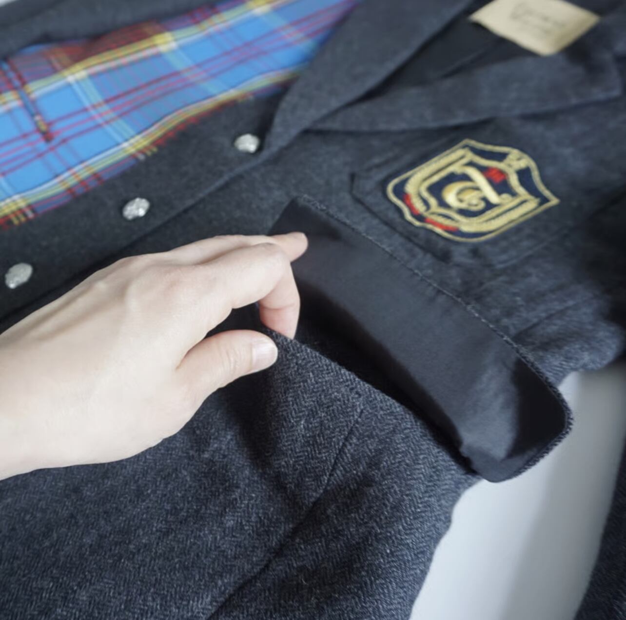 かなりコンパクトに見えますが、さほど小さめにはなっていません。今回はラッフルスカートとのセットアップを中心にデザインを考えたので、着丈を短くしています。ツイードとチェックのパネル貼り付けたようなフロントのデザインが特徴的です。また、後ろ身頃は背中心から縫い代を出してパイピングを見せた技巧的な作りにしています。