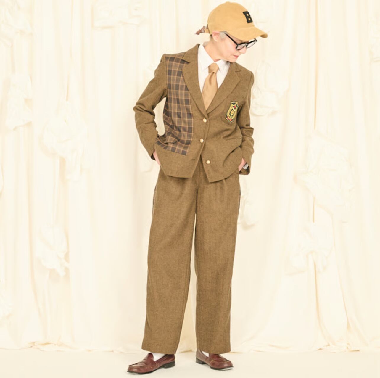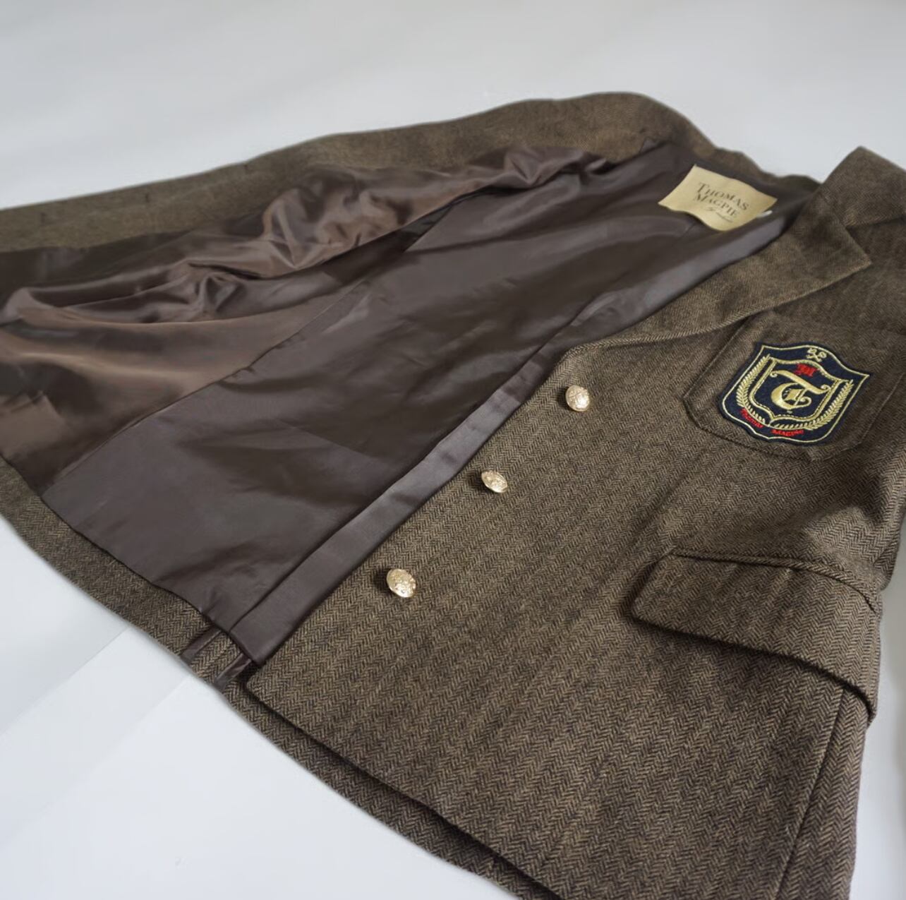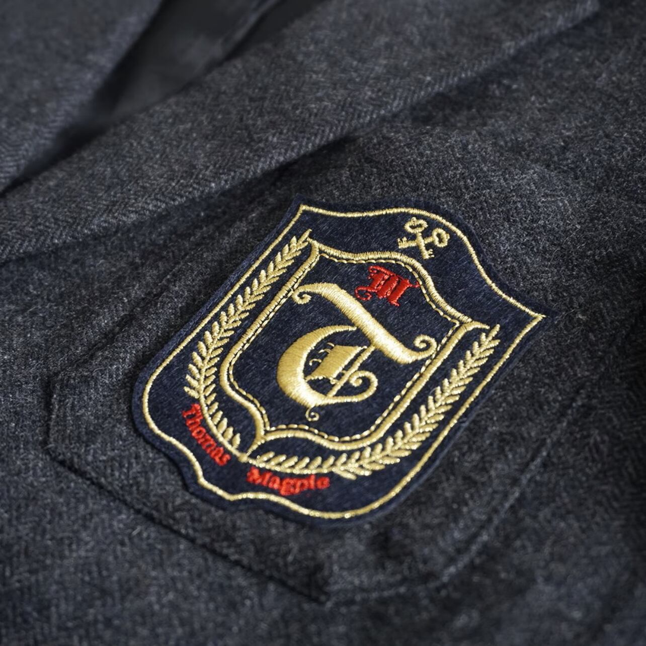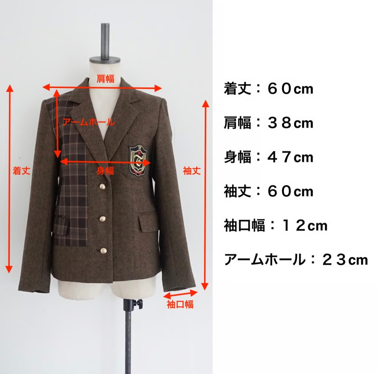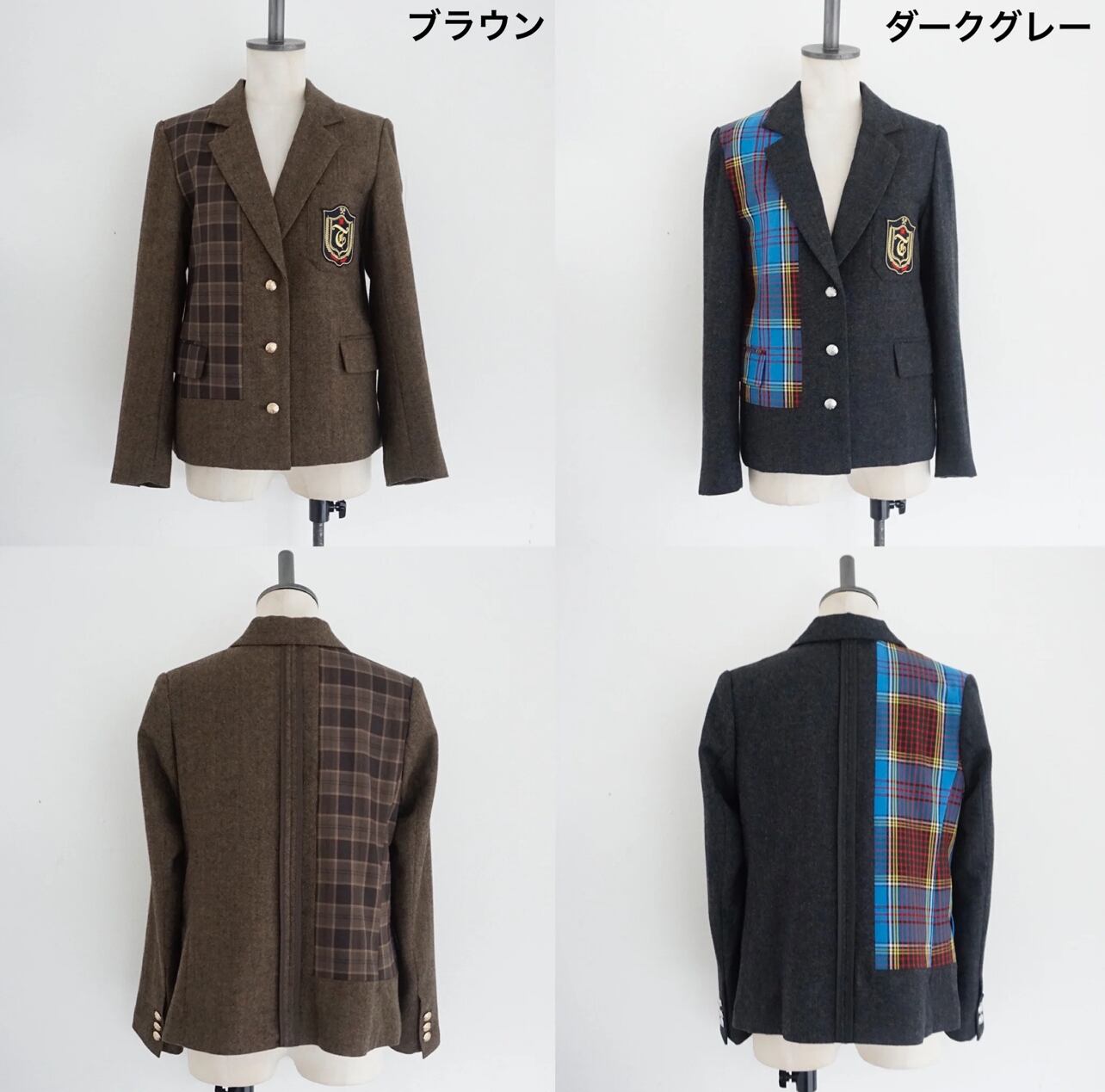 フロント胸にはオリジナルのブランドロゴ入りのエンブレムを付けています。トラッド感の強いデザインで、ブラウンもグレーもチェックとの組み合わせで少し変わった雰囲気を醸します。ビジネスシーンでもオフィスカジュアルがOKなお仕事であれば、とてもお勧めです。スカートスタイルに非常に重宝する冬の暖かなジャケット。上からコートを羽織るのにもストレスのないコンパクトさです。