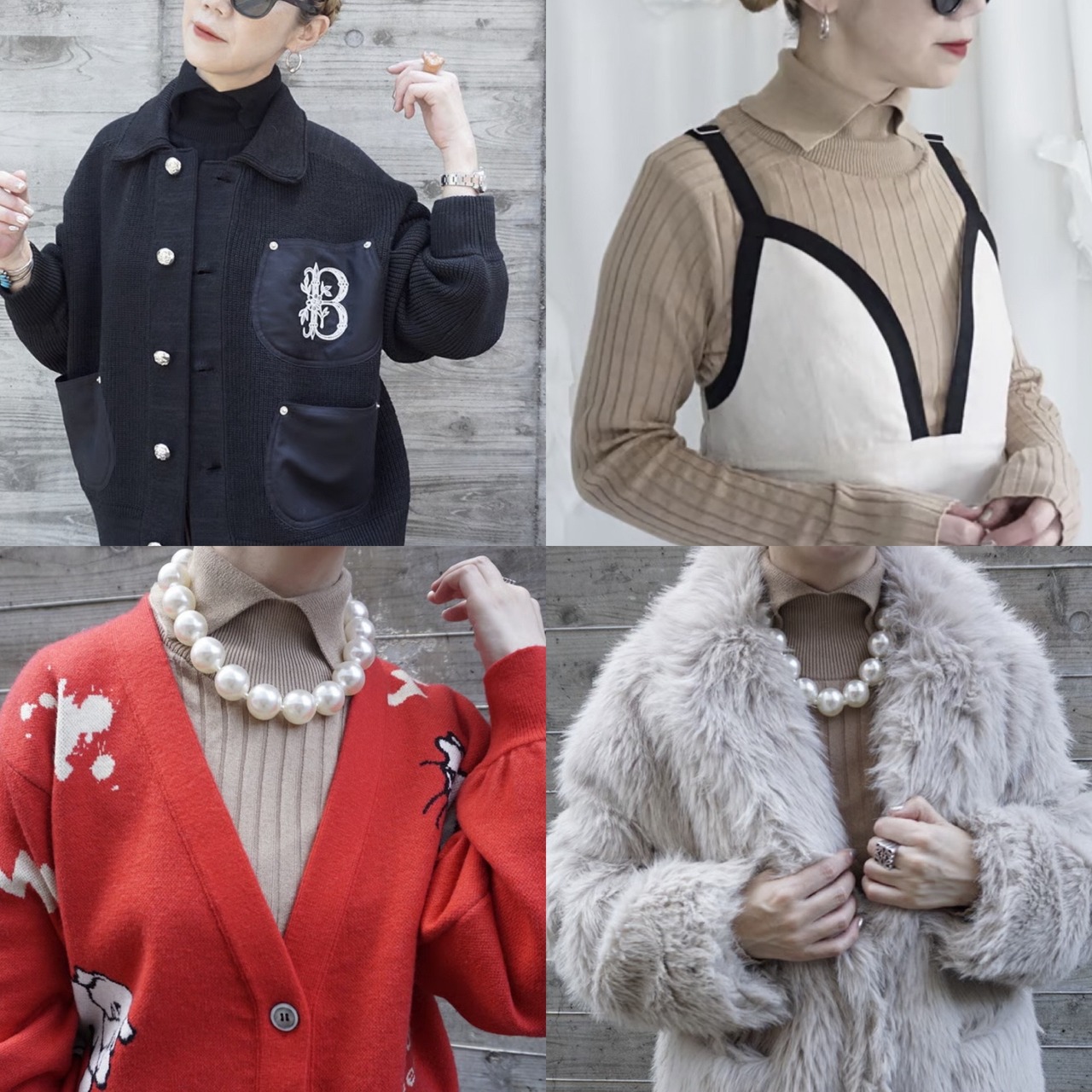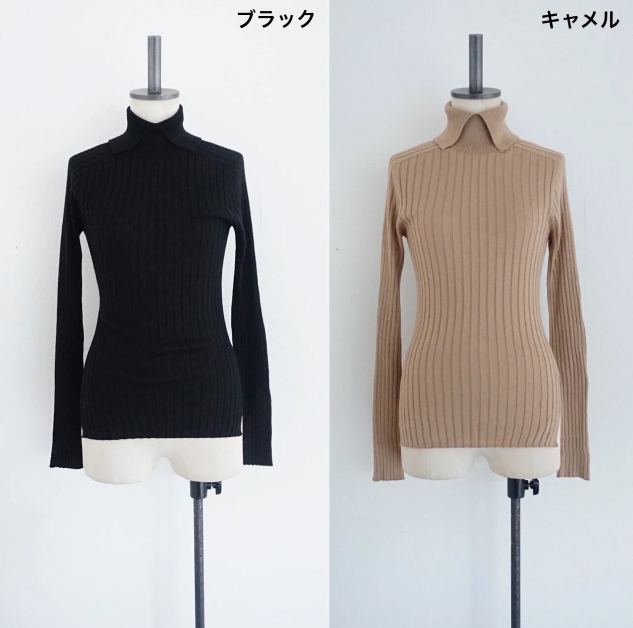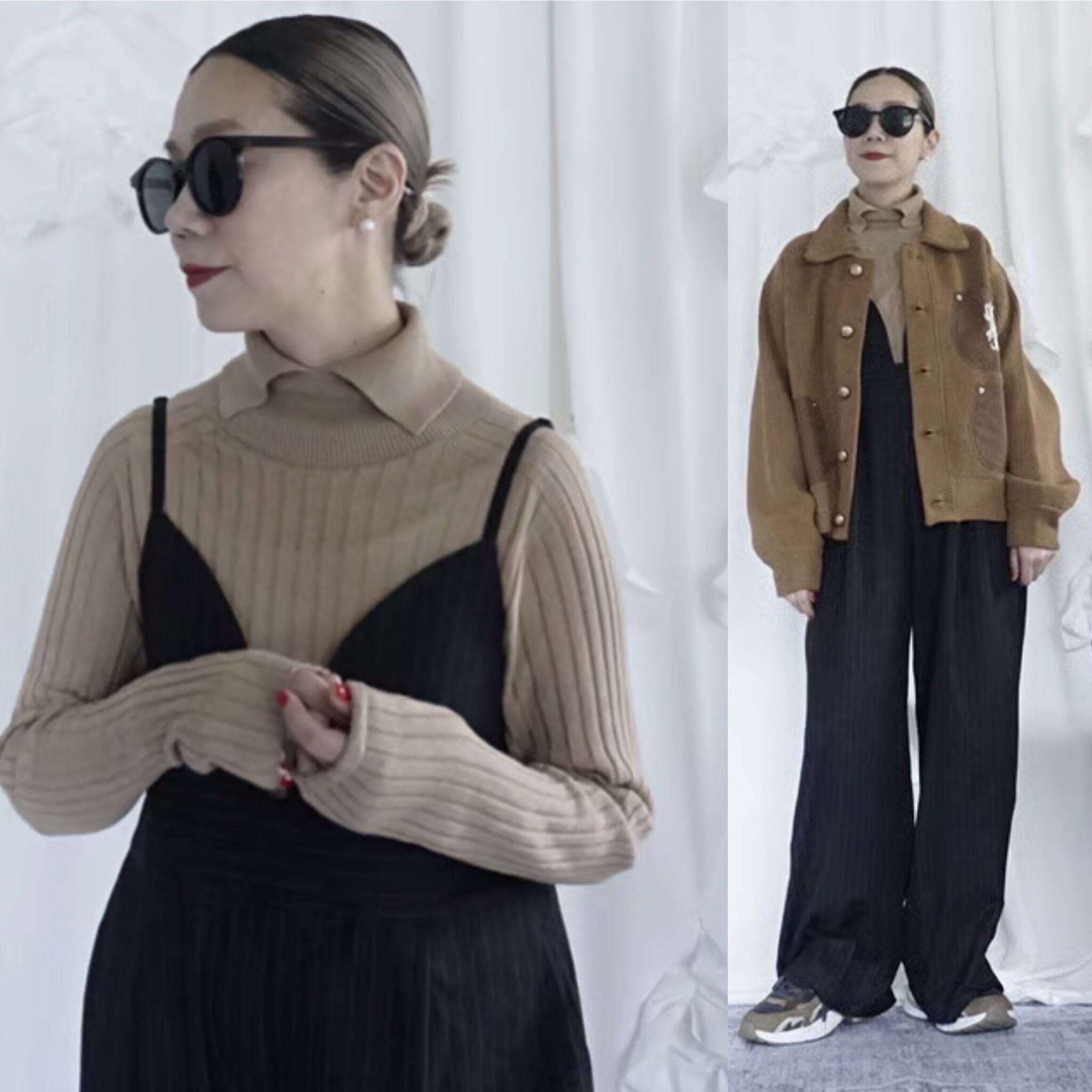 そこで、タートルにハサミを入れて襟の様なデザインはどうかなと試してみました。襟が割れてタートルほど上までこないので、スッキリとして、首も細く見える視覚効果がありました。薄手のリブ編みにしていてストレッチ性が抜群で、透け感は強くなく、寒い冬にとても使えるインナーになりました。コットンレーヨンにシルクが入っていて、着心地が抜群の柔らかな素材です。袖は写真サンプルより3cm程度長くなる予定です。真冬に1枚あるとついつい着たくなるインナーです。これまでも良い素材のインナーニットを出してきていてとても人気ですが、今回はいつものタートルと違い、ちょっと大人っぽくてモードな襟に仕上がっています。首が短い方、太い方は首が長く見える効果もあります。上品で大人な雰囲気です。