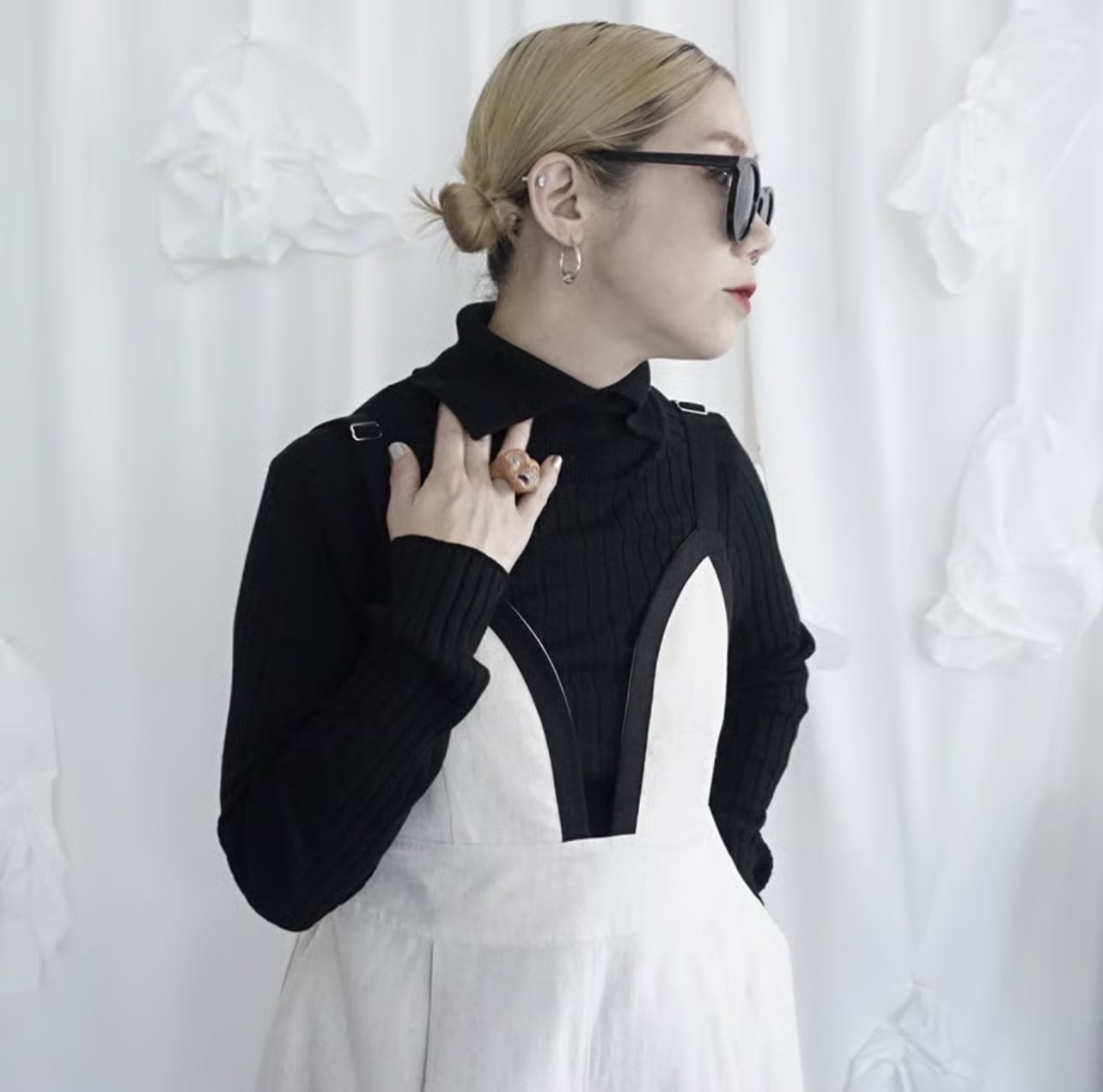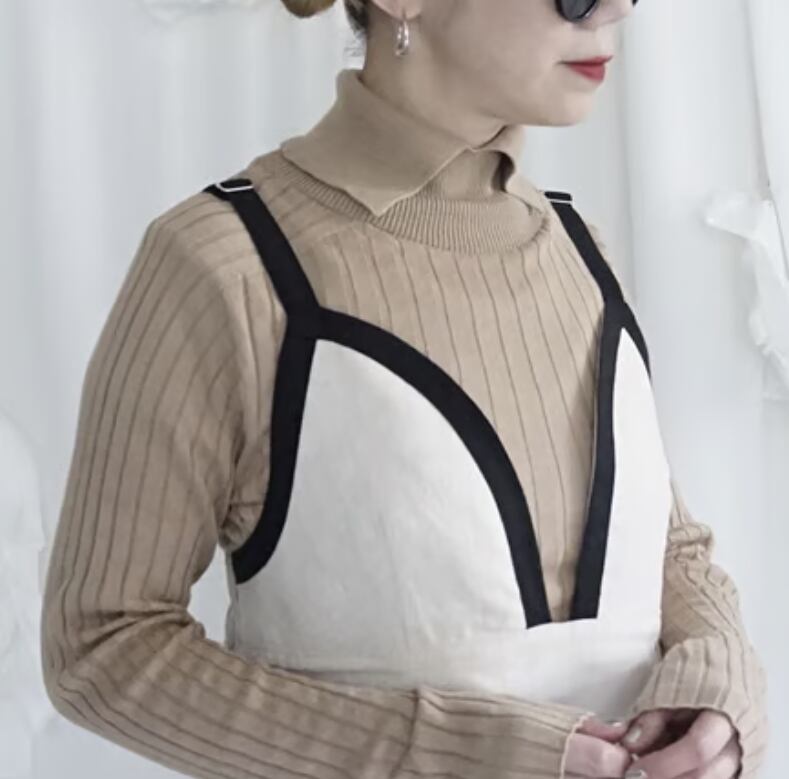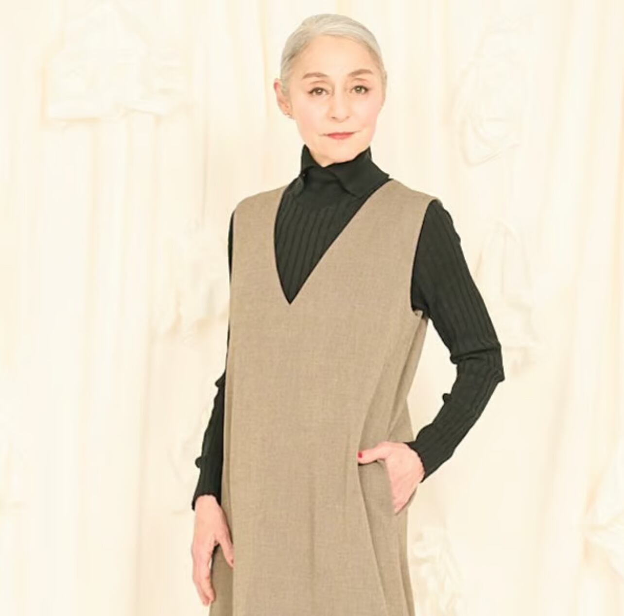 そこで、タートルにハサミを入れて襟の様なデザインはどうかなと試してみました。襟が割れてタートルほど上までこないので、スッキリとして、首も細く見える視覚効果がありました。薄手のリブ編みにしていてストレッチ性が抜群で、透け感は強くなく、寒い冬にとても使えるインナーになりました。コットンレーヨンにシルクが入っていて、着心地が抜群の柔らかな素材です。袖は写真サンプルより3cm程度長くなる予定です。真冬に1枚あるとついつい着たくなるインナーです。これまでも良い素材のインナーニットを出してきていてとても人気ですが、今回はいつものタートルと違い、ちょっと大人っぽくてモードな襟に仕上がっています。首が短い方、太い方は首が長く見える効果もあります。上品で大人な雰囲気です。