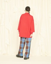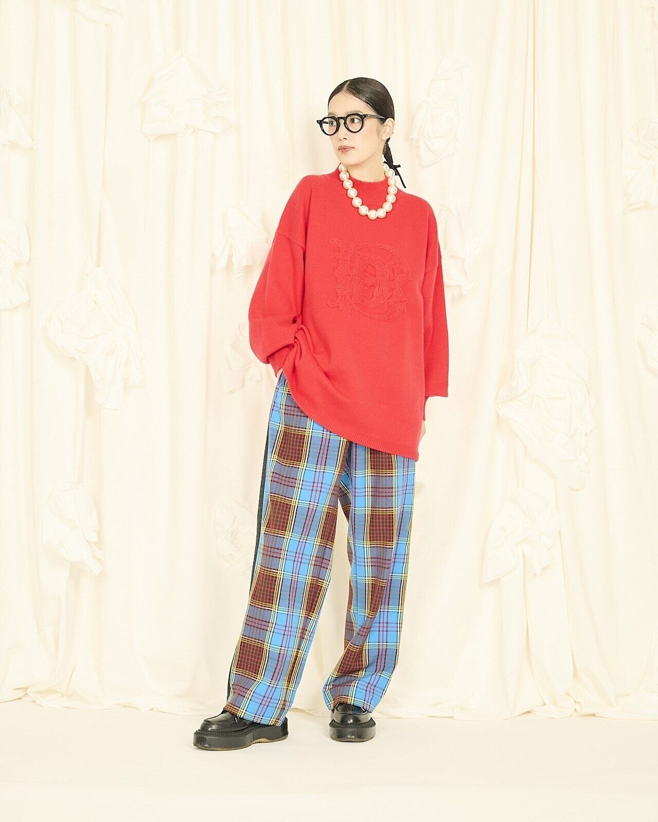 初めての試みのニット。極太の糸でフロント部分に大きな刺繍を入れています。以前から人気だったハイネックで着丈がやや長めのニットです。