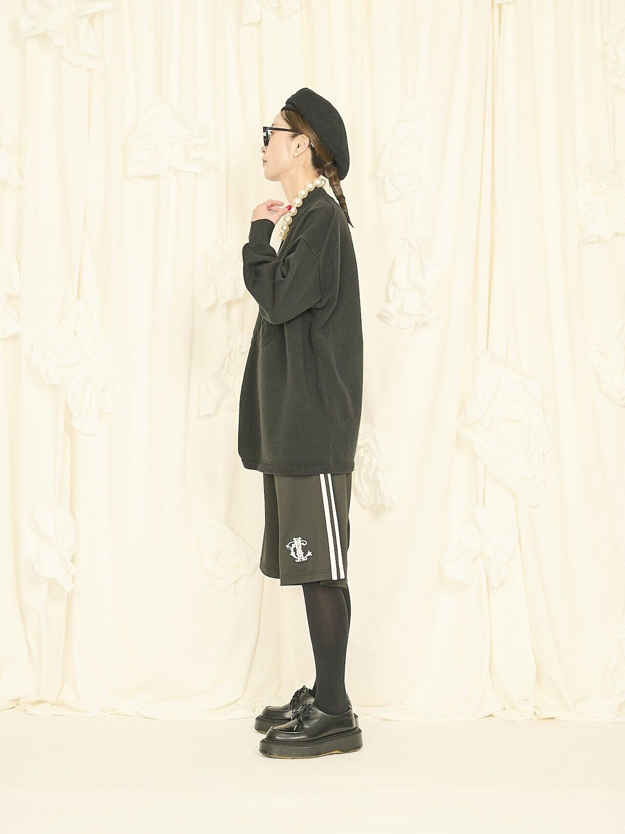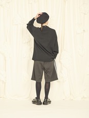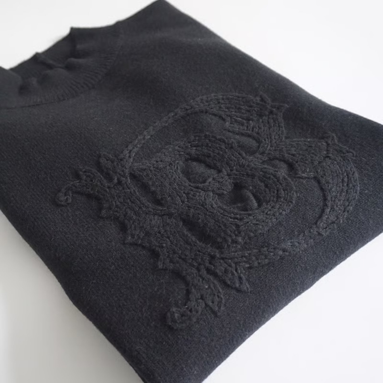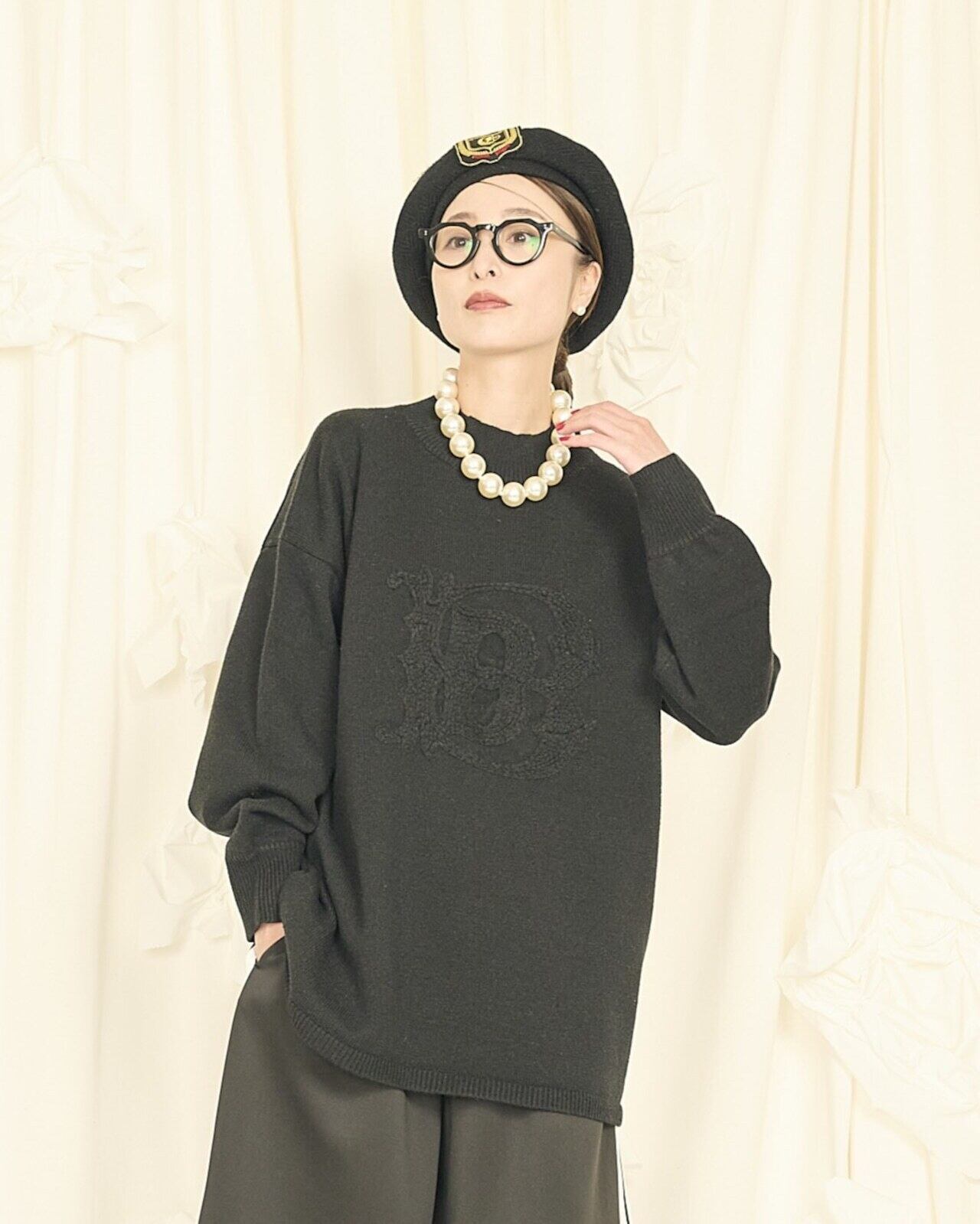 フロント部分に大きなBの飾り文字が刺繍で立体的に入っています。クラシカルで可愛い飾り文字です。BはDON’T BOREのBの意味です。同色のブラックの同じ糸を使っているので柄は目立ちませんがよく見るとあまりない刺繍で魅力的ではないかと思います。数年前にもチャレンジして試みましたが、あまり良くできておらず、今回再チャレンジで良い刺繍ができました。これは、今回スタッフに大変好評だったのもあり予約商品に選びました。真冬には重宝する合わせやすく主張が少ない単色のブラックニットです。よく出来ていると思います。
