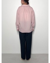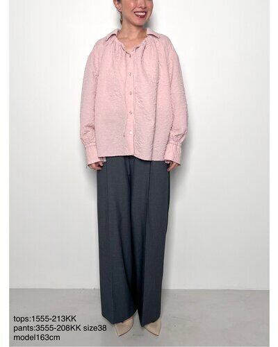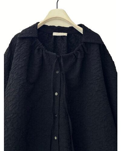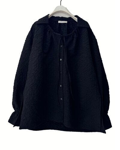 衿ぐりのギャザーで衿開きをお好みの広さに調整が可能です。ギャザーを寄せずに着て頂くと、テーラードのような衿としても着用出来ます。