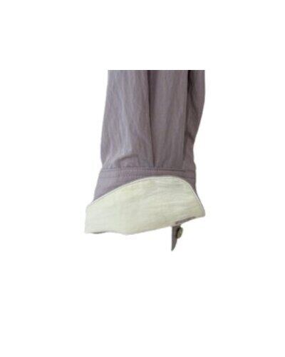 後のタックを閂で止めたり、斜めにカットしたカフスは折り返すと配色になっていたりと、