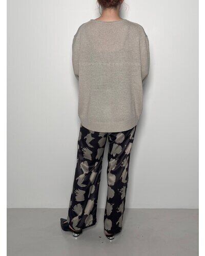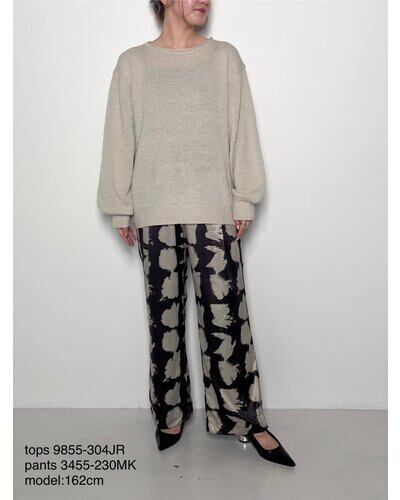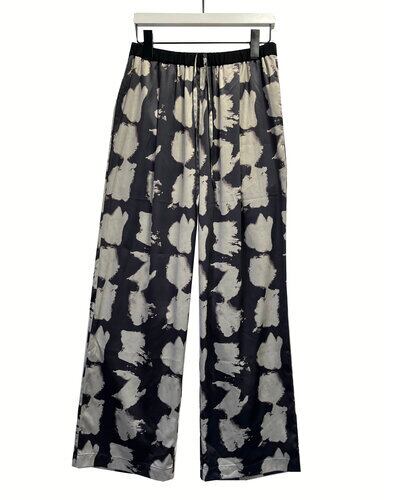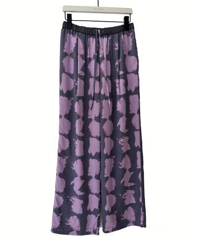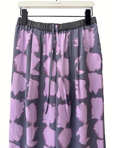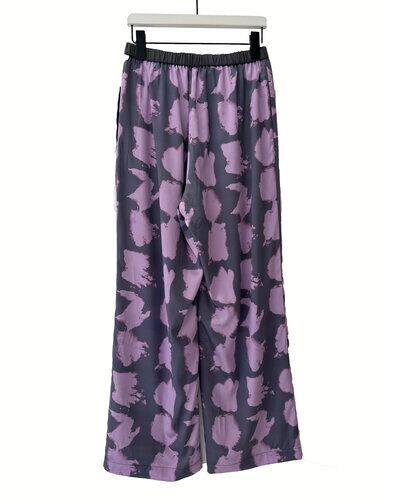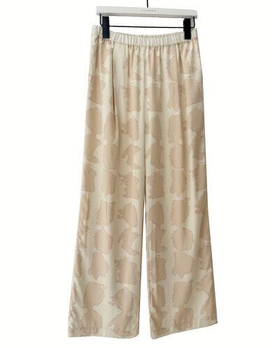 程よい光沢感と落ち感のある素材で女性らしい柄パンツができあがりました。動くたびにふわっと軽やかに広がるシルエットです。