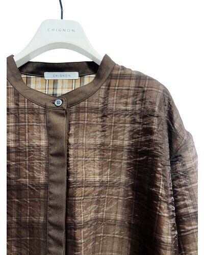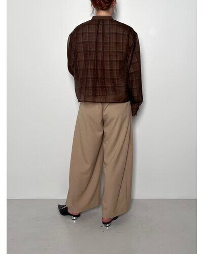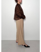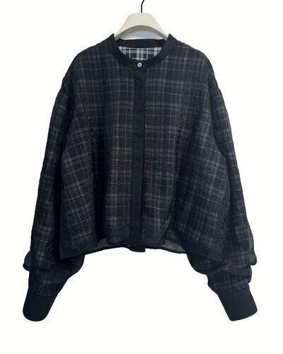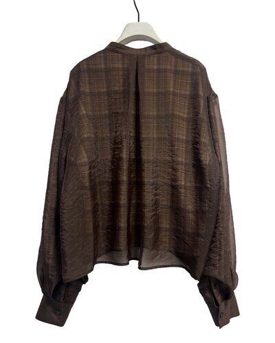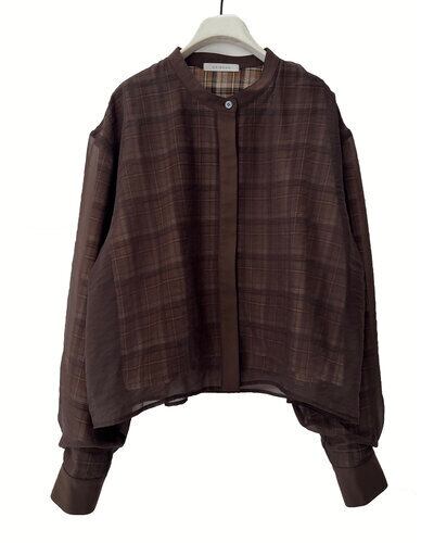 チェック素材の上にオーガンジーを重ねた仕様になっており、風合いの異なる素材のレイヤード感を楽しんでいただけます。オーガンジー側の身頃と袖に、ふんわりと立体感が出るように拘りました。