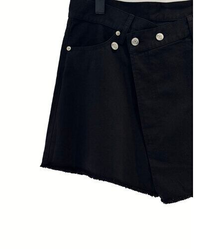 セルロースと綿混紡ののやわらかなツイル素材を、さらにバイト加工をかけることで、より滑らかな風合いに仕上げました。巻きスカートになっていて、ウエスト釦を止める位置で、ジャストウエストで着用したり、腰で落としてルーズに着用したりと、その日の気分でシルエットや着丈感を楽しめるアイテムです。