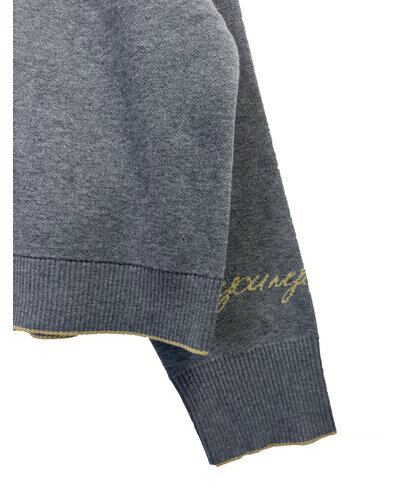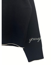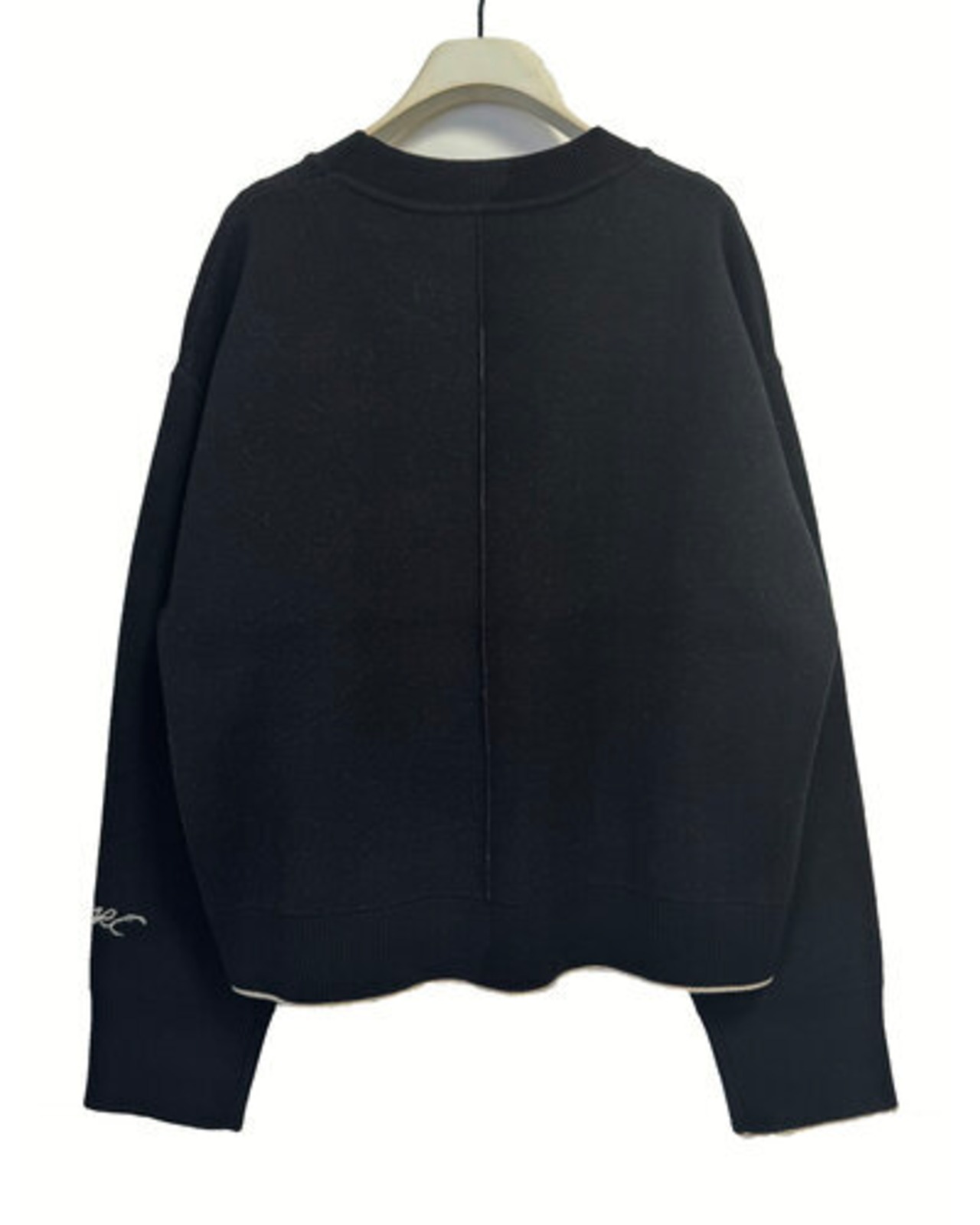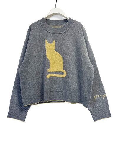 しっかりと厚みのあるジャガード編み地とフロントに大きくイラストされた猫が愛らしいキャッチーなニットPO。