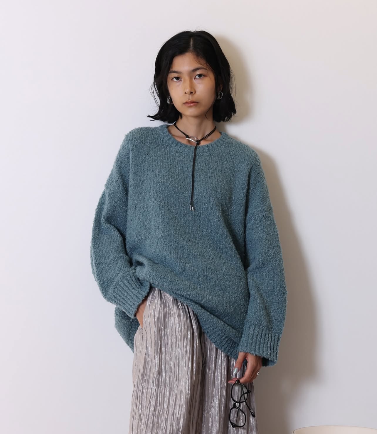 糸はポコポコとした表面感が可愛い、小さいループのブークレを使用したニットプルオーバー。