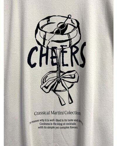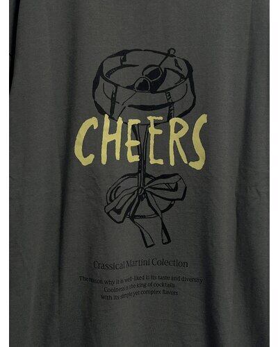 カクテルグラスと“CHEERS”のロゴが印象的な、遊び心のあるバックプリントロンT。