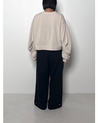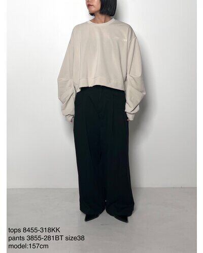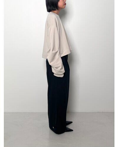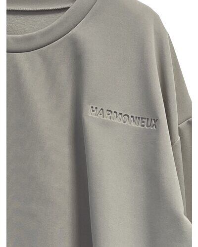立体的なボリュームスリーブが目を惹くショート丈起毛スウェット。トレンド感のあるオーバーサイズシルエットと、裾のコンパクトな丈感が絶妙なバランスを生み、スタイルアップ効果も抜群。胸元には「HARMONEUX」のエンボスロゴをさりげなくあしらい、シンプルながらも存在感のある一枚に仕上がっています。カジュアルにもモードにも着こなせる、こなれ感たっぷりのアイテムです。