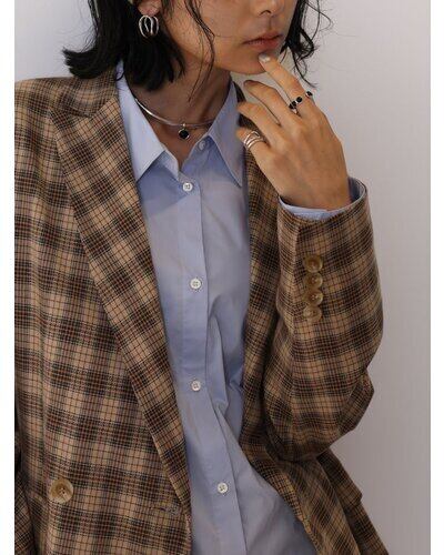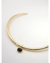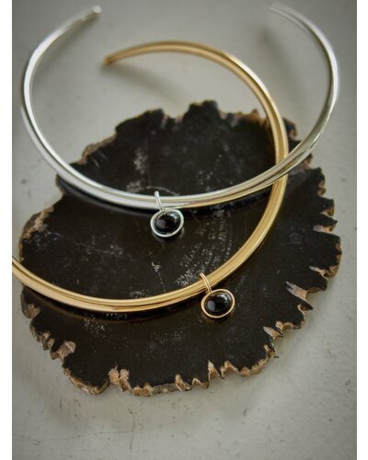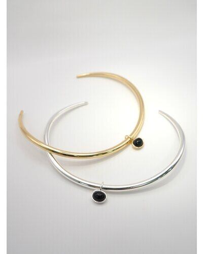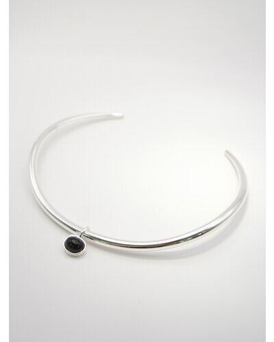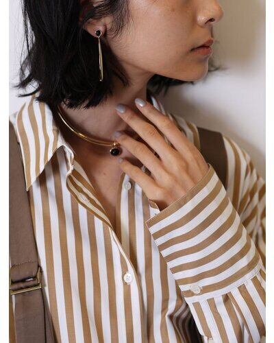 首元にフィットするように立体的なカーブをつけたミニマルなラウンドフォルムに、両面仕様のTOPが添えられたメタルチョーカー。横長のオーバル型TOPは前後どちらでも使える2WAY仕様で、表面がオニキス、裏面はシンプルなメタルになっているのでその日の気分やコーデに合わせてスタイリングを愉しめます。もちろんメタルチョーカーのみシンプルにつけても◎シャツやニットなど様々なコーデに相性抜群で、いつものスタイルに抜け感とさりげないモード感を引き出してくれるネックレスです。チョーカー先端に「CHIGNON」刻印入り。