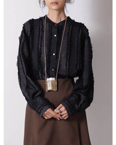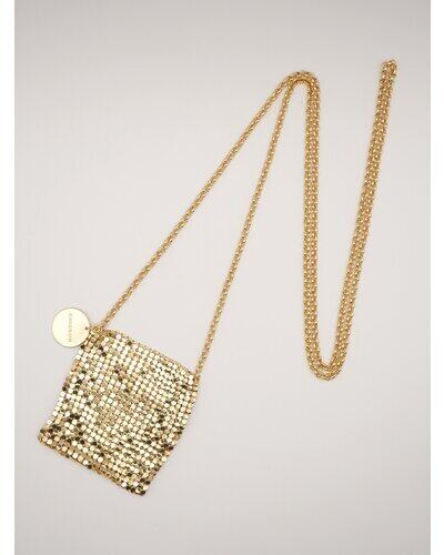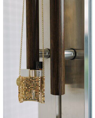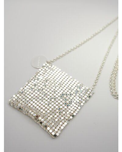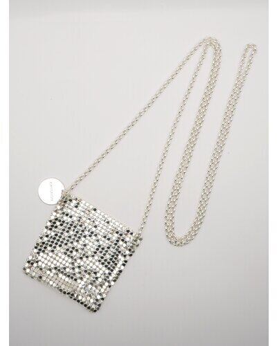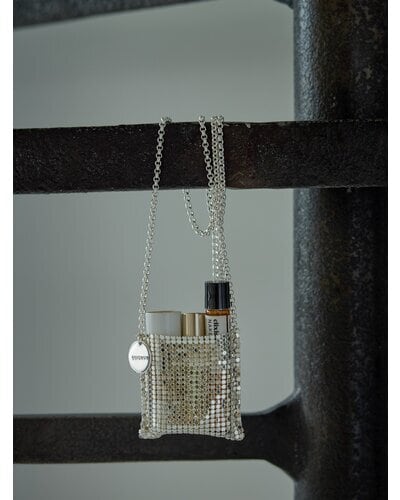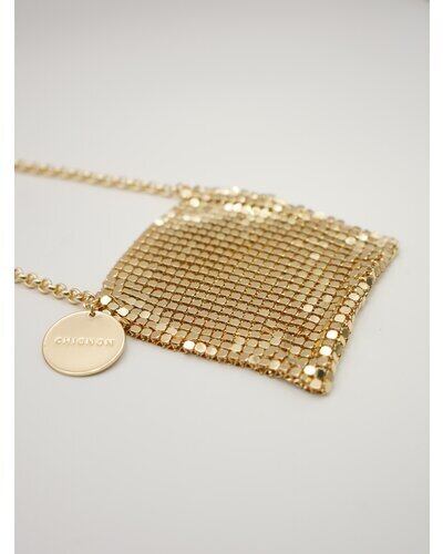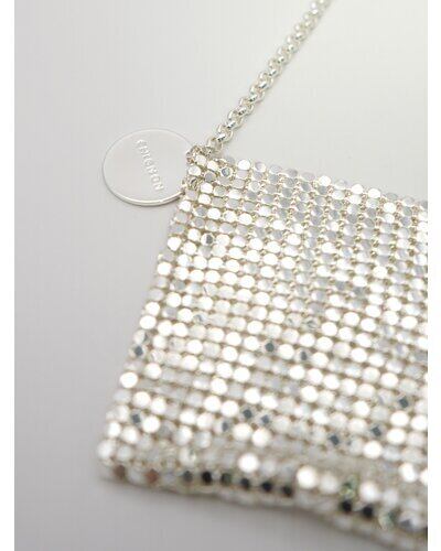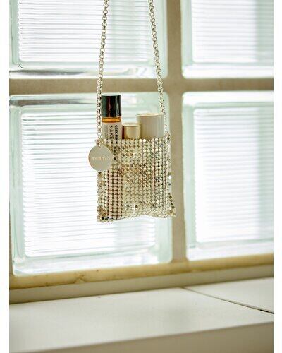小ぶりすぎるサイズ感が目を引くミニバッグはメタル素材の布を使用したアイキャッチなアイテムです。リップやロールオン香水、ネイルオイルなど細長いコスメアイテムを数本入れることが可能となっております。(ちょっとした小物やミントタブレットなども)着け方はショルダーにしたり首にかけたり手で持ったりと、シンプルなコーデのアクセントとしてアクセサリー感覚に愉しめるアイテムとなっております。丸プレートには「CHIGNON」の刻印入り。