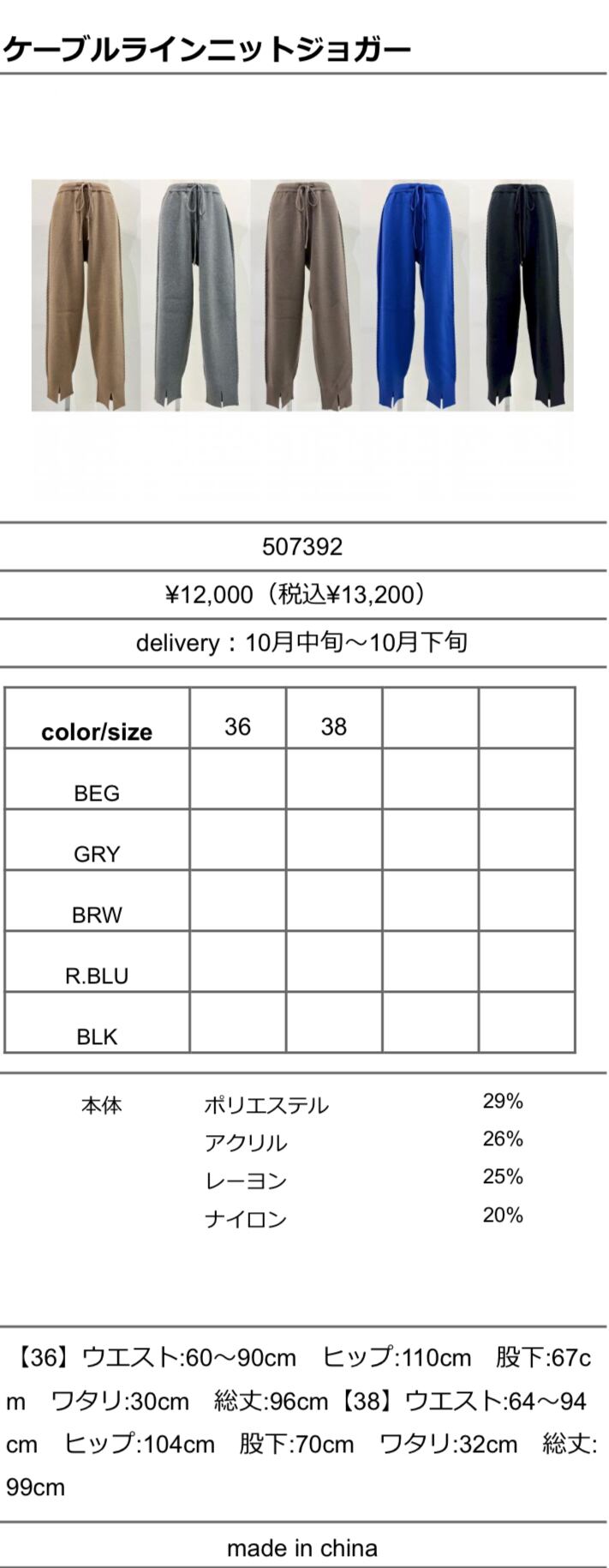 ヒップ:110cm 股下:67cm ワタリ:30cm 総丈:96cm
