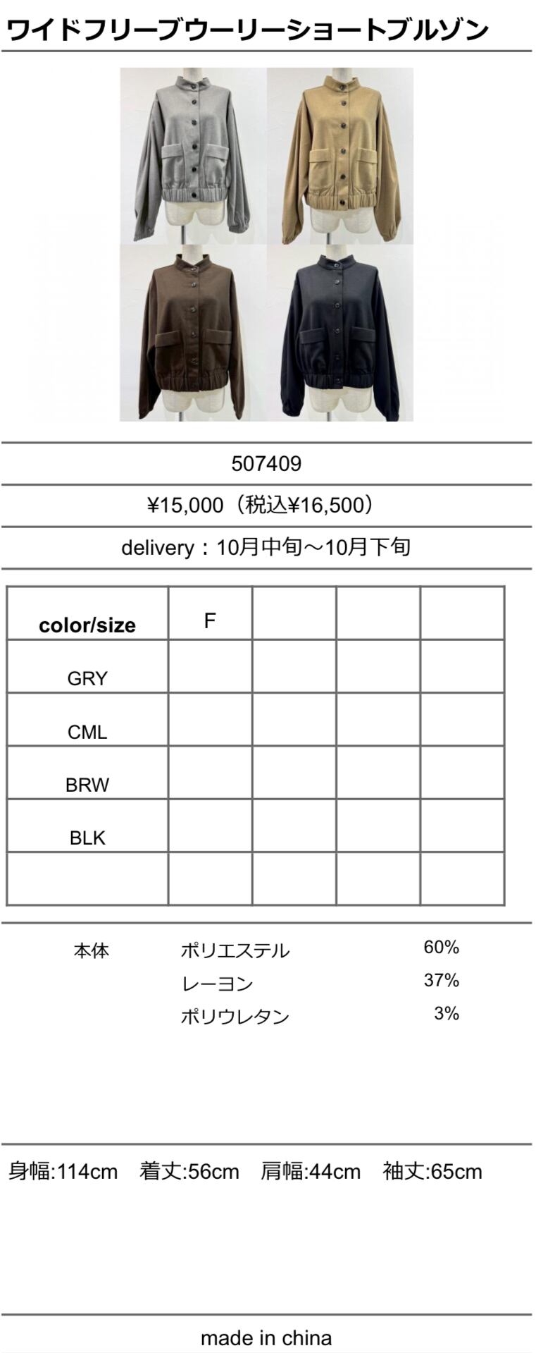 身幅:114cm 着丈:56cm 肩幅:44cm 袖丈:65cm