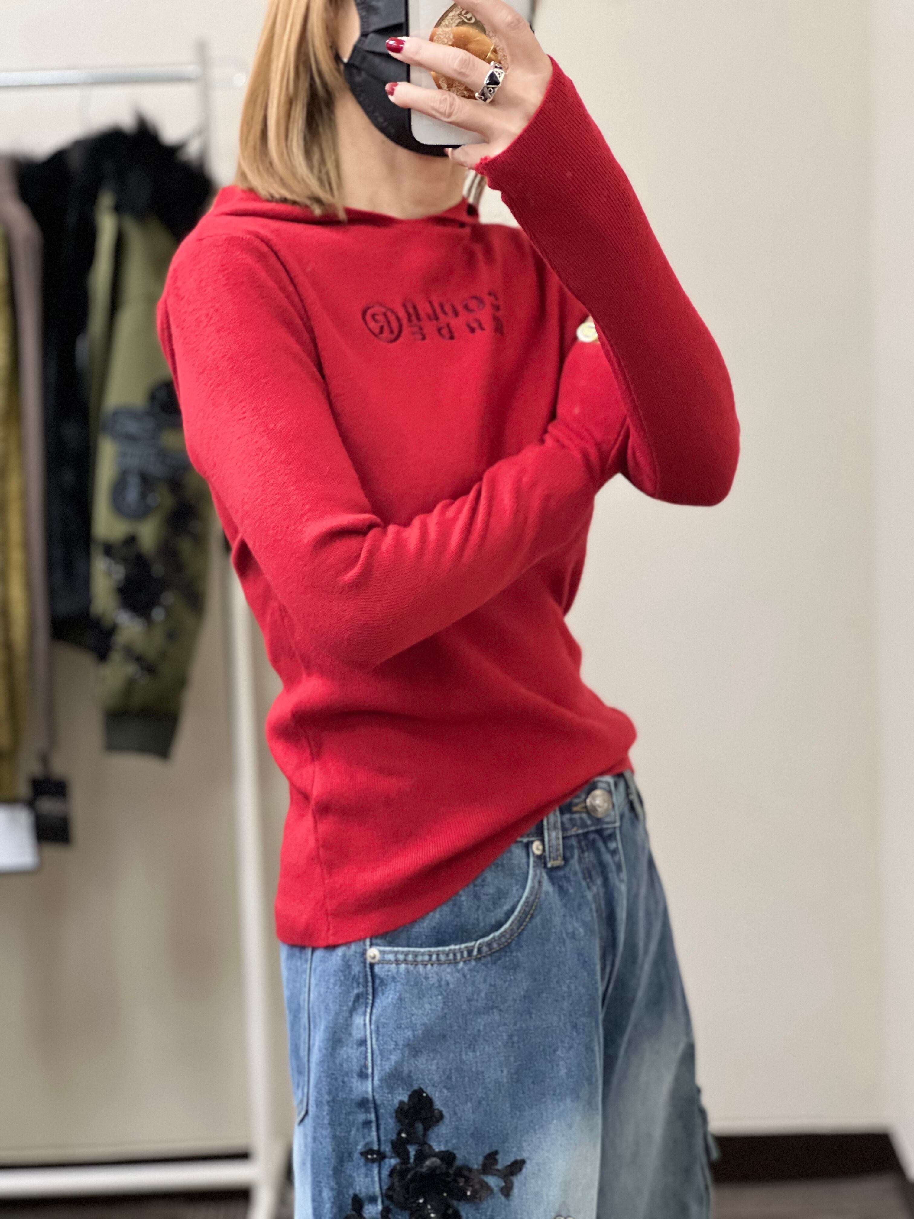 ・伸縮性のある柔らかな薄手のニットフーディー。