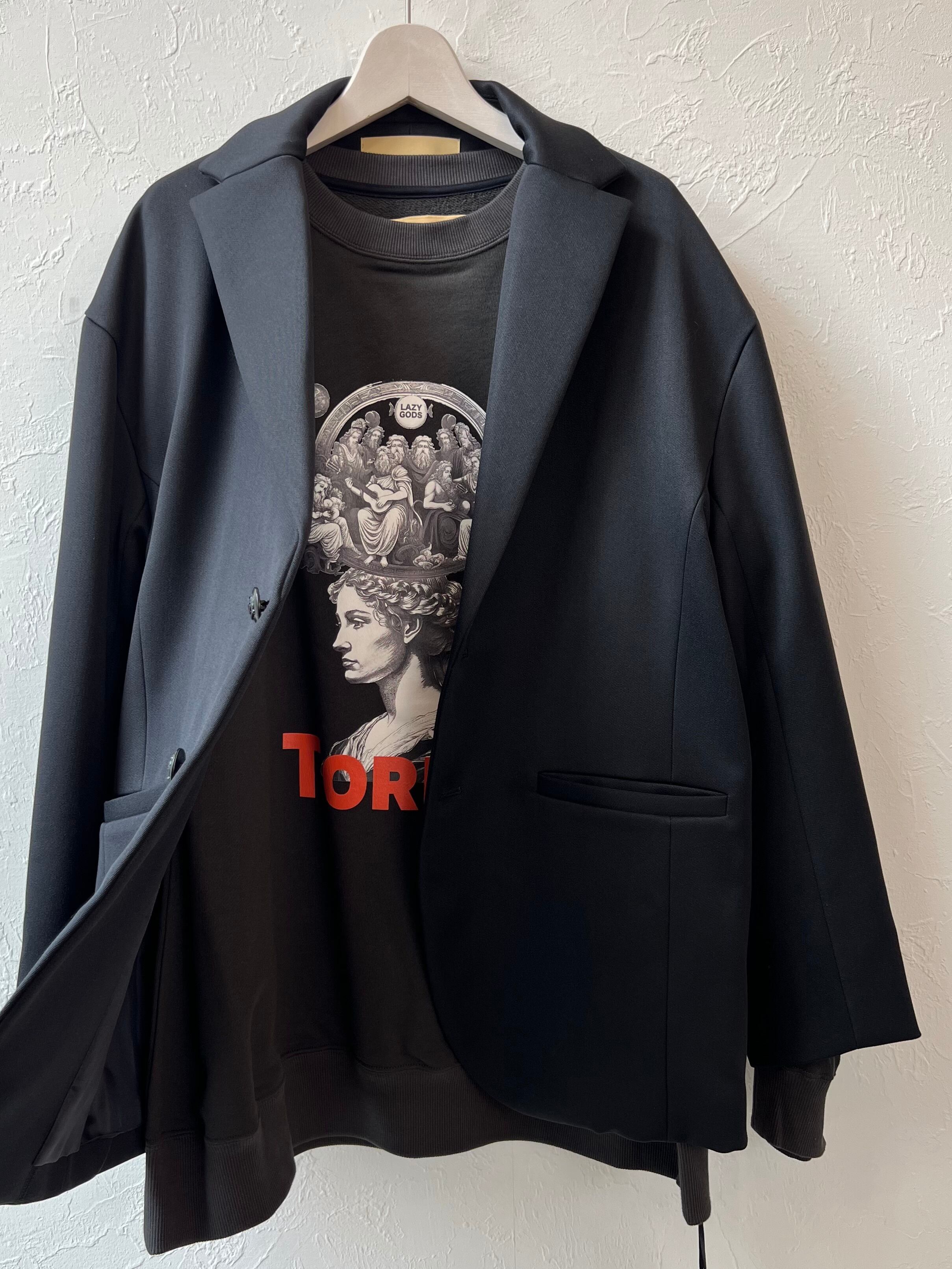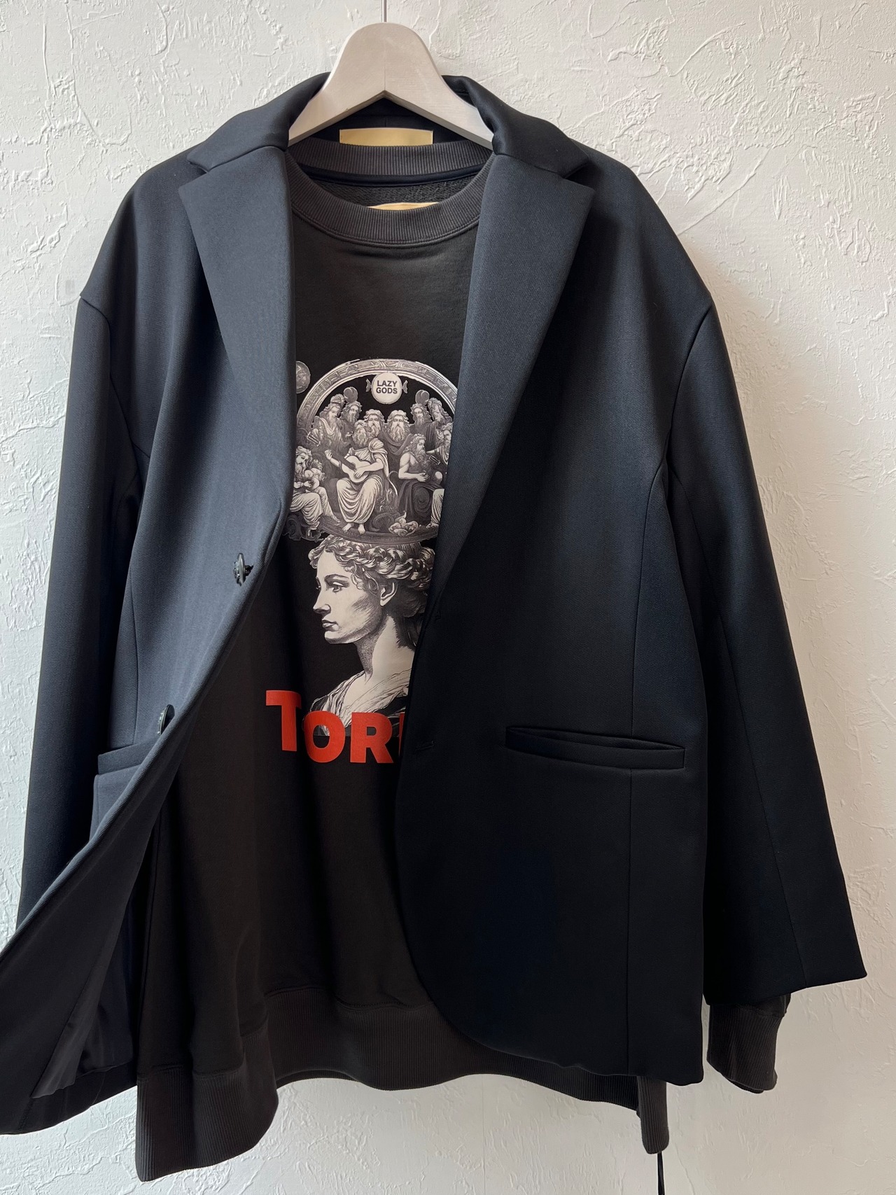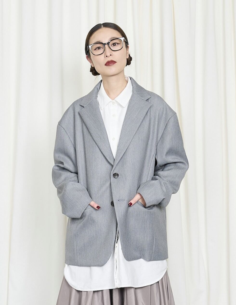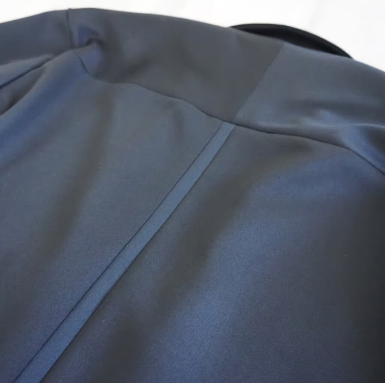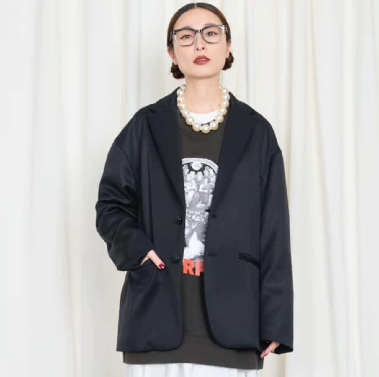 メンズサイズの肩幅が大きいオーバーサイズジャケット。今回は肩パッドを入れず、サラッとカジュアルに羽織れるタイプにしました。やや光沢のあるポリエステルレーヨンでストレッチ性が高いので、着心地が抜群によく、なだらかな肩ラインにしているので肩幅のあるナシに関係なく馴染むジャケットです。襟はやや広めでカジュアル、そして小顔効果あります。メンズのLからLL程度のサイズ感ですが、袖丈は長すぎず、女性に羽織りやすくしています。男性も176cmくらいの方までなら着やすいと思います。オーバーサイズで特に身頃が大きめなので、ヒップ周りが気になる方には特にお勧め。ヒップから少し裾が浮くのでヒップが小さく見える視覚効果があります。シンプルな単色で、装飾は今回はあまり入れずに作っています。背中中心のみ、細めのラインを入れて配色にしています。長く愛用でき、日常からオフィスカジュアルまで幅広く活用できそうです。肩肘を張らずにサラリと羽織れるジャケットは久しぶりに作ったのではないかと思いました。ポケットも玉ぶちにしていて、少しメンズライク。パンツスタイルにも、スカートスタイルにもシルエットが映えるジャケットだと思います。特にバルーンスカートに合わせるととても良いスタイルになり、気に入っています。どれか一つ、長く愛用するアイテムをお探しの方には非常にお勧めです。