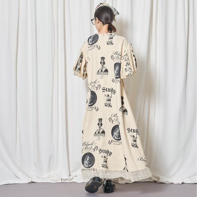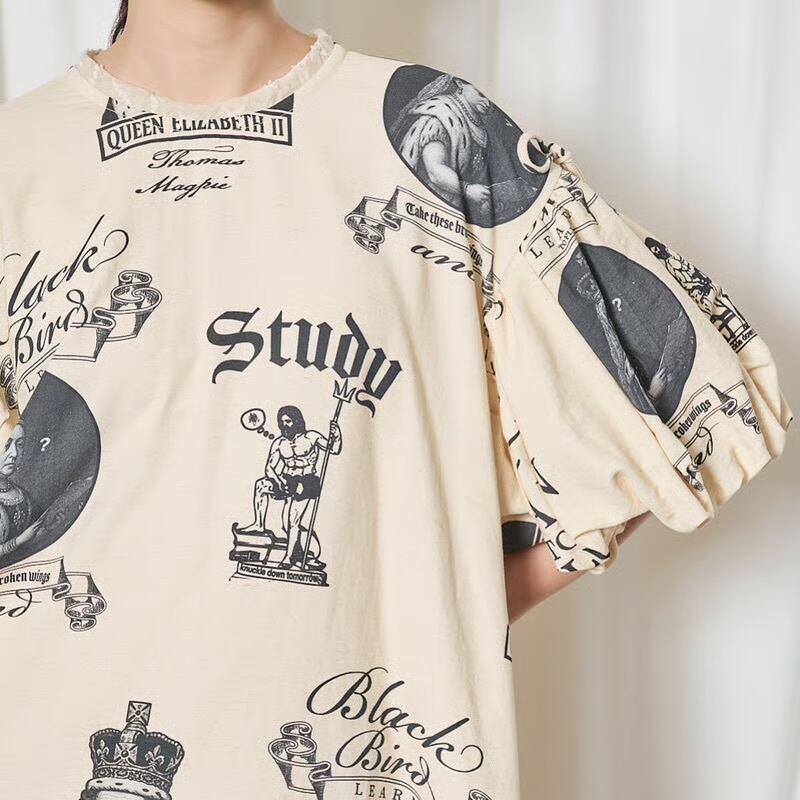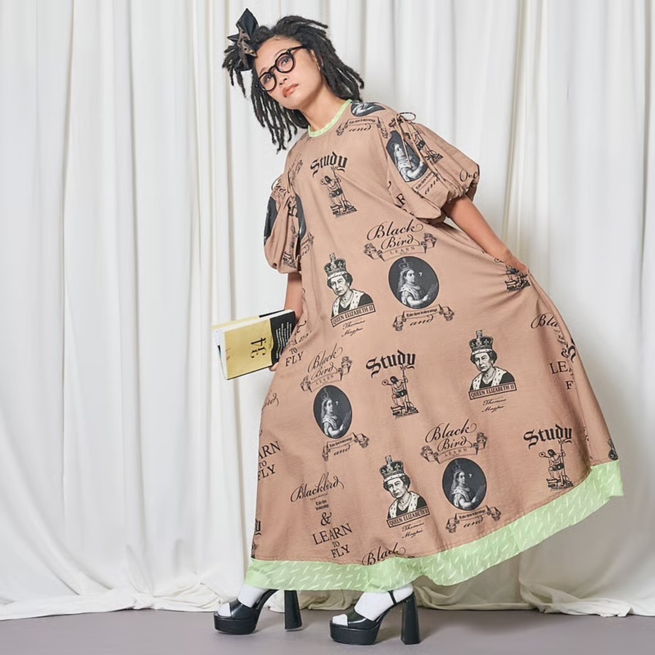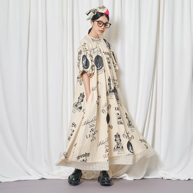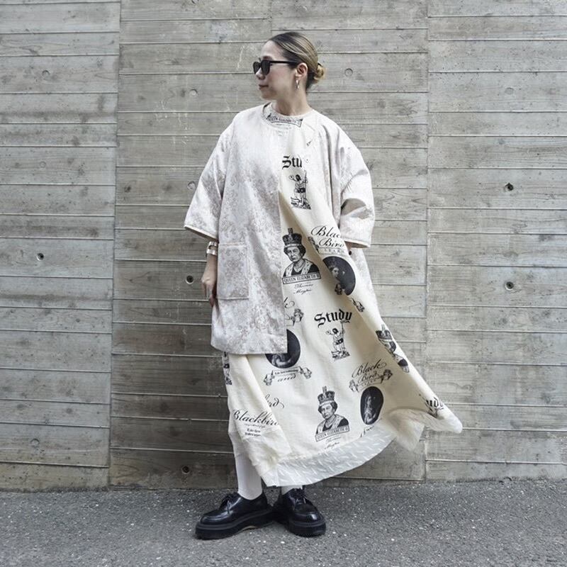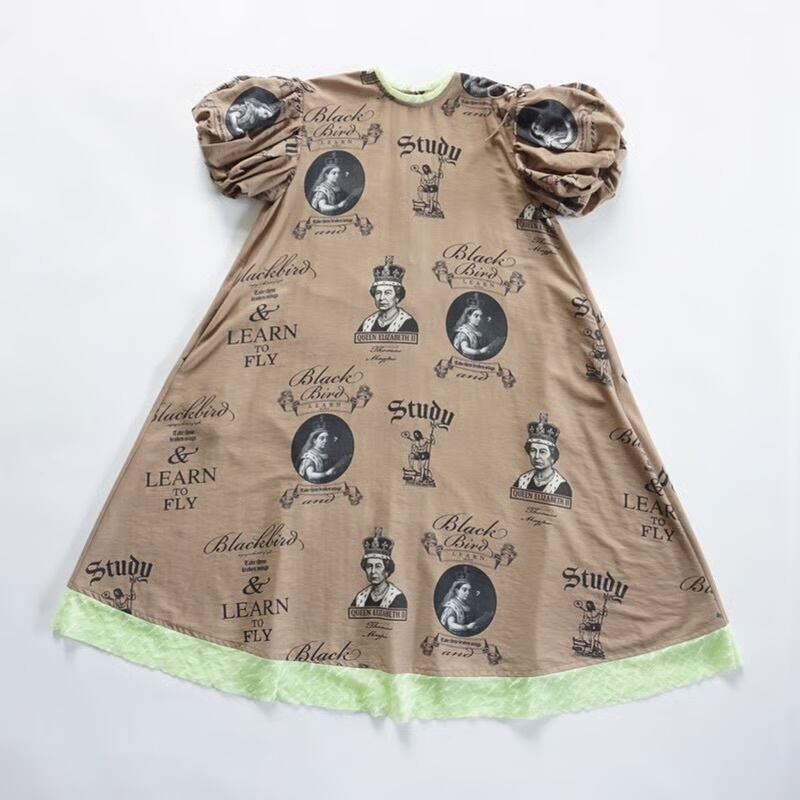オリジナルテキスタイルでは、リネンのような見え方のコットンリネンナイロンの混紡の素材にブラックで様々なプリントを入れてみました。そして、女性で女王として政治にも参加した歴史上の偉大な人物、憧れのヴィクトリア女王とエリザベス2世のイラストを作成してみました。二人共が70年ほど英国を治世した人物。特にヴィクトリア女王は19世紀にアートや産業革命など、発展に努め社会的基盤を築いた人物です。彼女等も沢山の疑問や知識を学びながら努力した事であろうと想像をしながら、このグラフィックを作りました。また、STUDYと描いたイラストは、勉強を頑張るのを先延ばしにするかどうしようかを考える男性です。努力するかどうかの葛藤のイメージ。