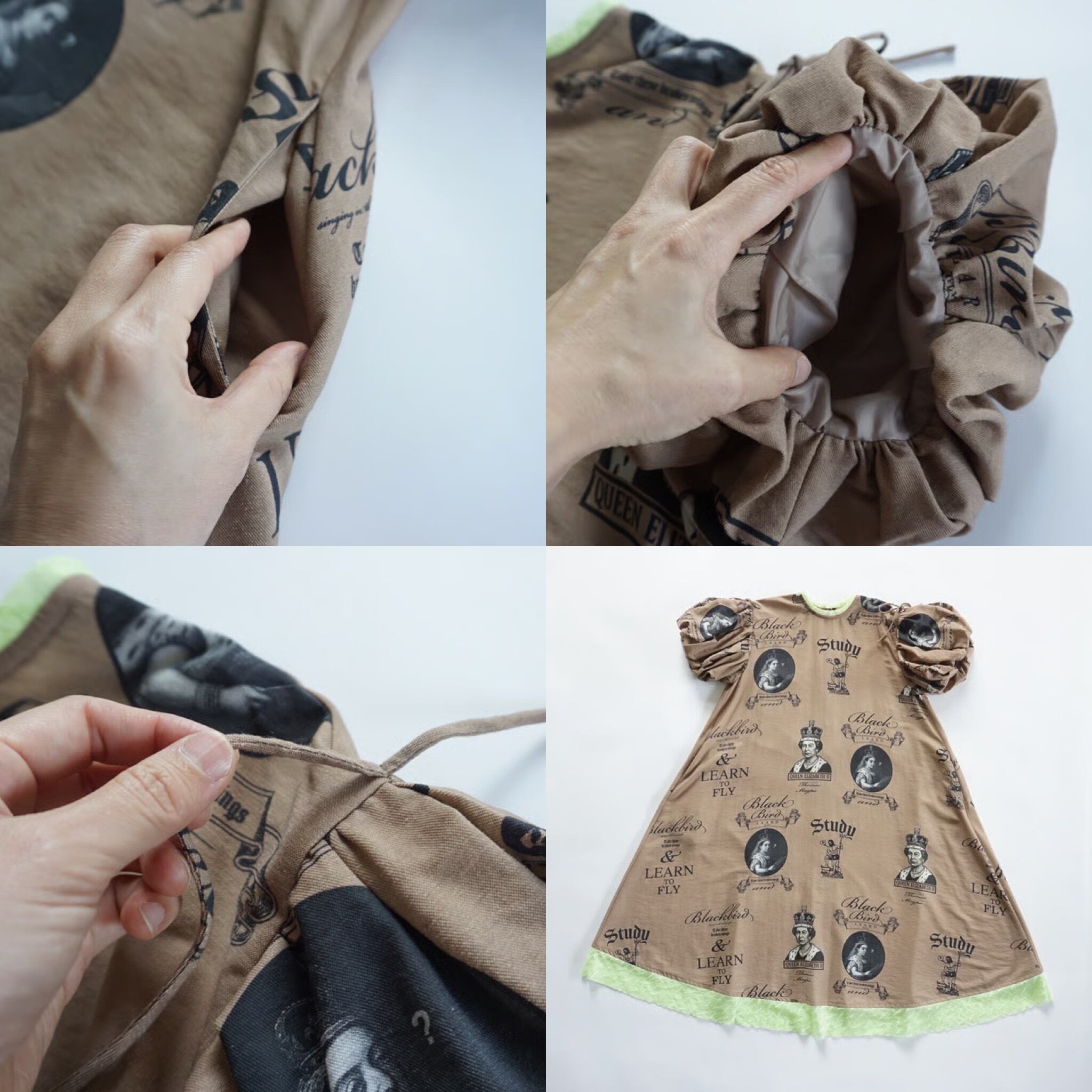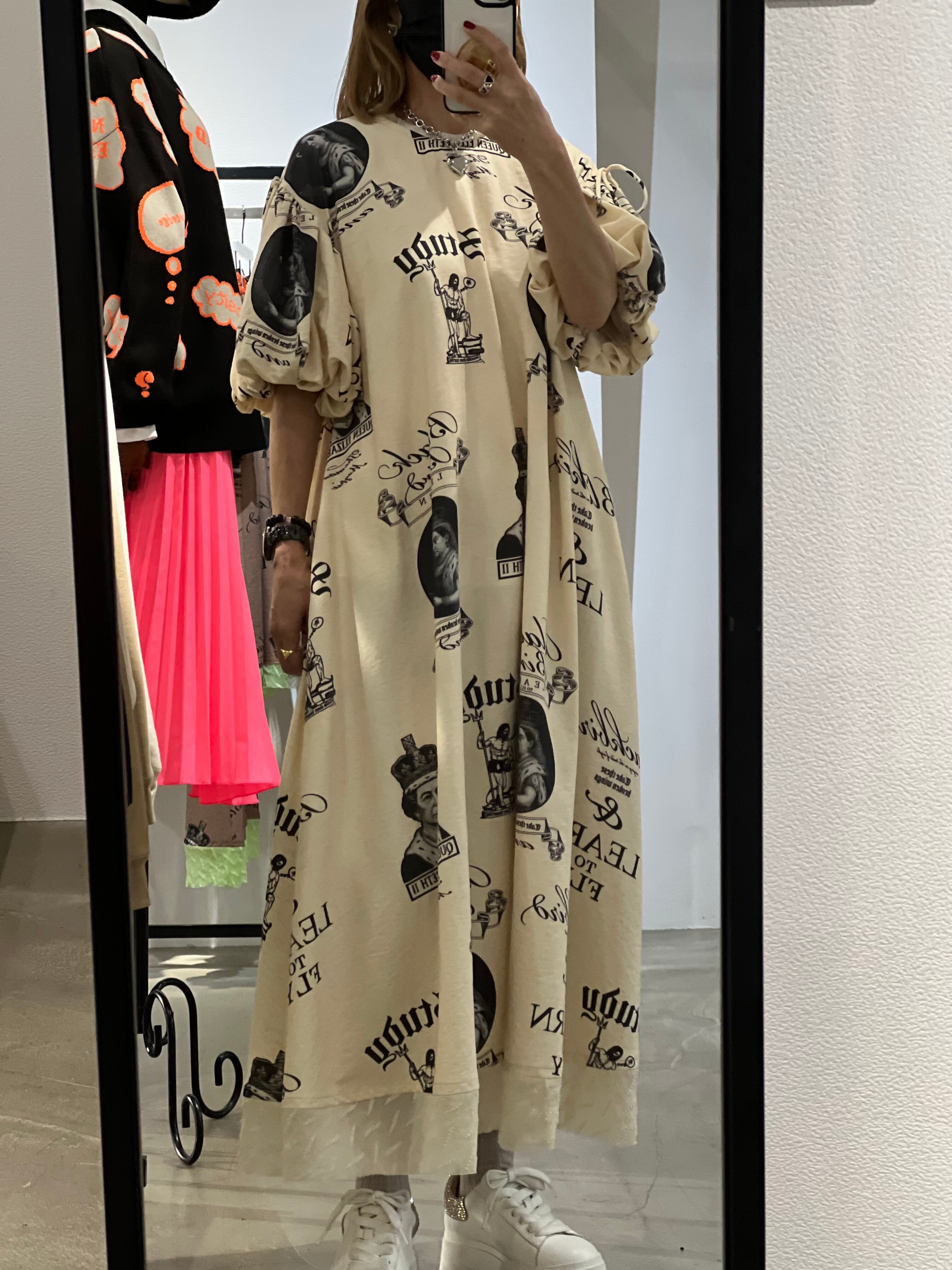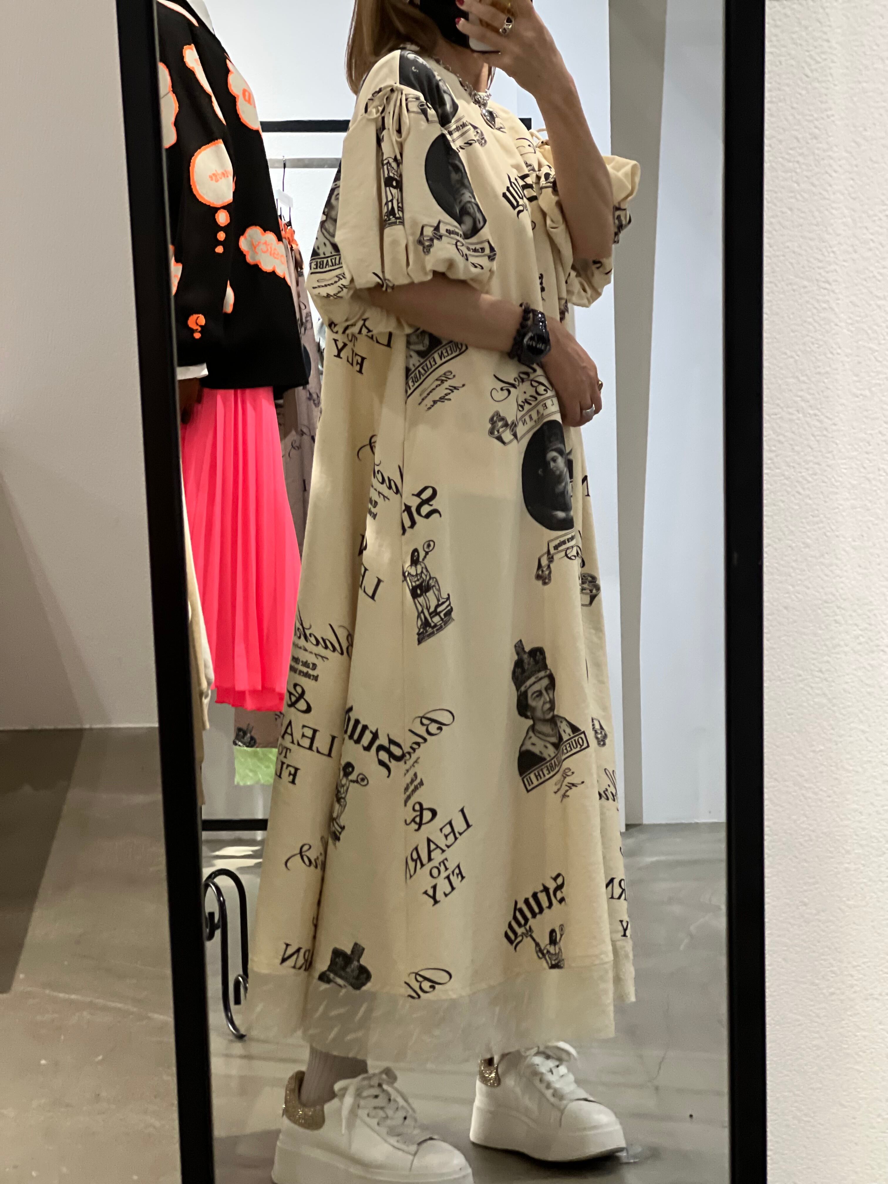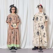 いくつかのグラフィックを点在させたテキスタイルでロングドレスを作ってみました。ワンサイズです。
