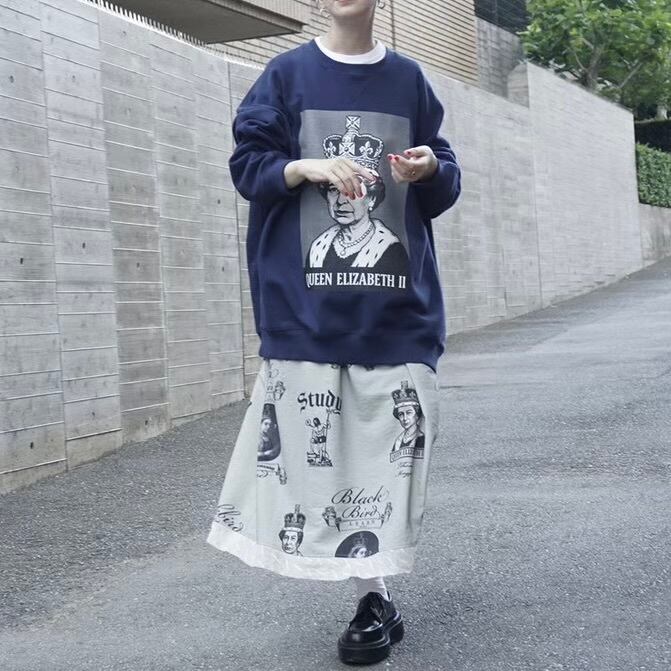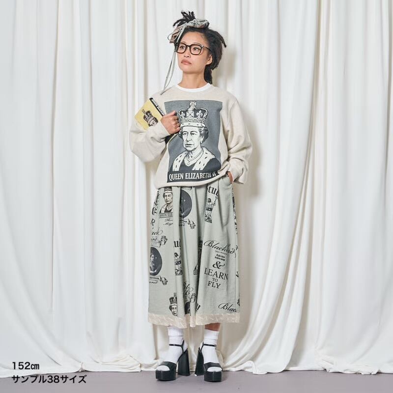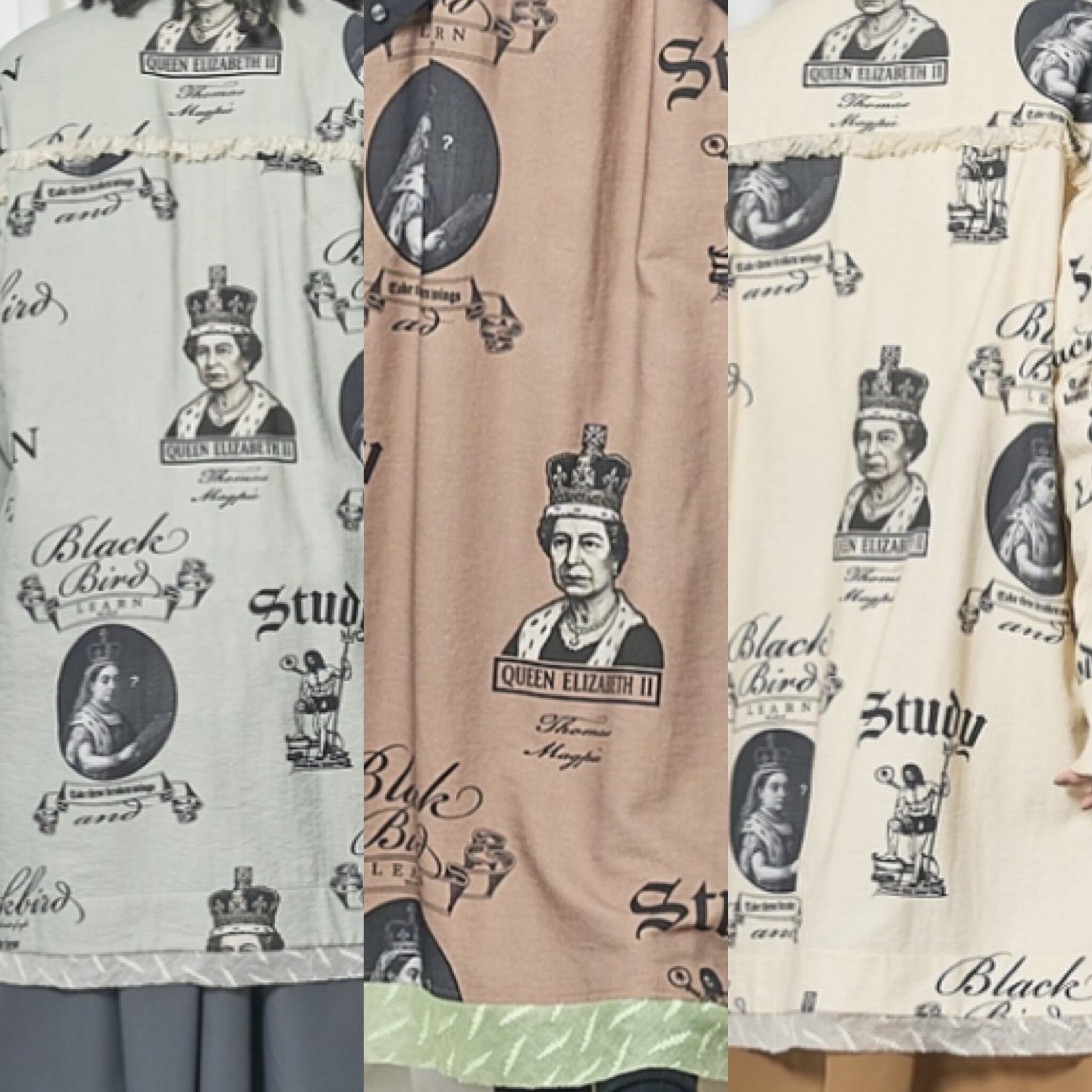 オリジナルテキスタイルでは、リネンのような見え方のコットンリネンナイロンの混紡の素材にブラックで様々なプリントを入れてみました。そして、女性で女王として政治にも参加した歴史上の偉大な人物、憧れのヴィクトリア女王とエリザベス2世のイラストを作成してみました。二人共が70年ほど英国を治世した人物。特にヴィクトリア女王は19世紀にアートや産業革命など、発展に努め社会的基盤を築いた人物です。彼女等も沢山の疑問や知識を学びながら努力した事であろうと想像をしながら、このグラフィックを作りました。また、STUDYと描いたイラストは、勉強を頑張るのを先延ばしにするかどうしようかを考える男性です。努力するかどうかの葛藤のイメージ。