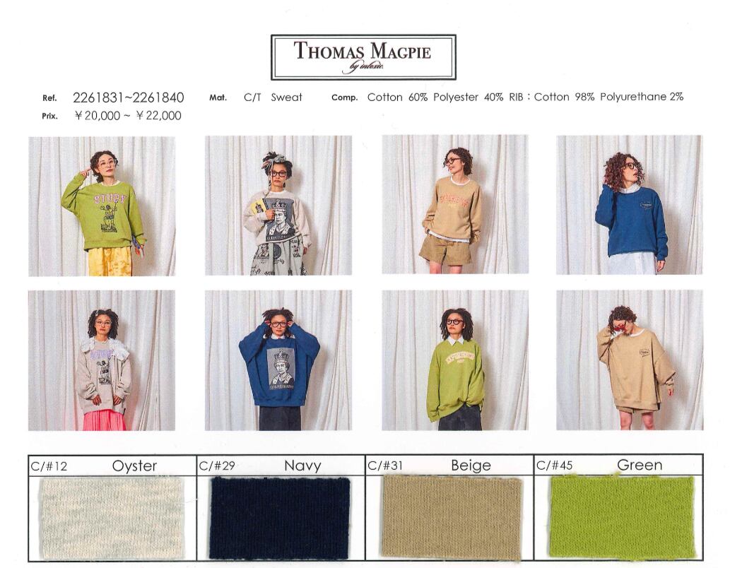耐久性があり、長くずっと着る事ができる素材にしています。トーマスマグパイのスウェットは長年定評があり、コレクションのアイテムの中でも非常に人気の販売シェア率を誇っています。首周りは、今回、大きめ。インナーにTシャツや、襟付きのシャツなどを入れるとバランスが良くなります。私はクルーネックのスウェットには、シャツかTシャツを入れるのを好みます。これまで何度もビッグサイズ(メンズのXL程度)のサイズを数シーズン展開してきましたが、久しぶりにやや小さめビッグシルエットも着たくなり、リリースしました。