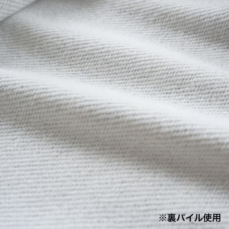 生地は裏毛(パイル地)春秋冬に向いているオールマイティな素材にしました。ビッグサイズのスウェットと同じ素材を使用しています。裏毛(パイル地)でコットンポリエステルの混紡なので、コットン100よりも伸びが良く軽くて膨らみがあります。