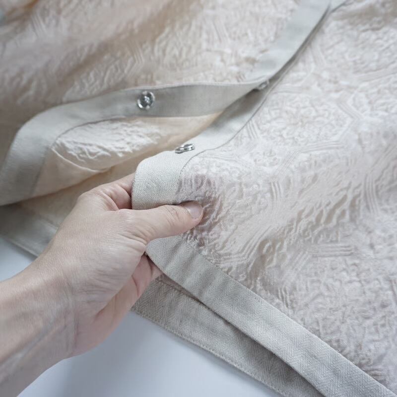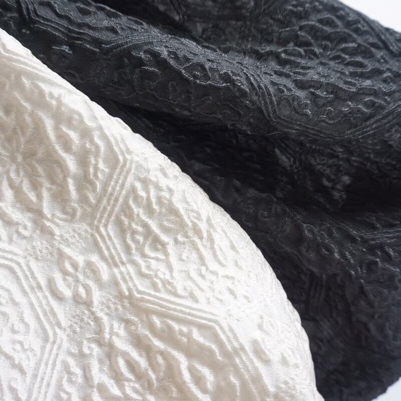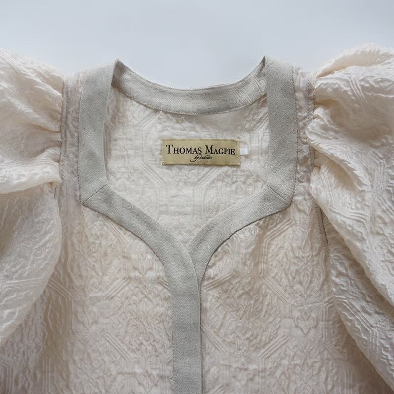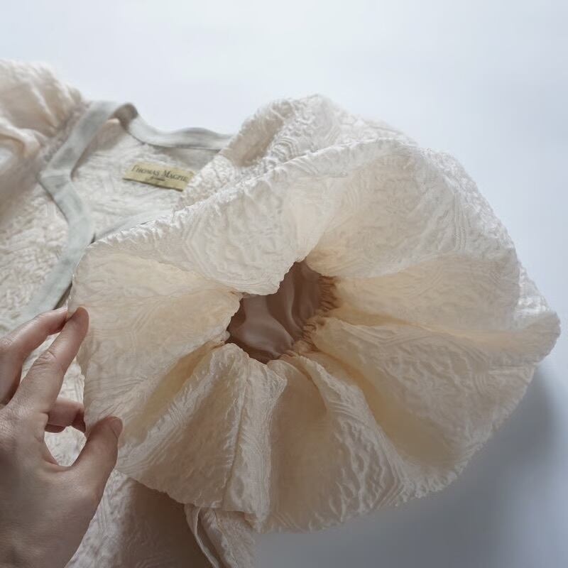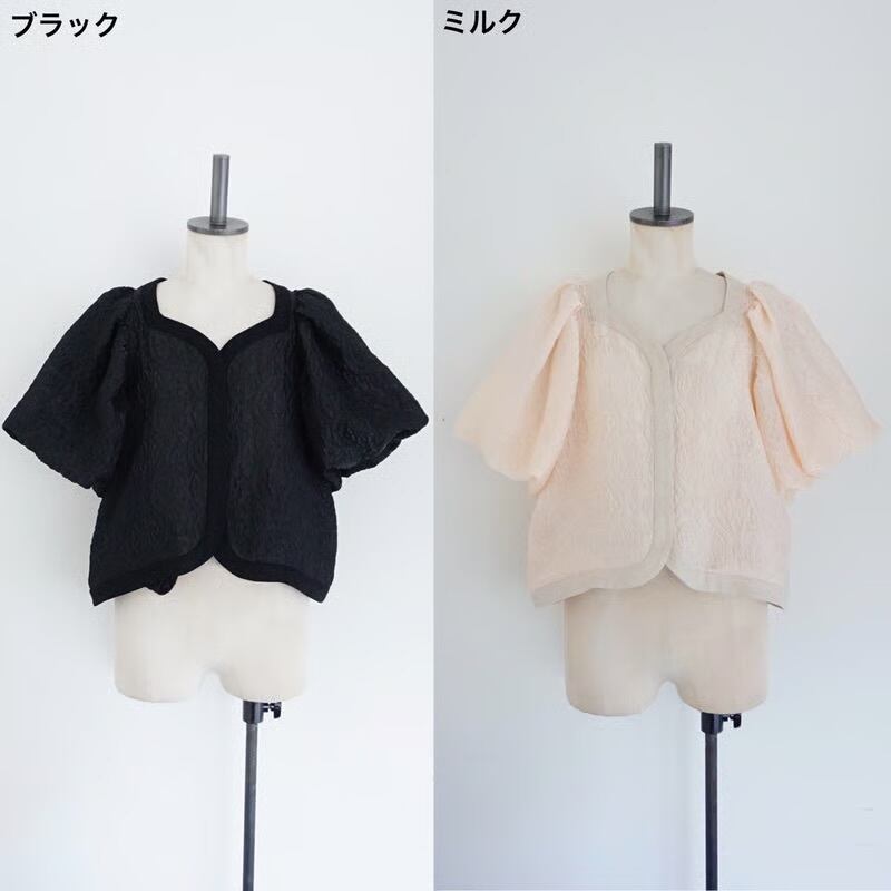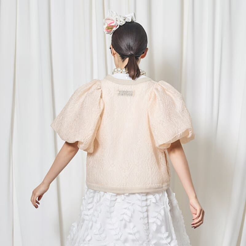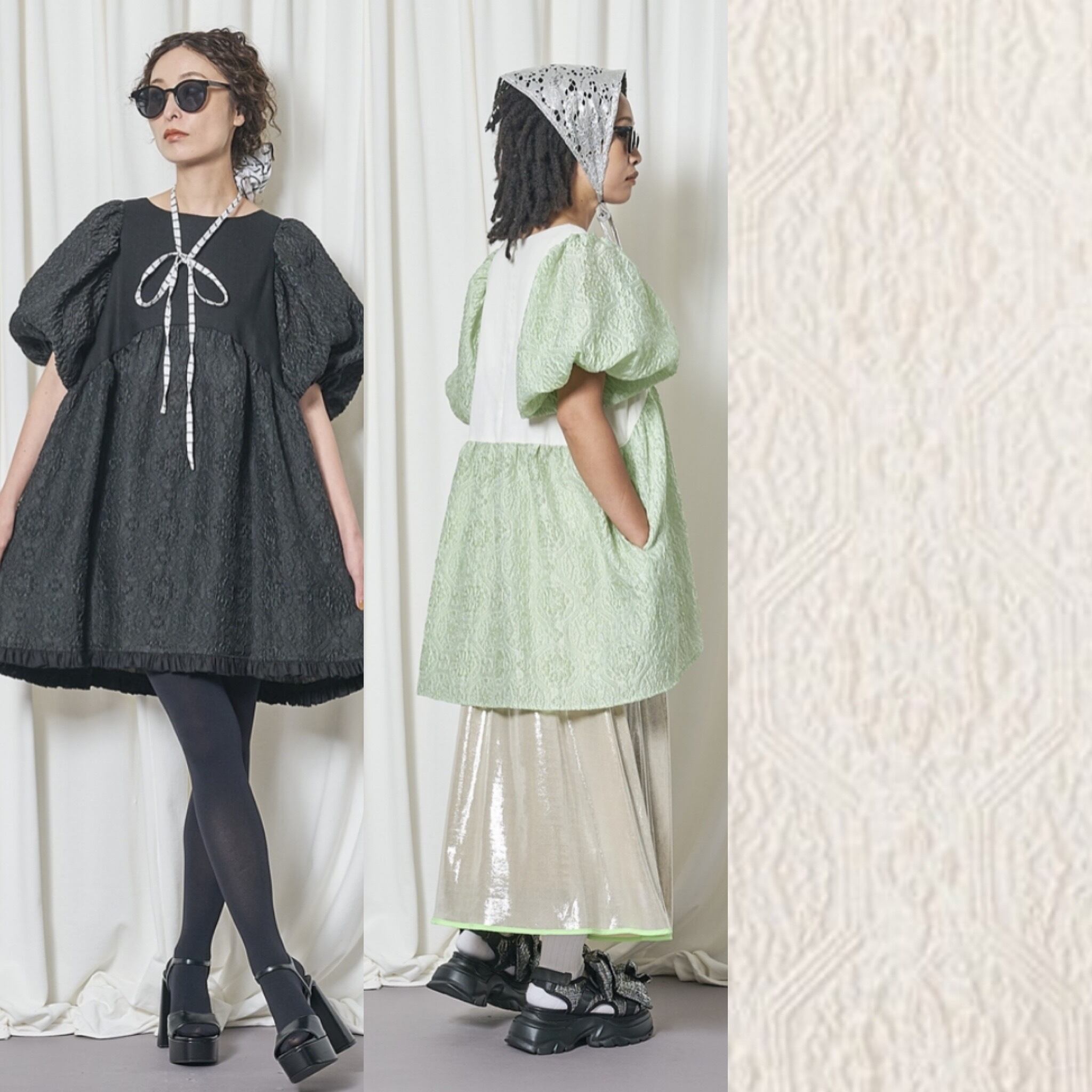 今回、ちょっと変わったジャケットをデザインしました。今までにないエンボス加工のシアー素材で、半袖パフスリーブのボレロ型ジャケットです。袖の膨らみのパターンと、ハリ感のある素材がベストマッチで、フワッと広がるパフスリーブ。このパフ具合の出来上がりはとても不安で仕方ありませんでしたが、パタンナーが可愛いシルエットに仕上げてくれました。とにかく気に入ったデザインで、オリジナリティのあるシルエットに仕上がっていると思います。ミニジャケットながら、両サイドにスラッシュポケット付きで、とにかく可愛いなと思います。