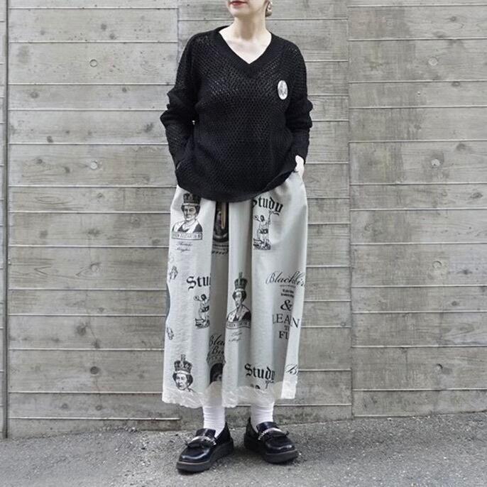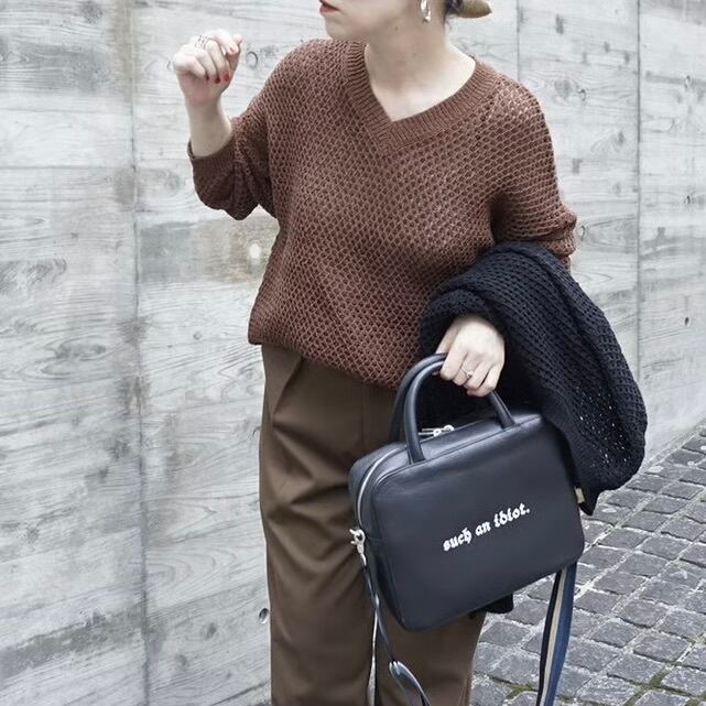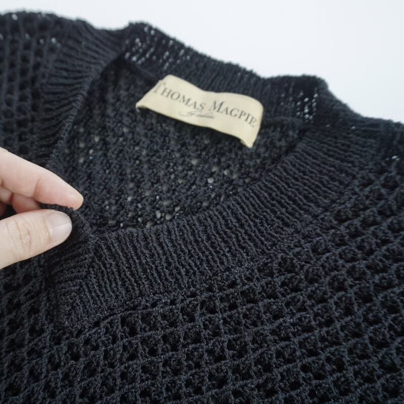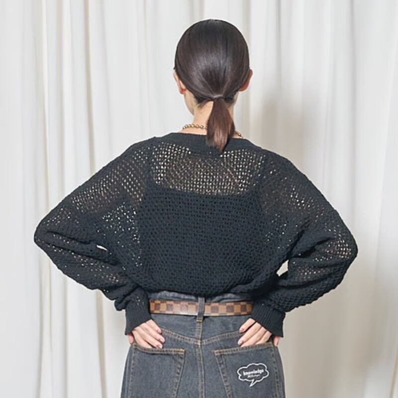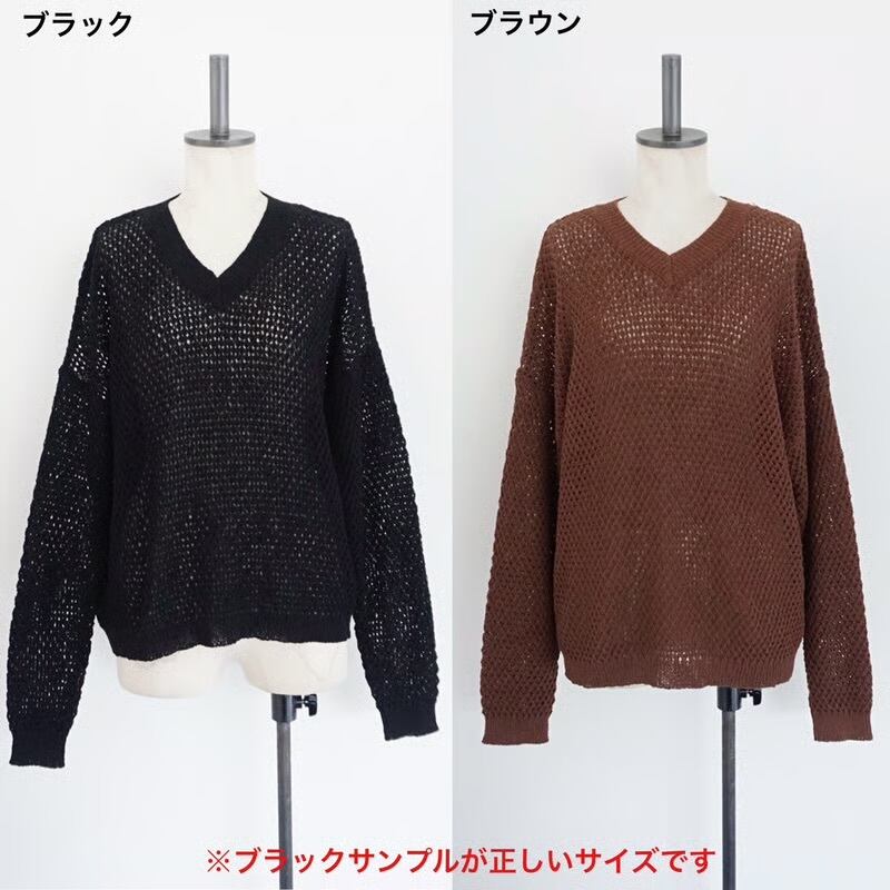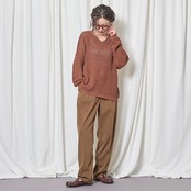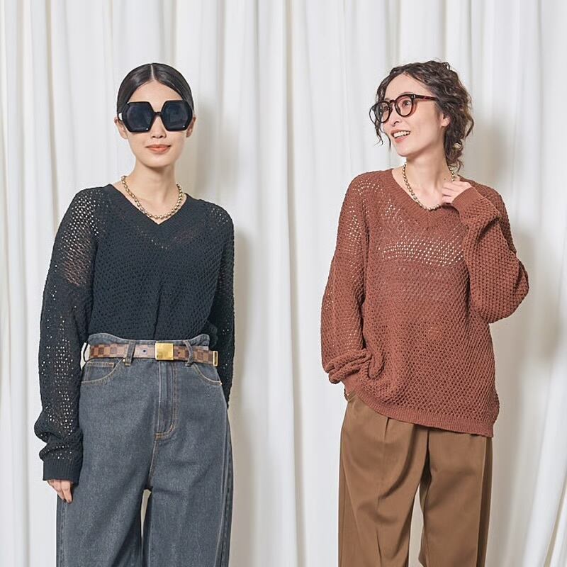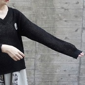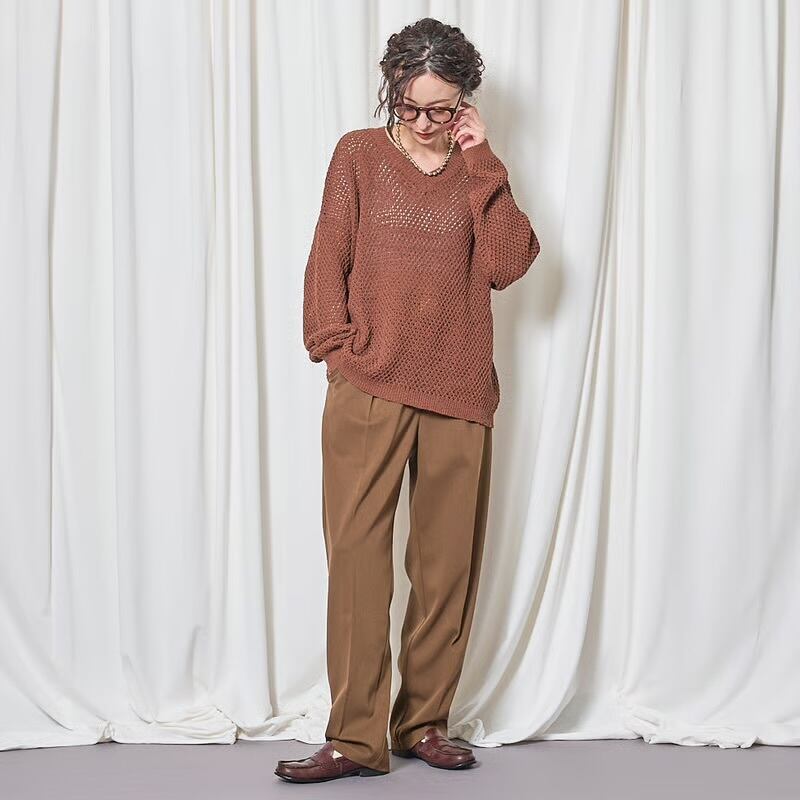 シアーなウエアは流行していますが、このニットは透けすぎず、上品に着られるのがポイントです。ざっくりしたドライタッチの糸です。今回は少し大人っぽい雰囲気も取り入れようかと思いVネックにしてみました、開き過ぎない、胸元のセクシーさを感じさせないV の開き方にしています。袖はやや長めで、身頃は大きめ、袖は普通のサイズ感なので、女性らしいシルエットがかないます。いつもなら、袖底を下げてオーバーサイズにするところを、今回は女性サイズにしています。シンプルだからこそ着回しがしやすいです。私のディレクションするウエアは、あまり他でない物を作って表現していきたいと考えていますが、普通にあると便利で、派手なデザインとの着回しに便利なシンプルなデザインも時に取り入れています。このニットは単色で無個性ではありますが、かなり着回しが効くので重宝する、とスタッフにとても人気のニットでした。実際に試着したところ、夏に非常に着やすくて、とても涼しくて万能でした。2万以下であるプライスも魅力ですが、真夏にあると1番に使えるものになるかもしれません。