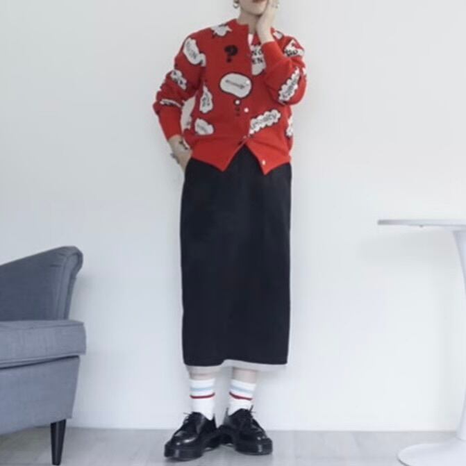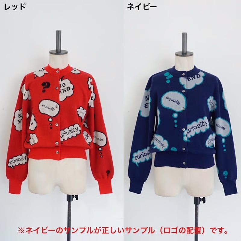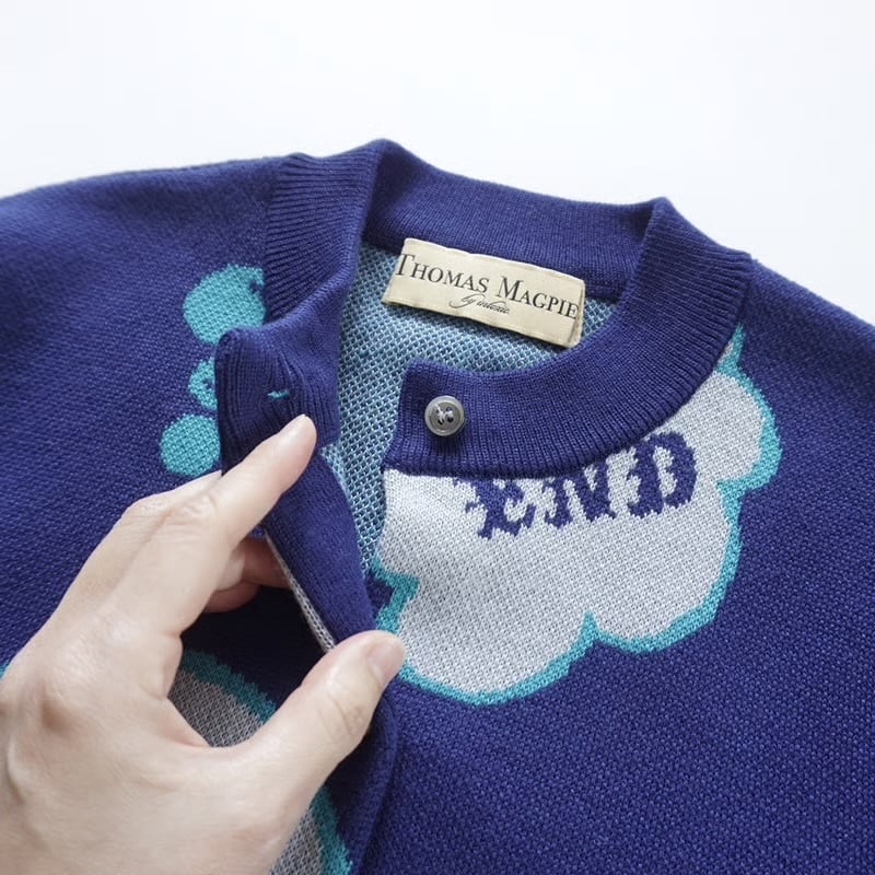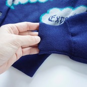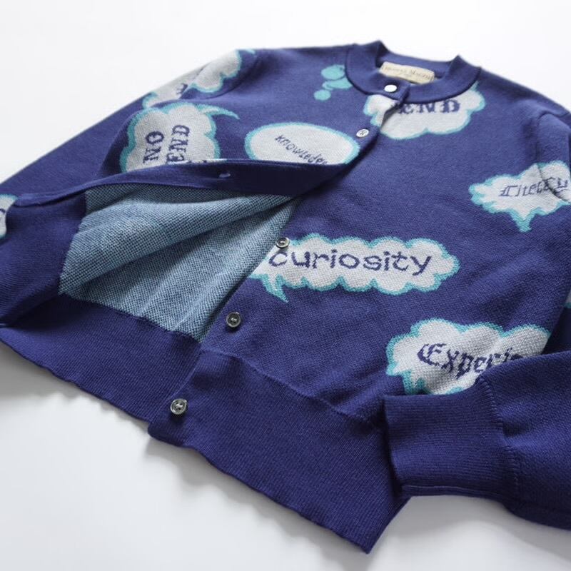 BOOK、NO END、CURIOSITY(終わりなき好奇心)、KNOWLEDGE(知識)、EXPERIENCE(経験)❓(クエスチョン)、INTERESTED(興味)、LITERACY(特定の知識と能力、リテラシー)、BRAIN(脳)などを手描きで柄にして入れています。今、私自身が非常に大切にしていることです。人生において、少しずついろいろな知識に触れる事と経験が大切だと実感しています。勤勉で真面目さが大切であると思います。元来怠け者である自分に必要なものであるとも思っています。自分に何度も言い聞かせながら着ていきたいニット。