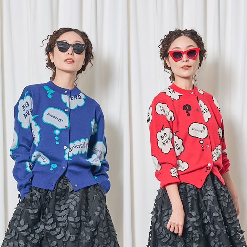 ニットのデザインは自由度が高くとても好きです。今回も個性だけでいきたいなと手書きの文字でニットを作っています。今回のコレクションテーマ、’’知的好奇心の探究’’に沿った好きなワードを入れています。