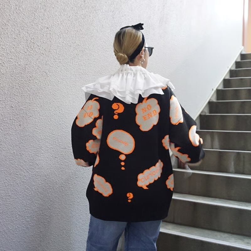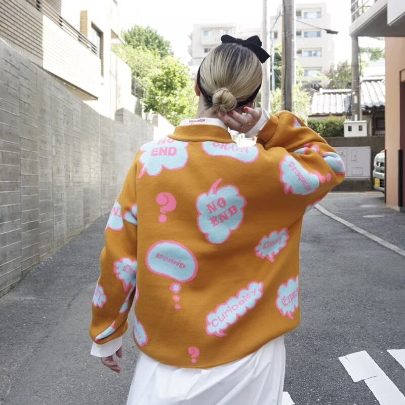 BOOK、NO END、CURIOSITY(終わりなき好奇心)、KNOWLEDGE(知識)、EXPERIENCE(経験)❓(クエスチョン)、INTERESTED(興味)、LITERACY(特定の知識と能力、リテラシー)、BRAIN(脳)などを手描きで柄にして入れています。今、私自身が非常に大切にしていることです。人生において、少しずついろいろな知識に触れる事と経験が大切だと実感しています。勤勉で真面目さが大切であると思います。元来怠け者である自分に必要なものであるとも思っています。自分に何度も言い聞かせながら着ていきたいニット。